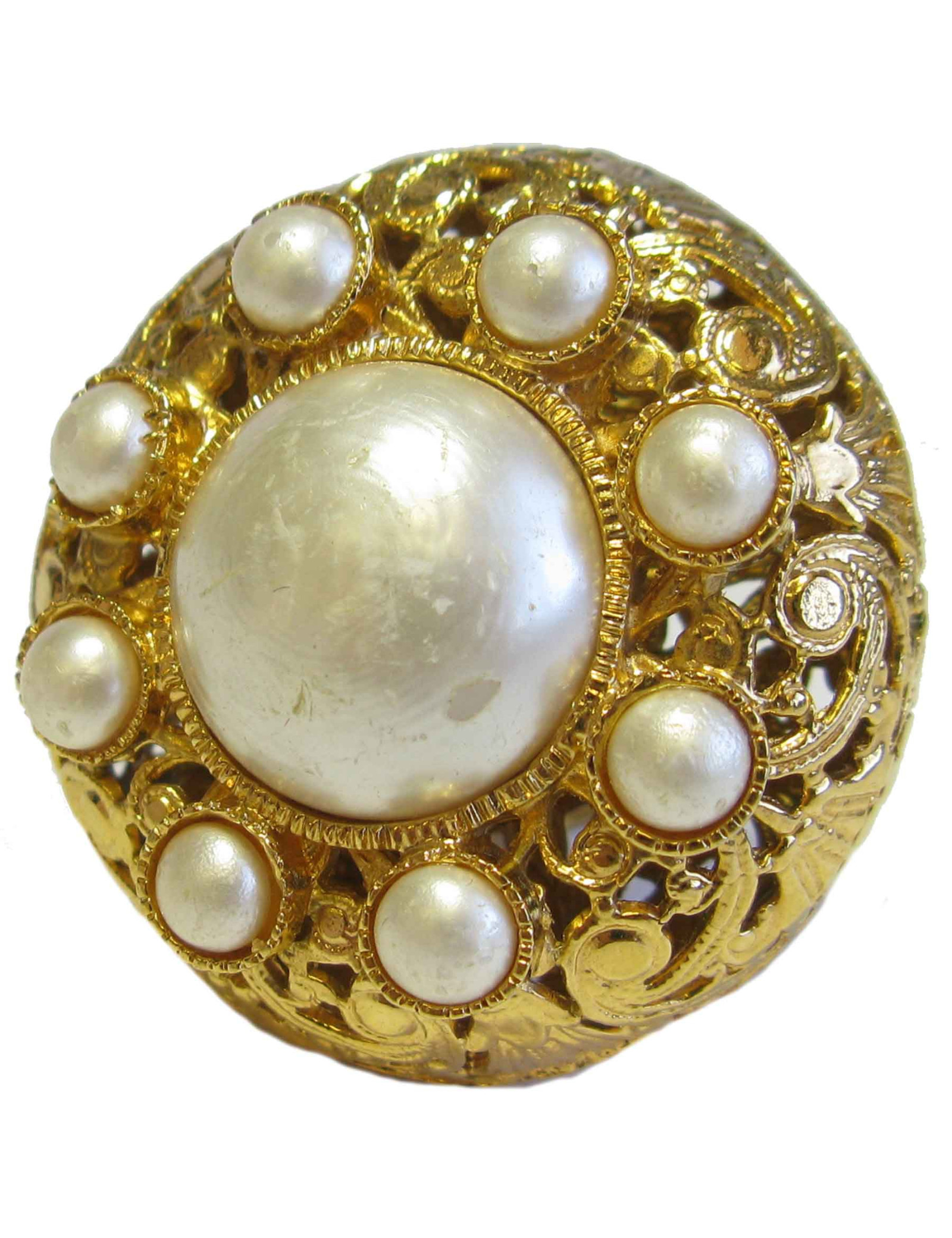 Boucles d'oreilles clips Chanel vintage en métal doré filigrané, des perles nacrées rehaussent ces magnifiques bijoux.