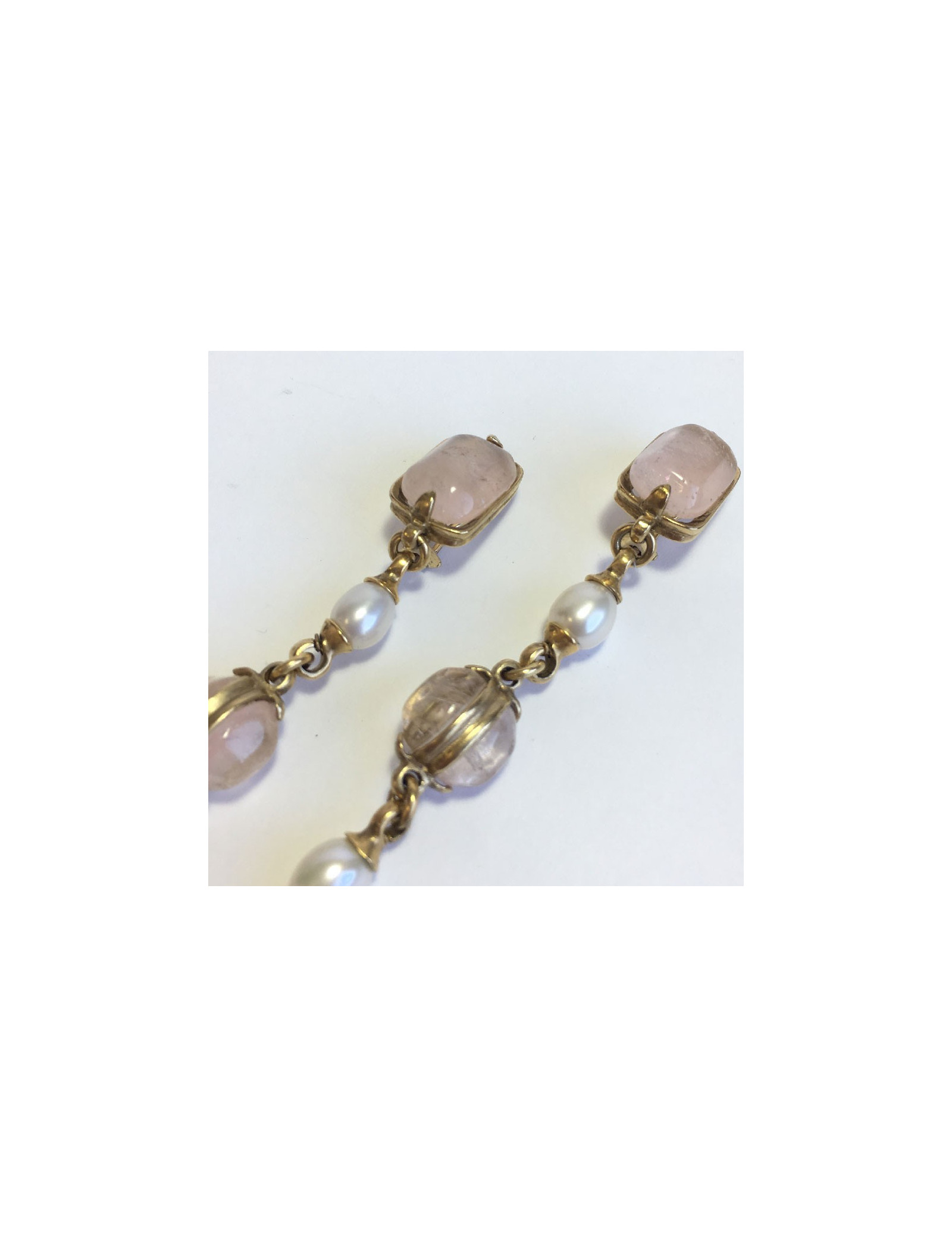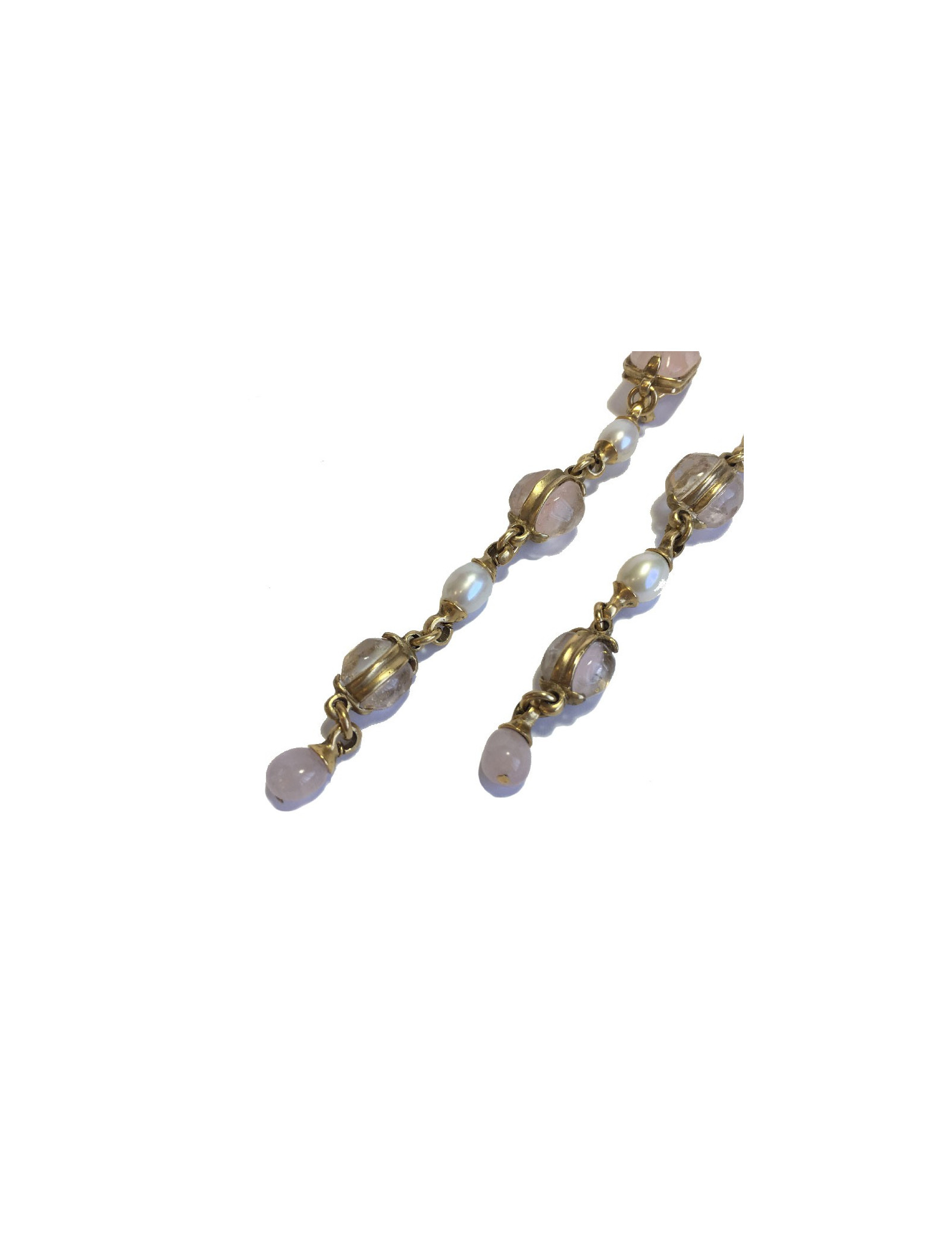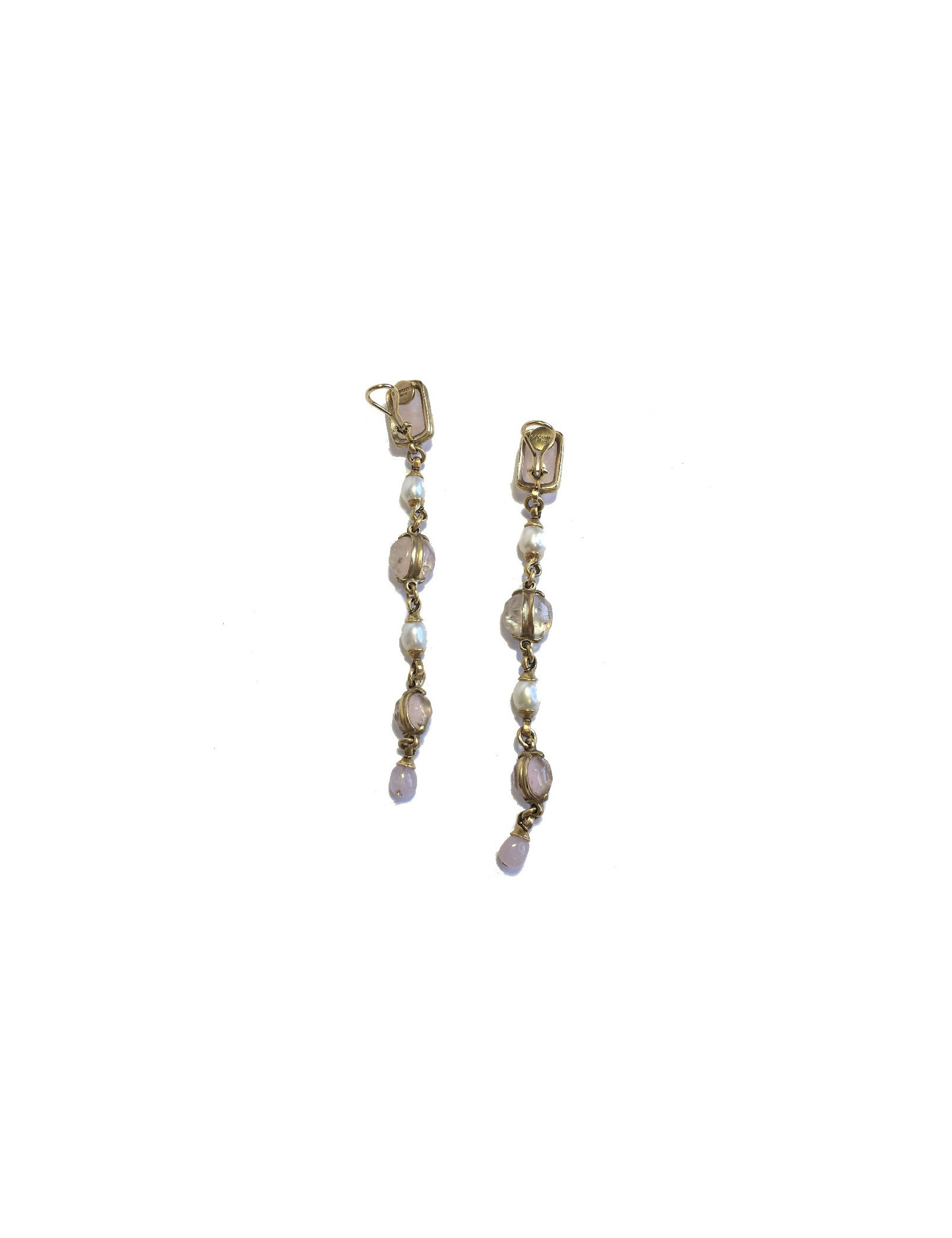 Sold EARRINGS CHANEL Couture Vintage pearl clip-on earrings CHANEL 33419 800.00 € CHANEL Couture Vintage pearl clip-on earrings Condition : very goodMade in FranceModel : clip-on earringsMaterials : metal, pearly beadsColor : mother-of-pearlHardware: goldMeasurements : Diameter 2,5 cmDetails : in the center a pearly half-pearl, surrounded by two interlaced stirred chains View