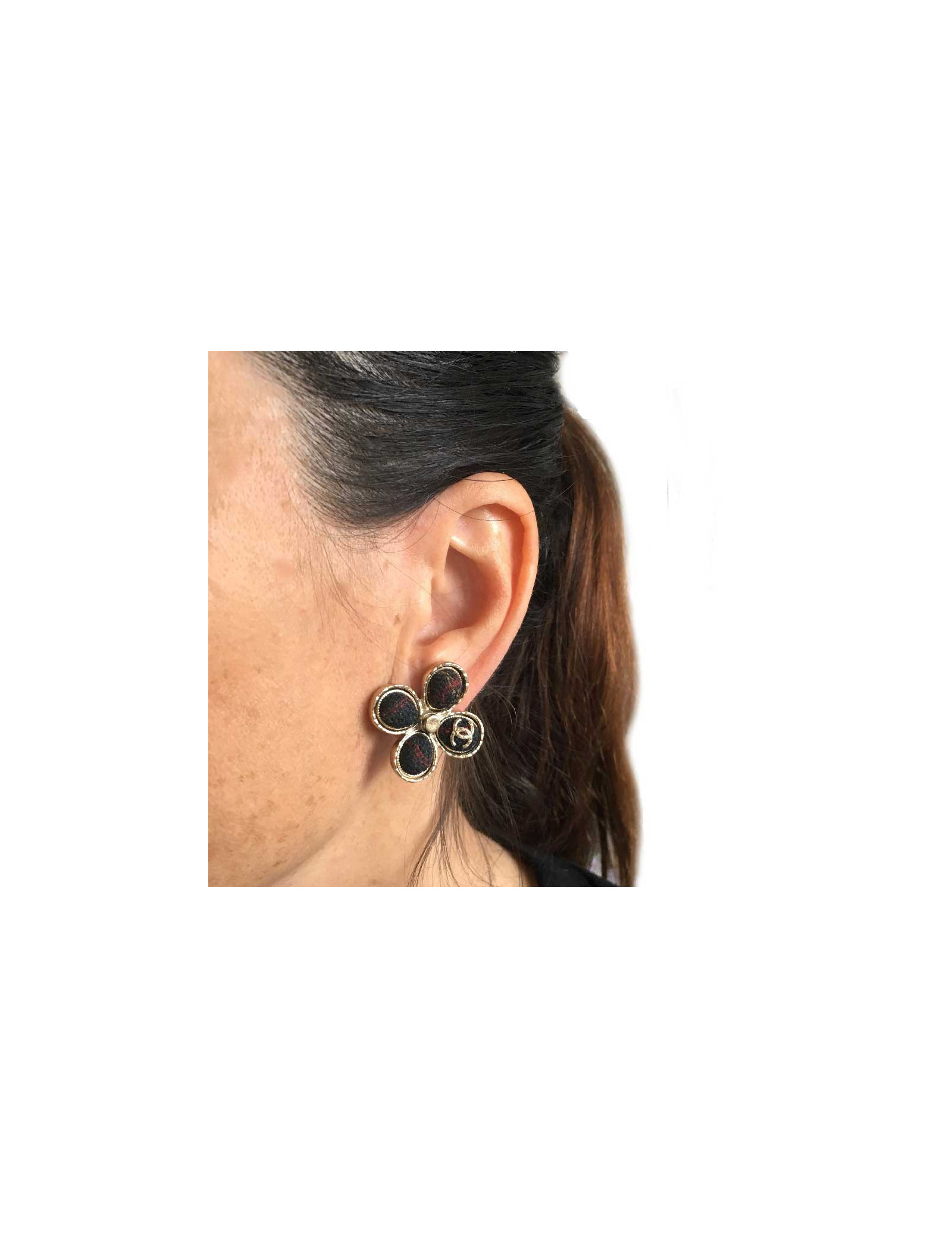 Chanel clover stud earrings 'Paris Edinburgh' in gilt metal and multicolored tweed predominantly red.