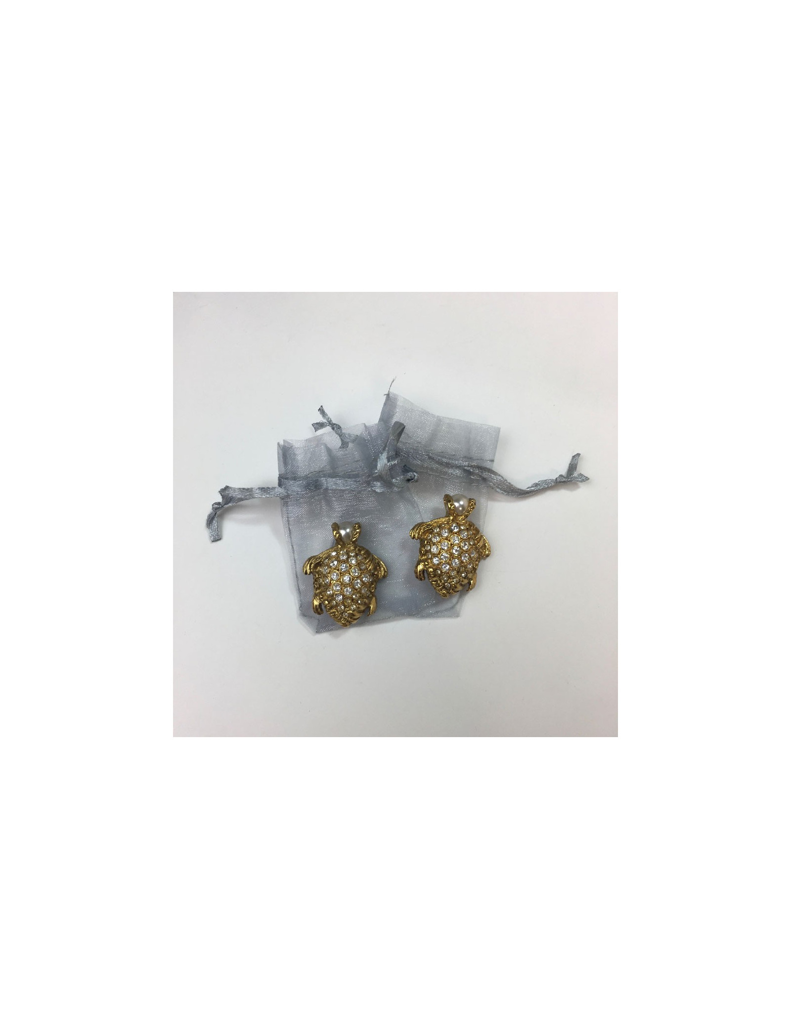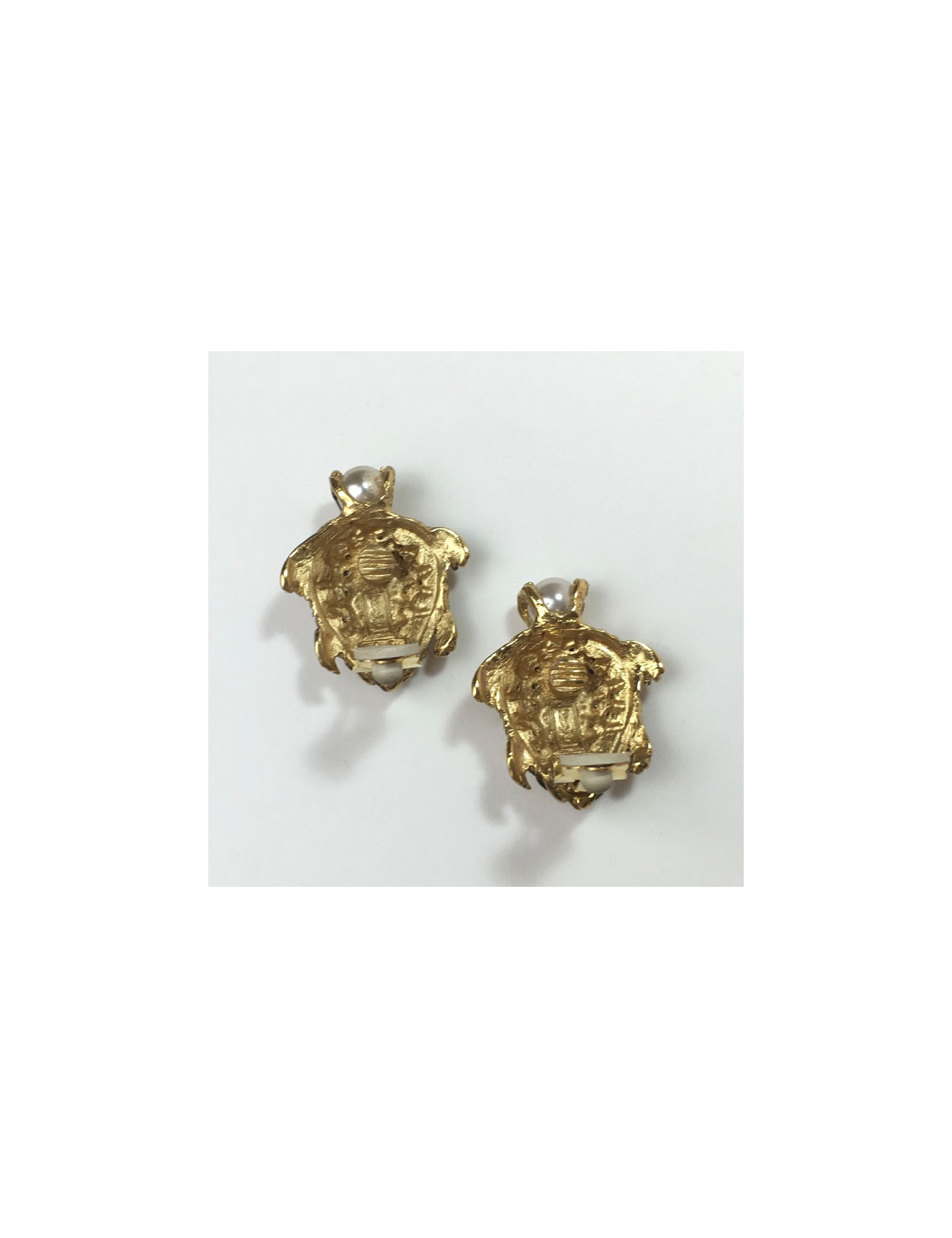 Details: Yves Saint Laurent YSL turtle clip earrings in gilded metal, pearly beads and rhinestones.