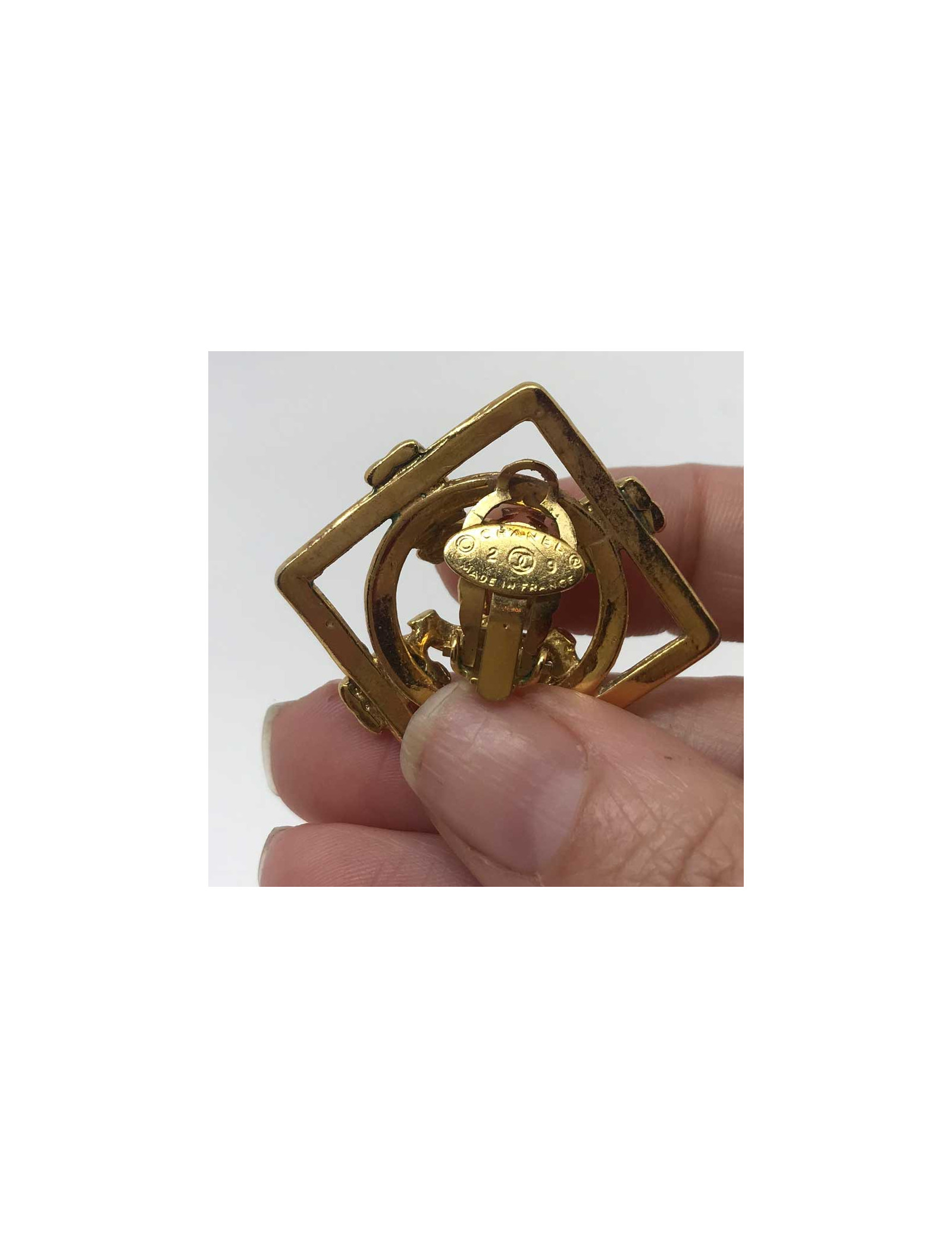 Last items in stock EARRINGS CHANEL vintage collector big clip-on earrings CHANEL 36409 6,100.00 € CHANEL vintage collector big clip-on earrings Condition : goodMade in FranceMaterials: pearly beads, metalColors : gold, mothe-of-pearlMeasurements : clip : 2.2 x 2.2 cm CC pendant : 6 x 6 cmTotal length : 10,2cmHardware :gold finish metalStamp : yesYear: 1970'sDetails : Pearly bead clips, one of the beads is slightly damaged which is why we put them in... Add to cart