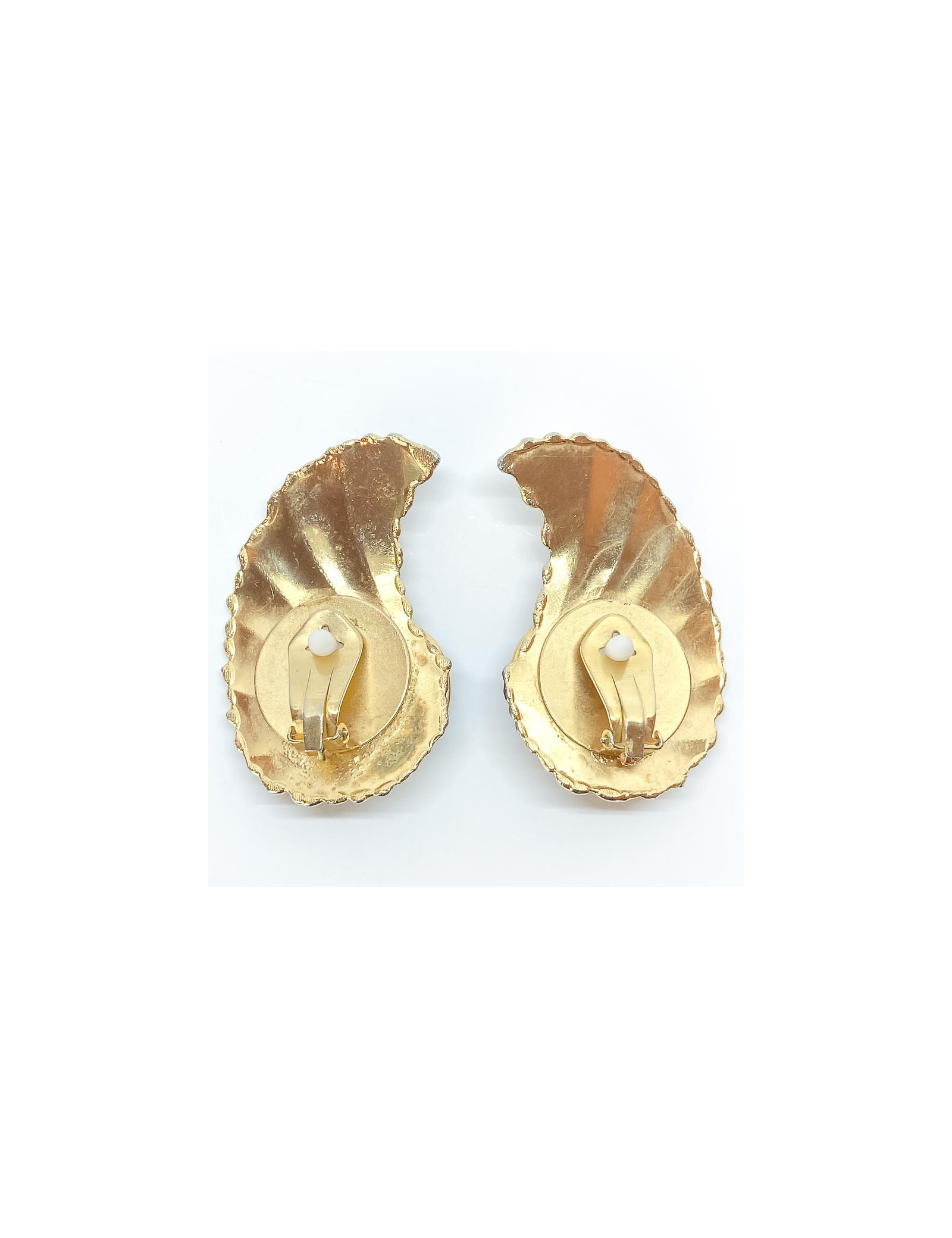 Last items in stock EARRINGS CHANEL Vintage Flower Clips in Gilt Metal CHANEL 28375 3,250.00 € Collector CHANEL flower clips Condition: goodMade in FranceMaterial: gold-plated metal, mother-of-pearlColor: gold, mother-of-pearlDimensions: diameter 6 cmHardware: gold-plated metalStamp: yesYear: 80sDetails : Clip earrings from the 80s, each representing an imposing daisy, with fine-gold petals and a pearly daisy in the heart. A rare collector's item.... Add to cart