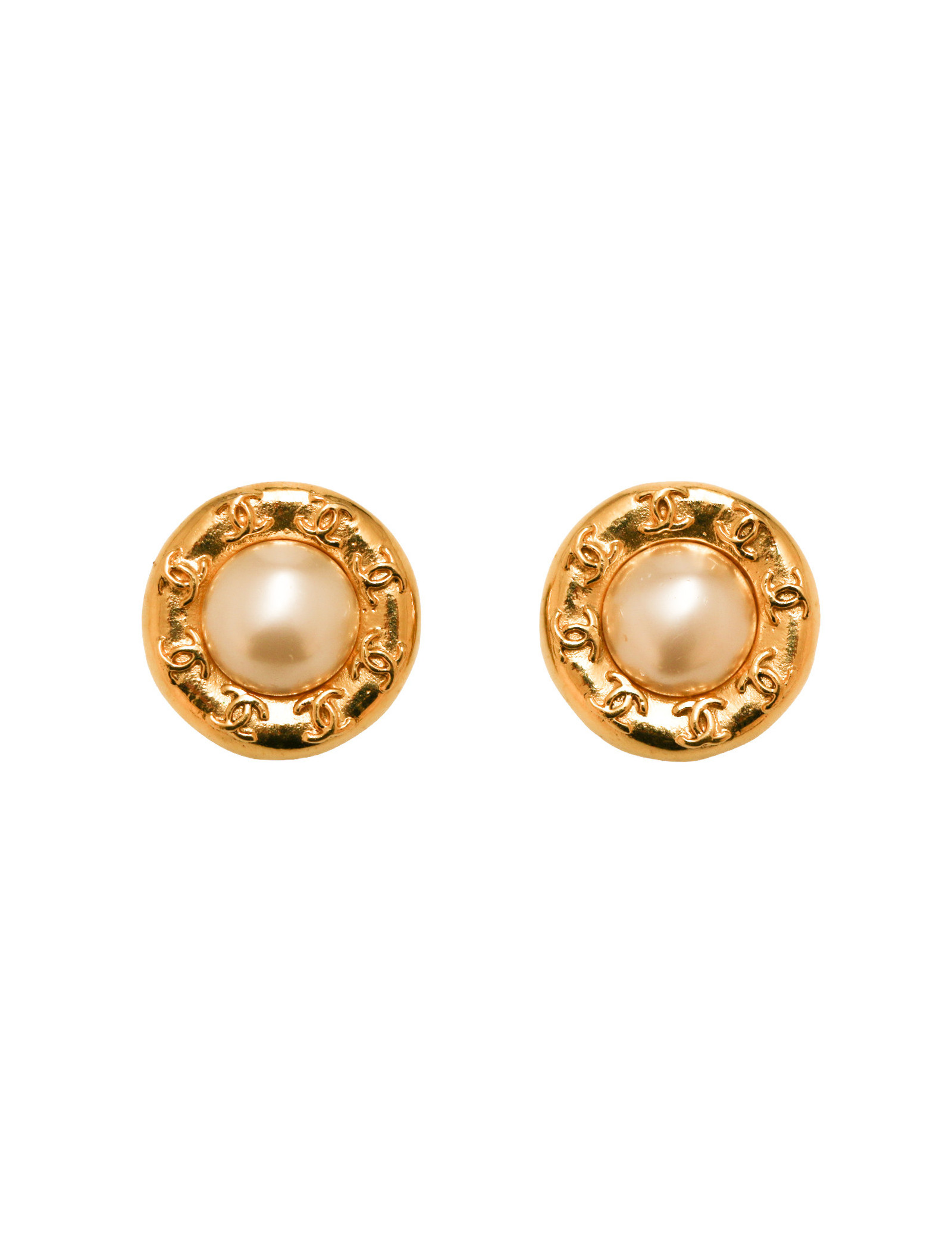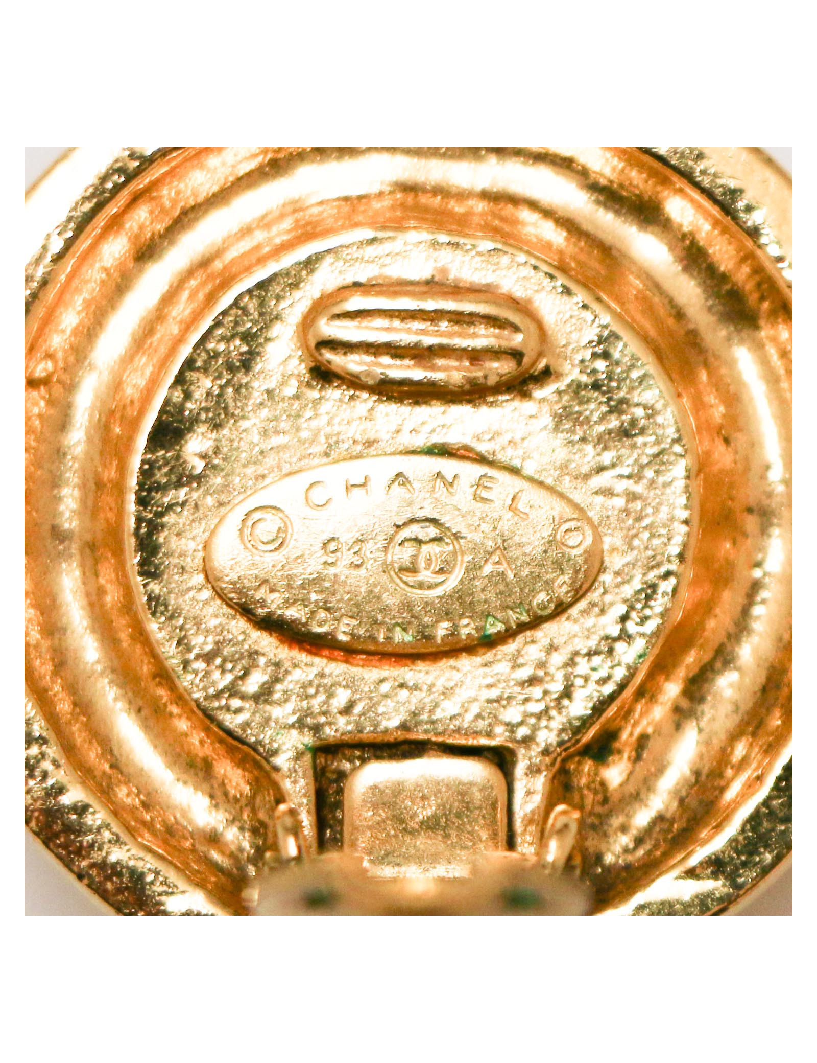 Sold EARRINGS CHANEL vintage Couture round pearl clip-on earrings CHANEL 35532 630.00 € CHANEL vintage Couture round pearl clip-on earrings Condition : goodMade in FranceMaterials: metal, beadsColors : gold, mother-of-pearlMeasurements : 2.8 x 2.8 cmHardware : 24k gold plated metalStamp :yesYear: 1970'sDetails :vintage couture clip-on earrings. A nod to the past, the exterior is engraved with Roman numerals. We place them in “good condition”... View