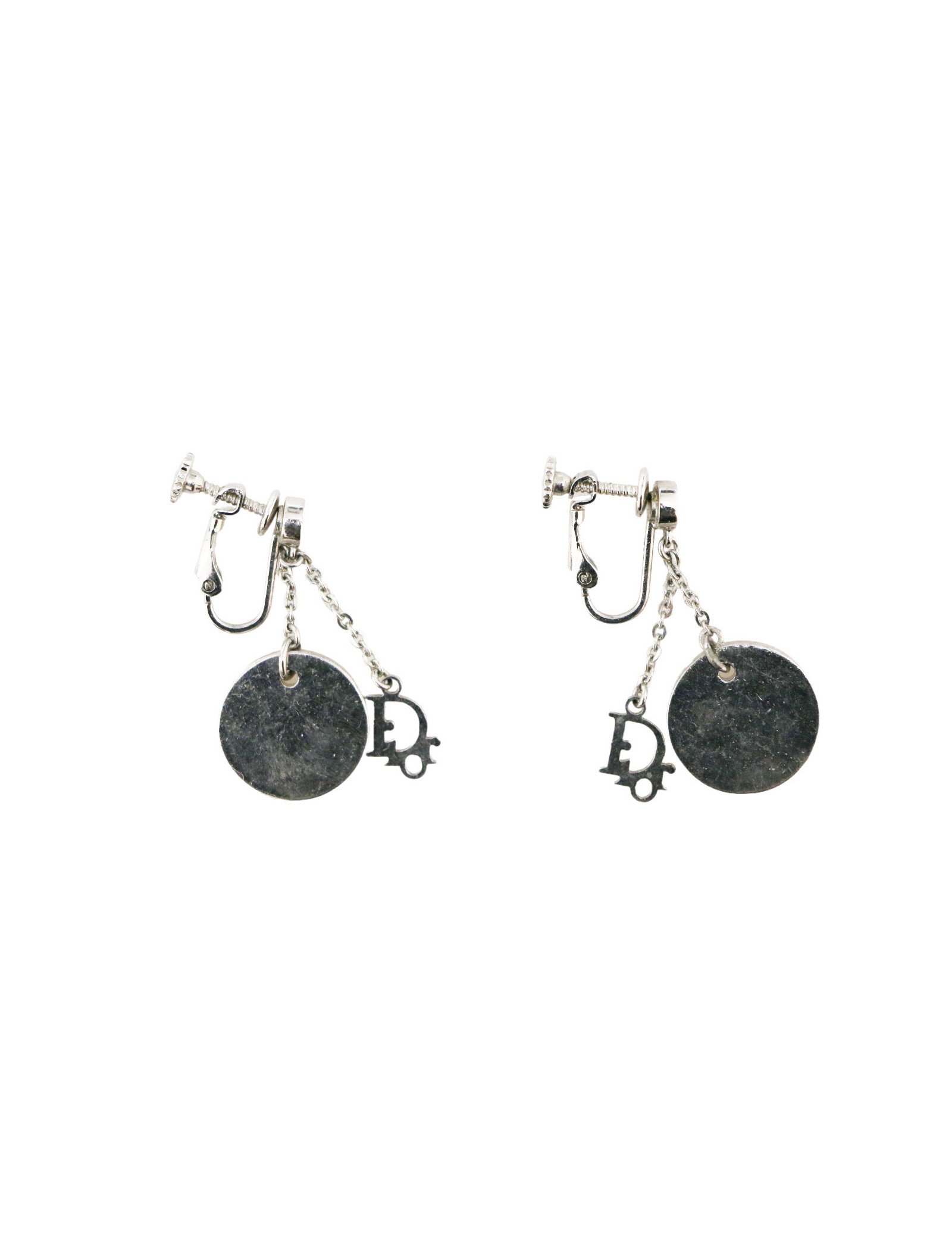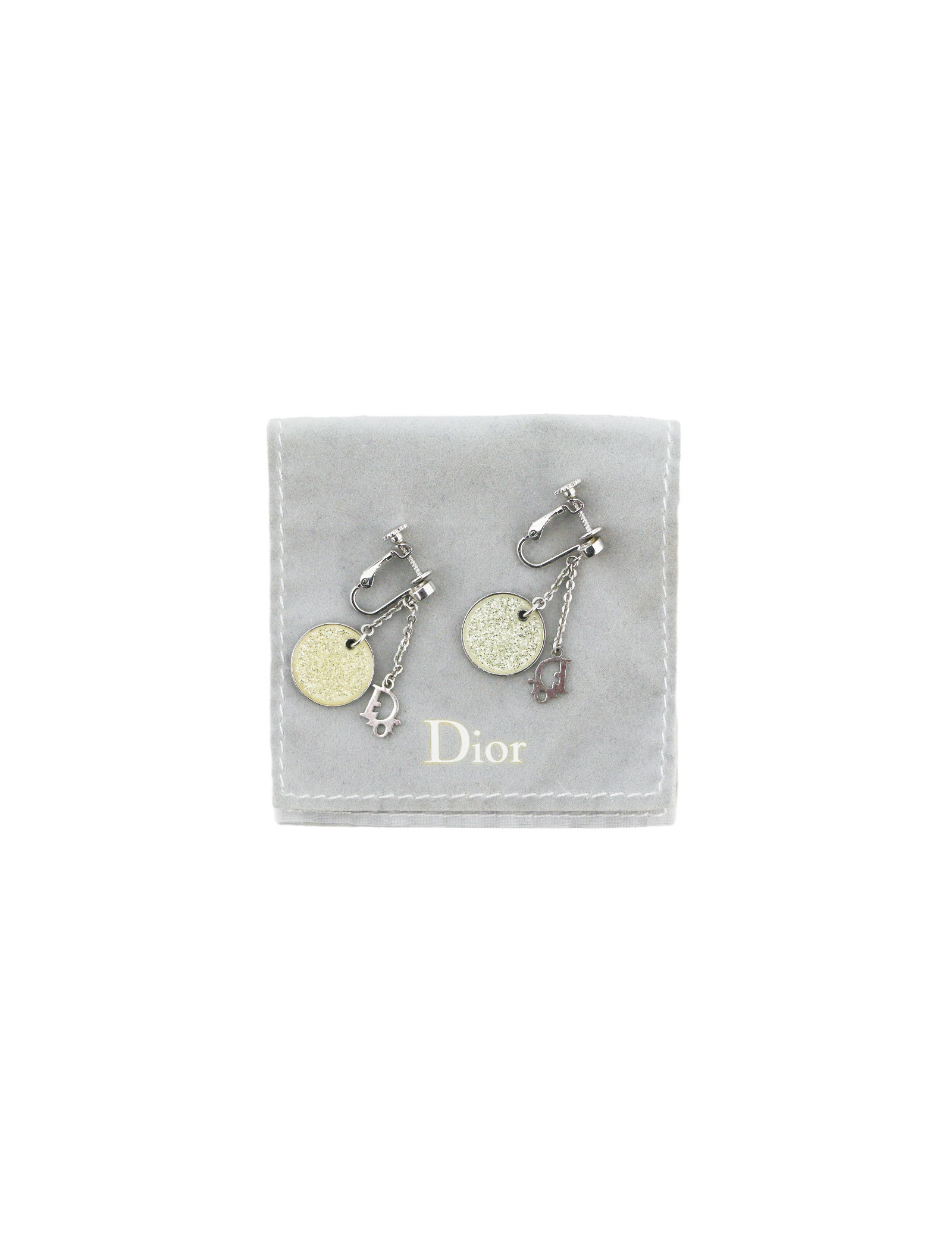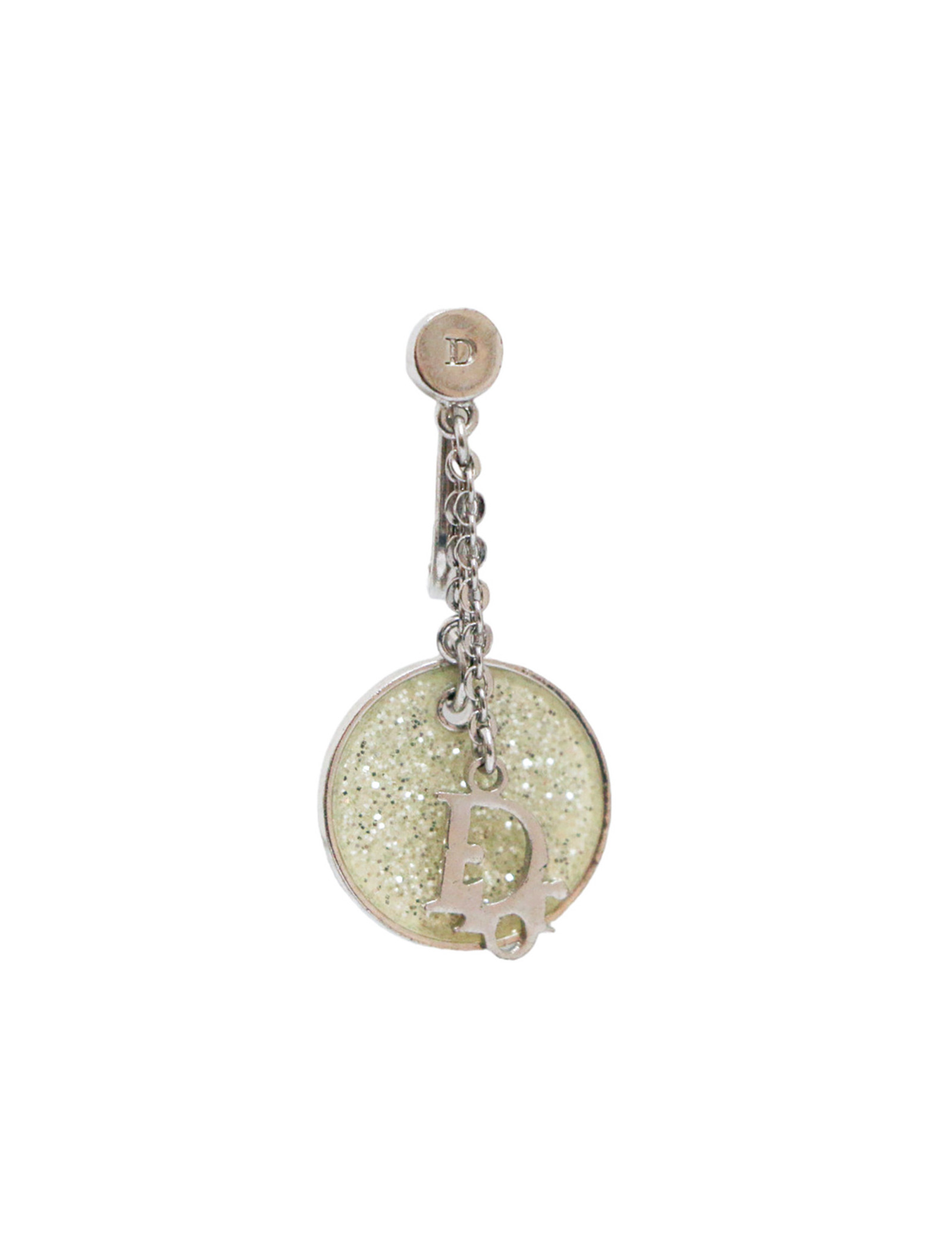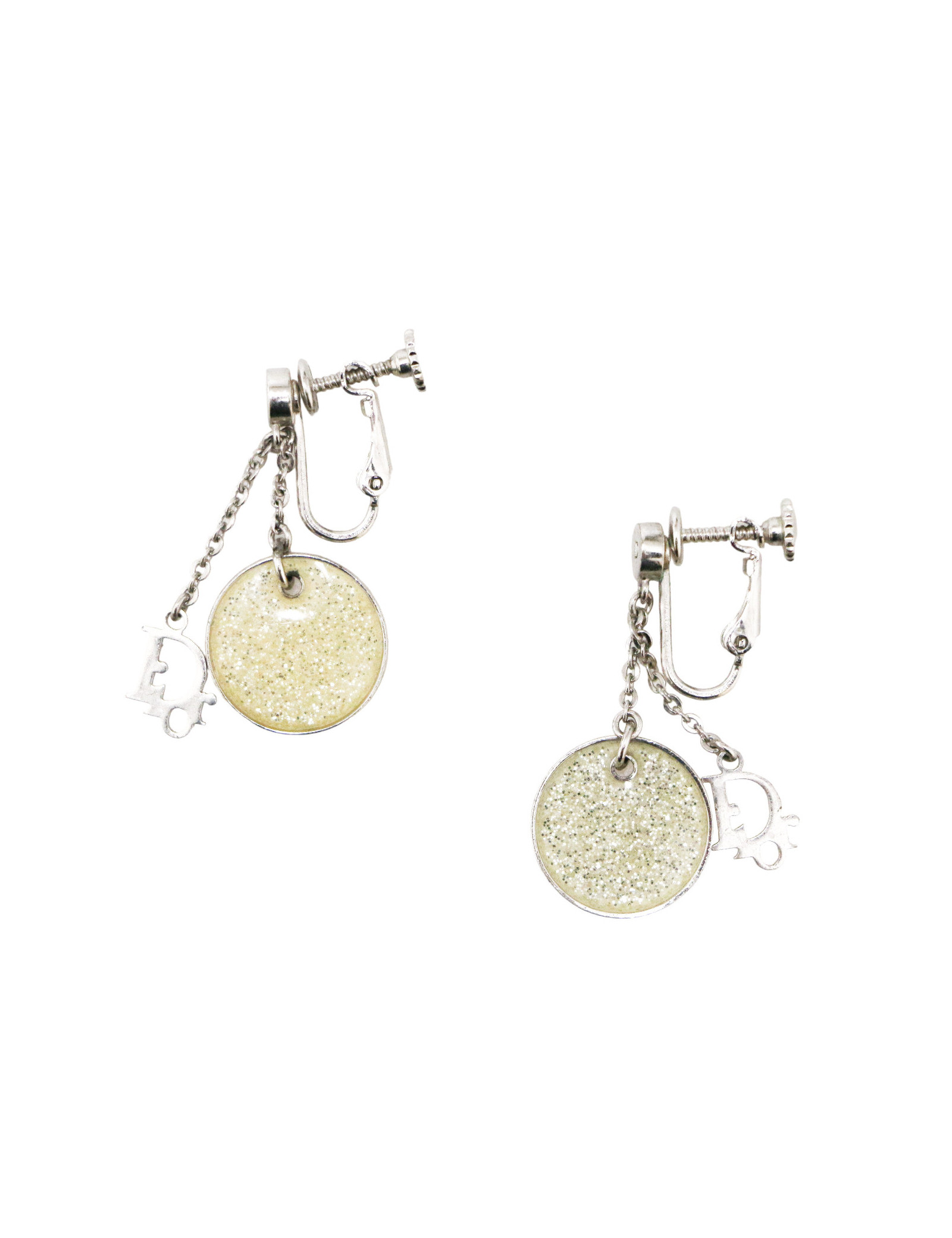 Details :DIOR charms and transparent pearl with silver glitter. Clip-on earrings, adjustable with a screw.