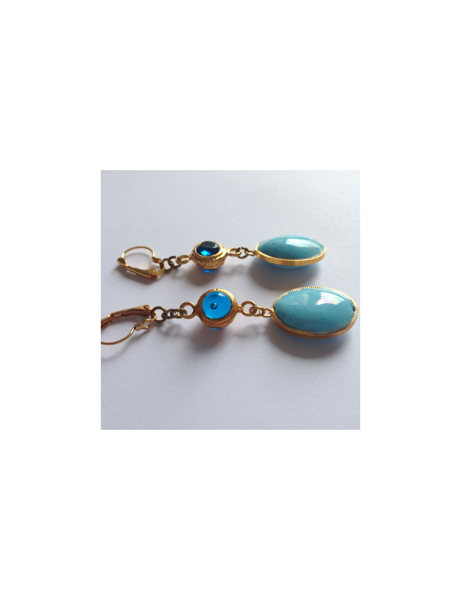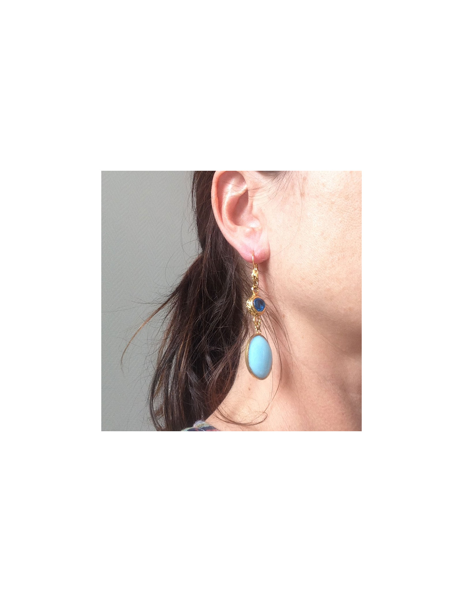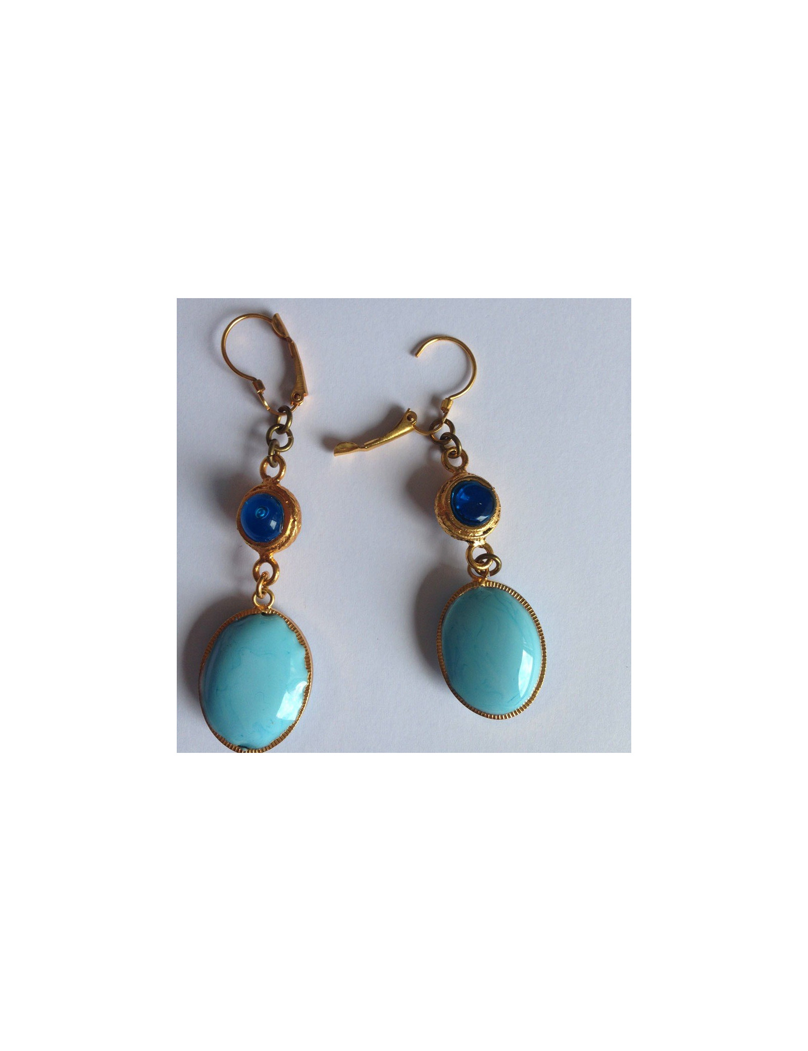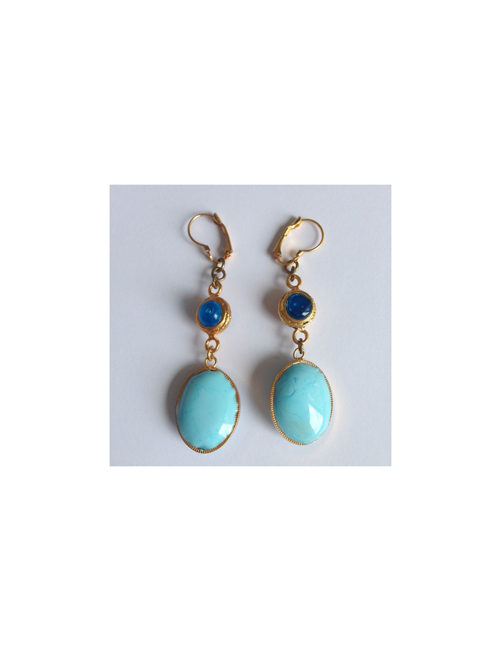 Marguerite de Valois consisting of a blue oval ear studs gilded opaque layette glass embellished with a round of transparent blue glass & metal end