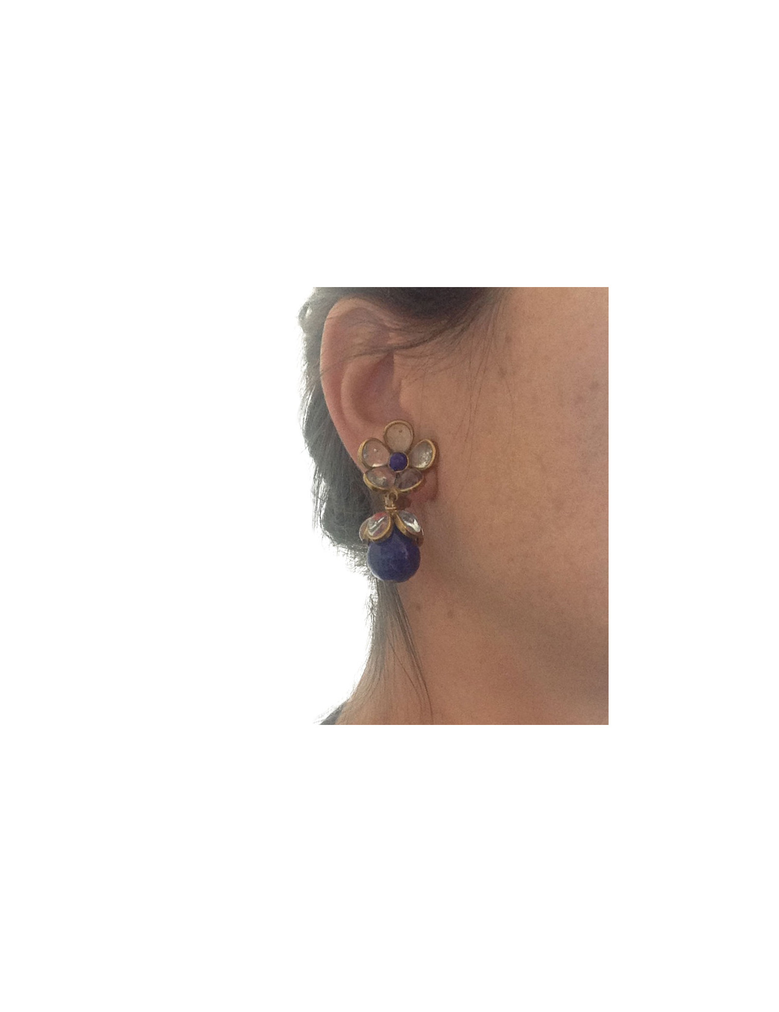 Ear clips Marguerite de Valois in blue glass paste overnight and transparent metal gilded fin. Fleurette and Pearl drop glass paste. Jewel Couture vintage.