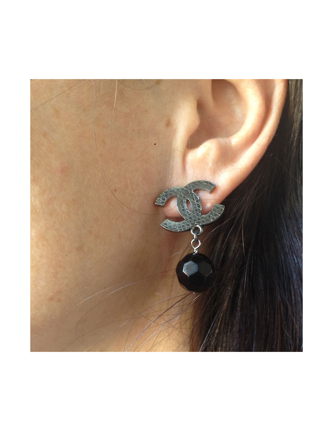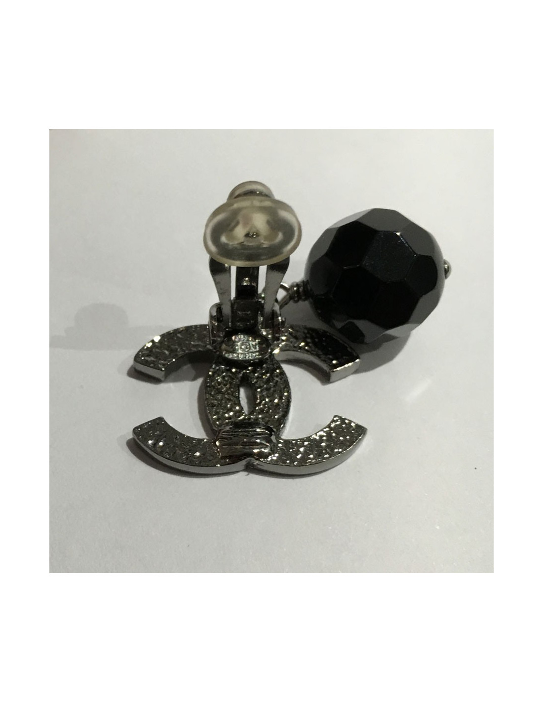 Clips cc Chanel en métal quadrillé noir soutenant une perle facettée noire.