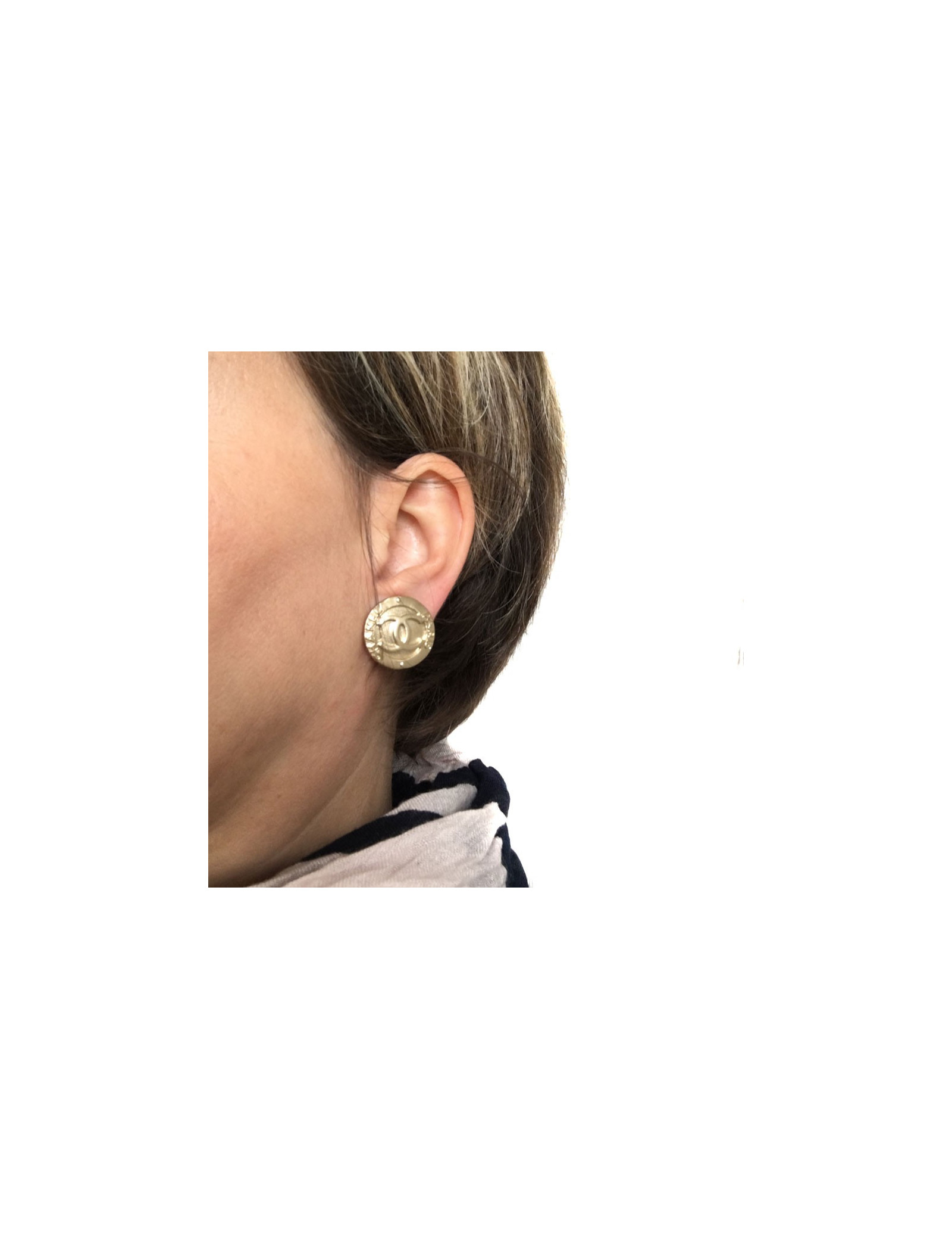 Last items in stock EARRINGS CHANEL gilded CC clip-on earrings CHANEL 37014 590.00 € CHANEL gilded small CC clip-on earrings Condition : very goodMade in FranceMaterial : gold plated metalColor : goldMeasurements : diameter 1,5 cmHardware : gold plated metalStamp : yesYear : 1971-1980Details : small round earrings with a CC on the front Add to cart