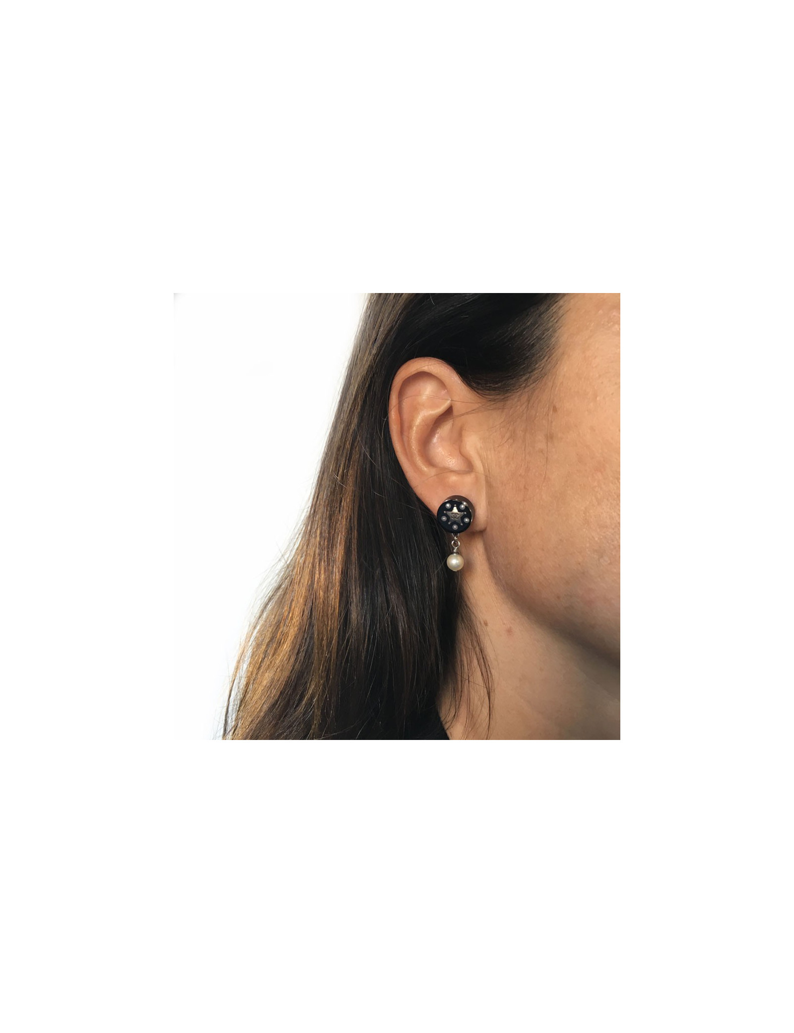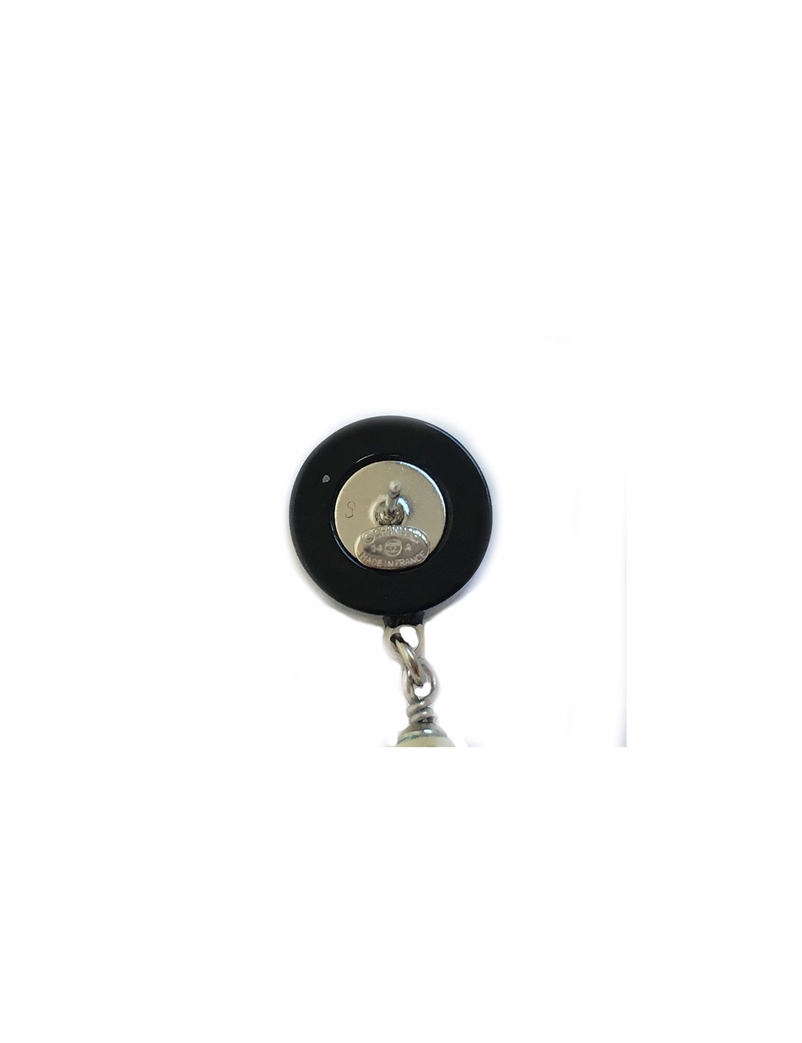 Earrings CHANEL round nails plexi clear and black, small Pearl Pearl collection Paris Dallas. The highlight inside a star of sheriff with an inlaid CC and 5 small Pearly beads. A Collection of 2014.