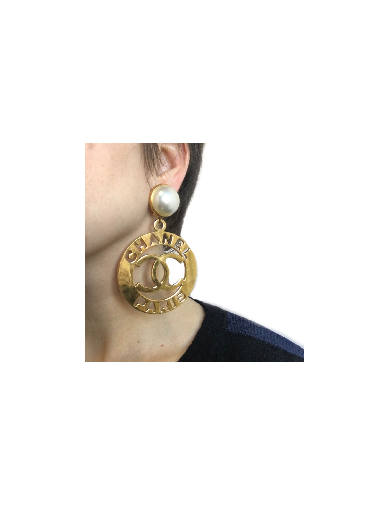 Very nice pair of big earrings ear pendants clips CHANEL gold metal and a half Pearl Pearl. CC at the Center. CHANEL and PARIS inscriptions around the clip. In very good condition. Micro scratches on the gold.