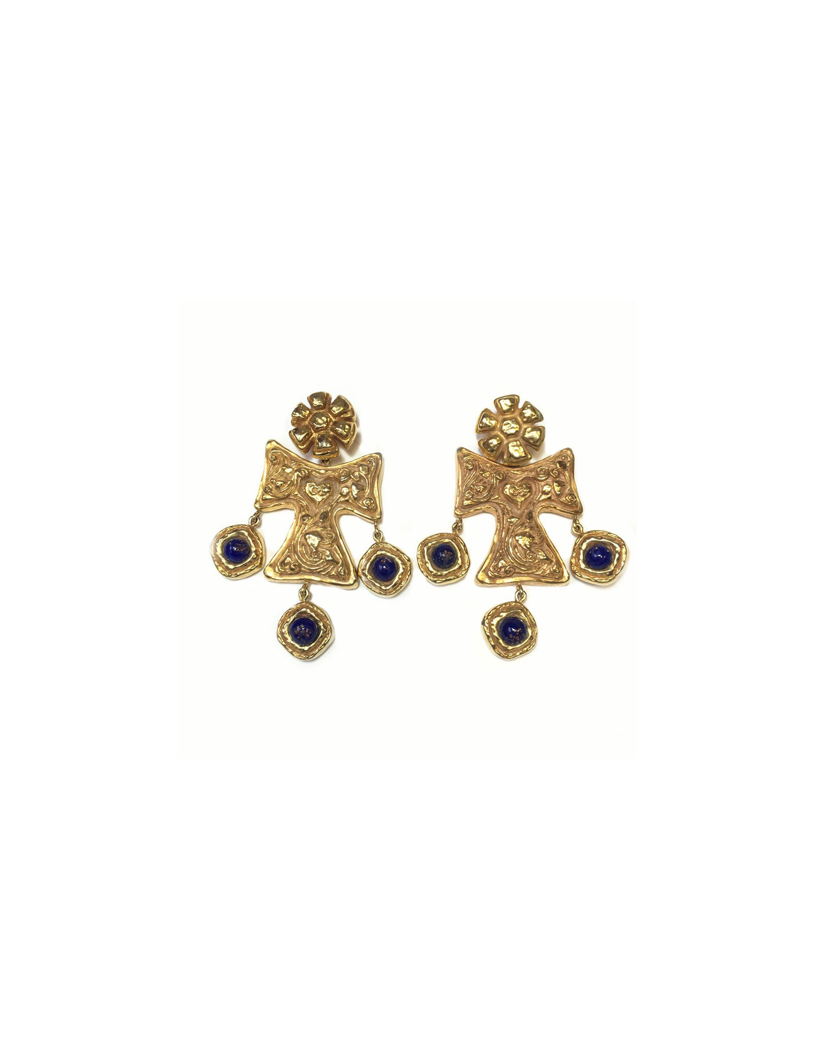 Impressive earrings clips CHRISTIAN LACROIX couture. In gold metal and gold glitter blue stone on top. In very good condition. The brand lozenge presents back.