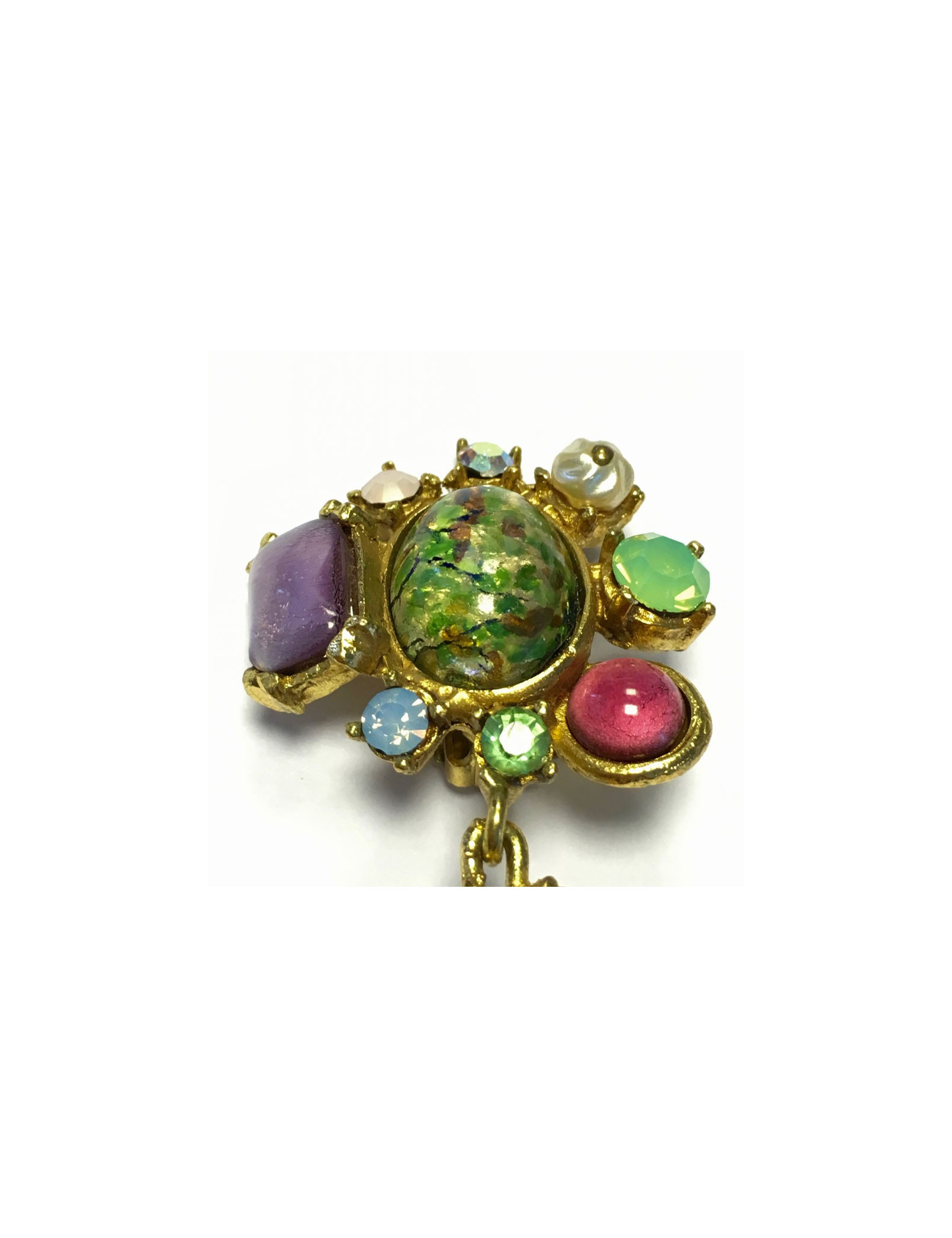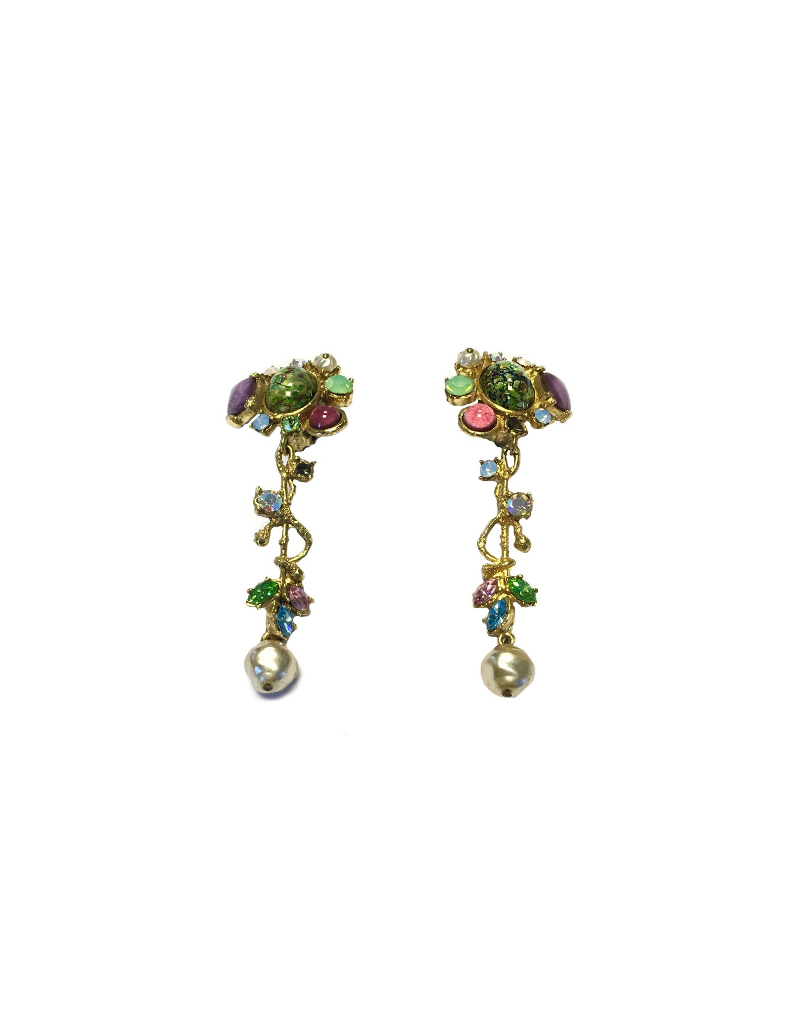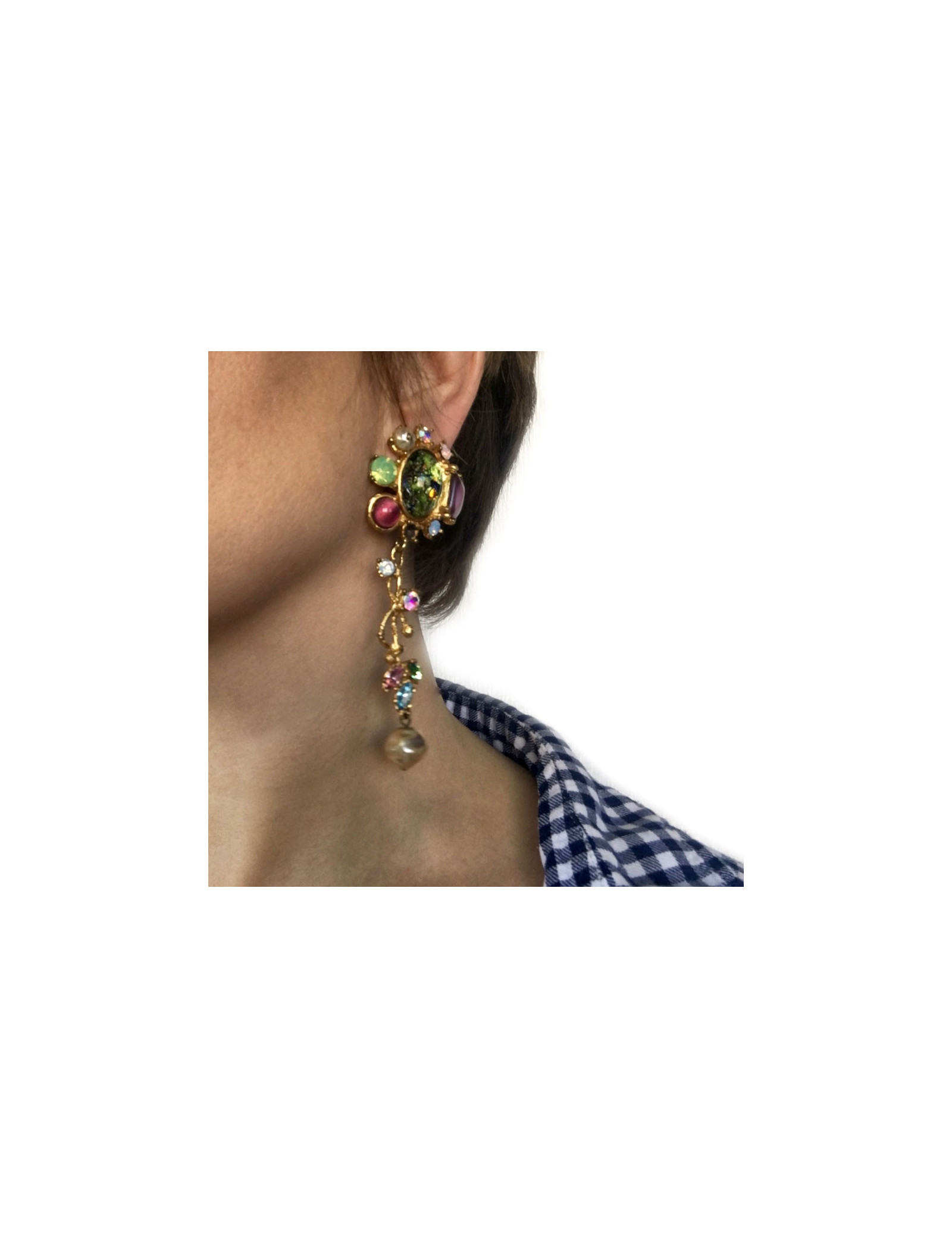 Superb! Earrings hanging clips CHRISTIAN LACROIX couture. Gold metal, set with multicolored stones, pearly Pearl and rhinestones. Missing a little green rhinestones on a loop and one small blue rhinestones on the other.