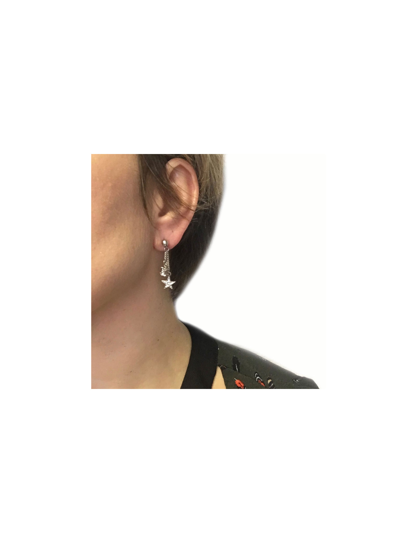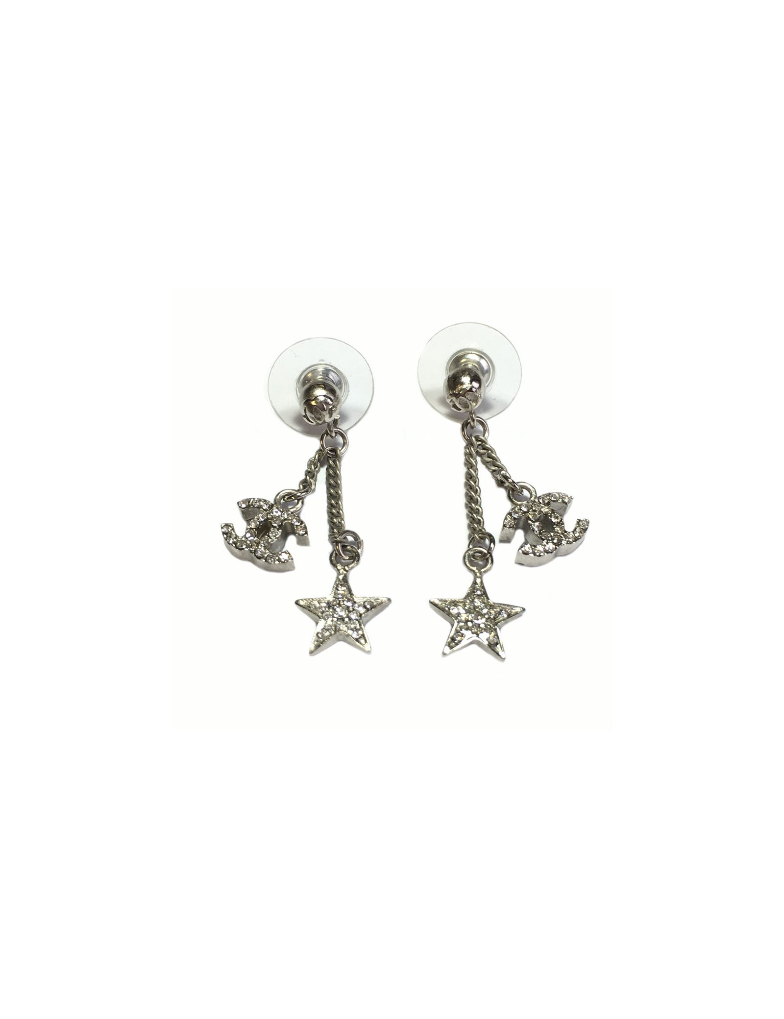 Nail pendants CHANEl silver metal and rhinestone earrings. A CC and a star embellished with Rhinestones. A small silver CC is located on the top of the loop. Never worn.