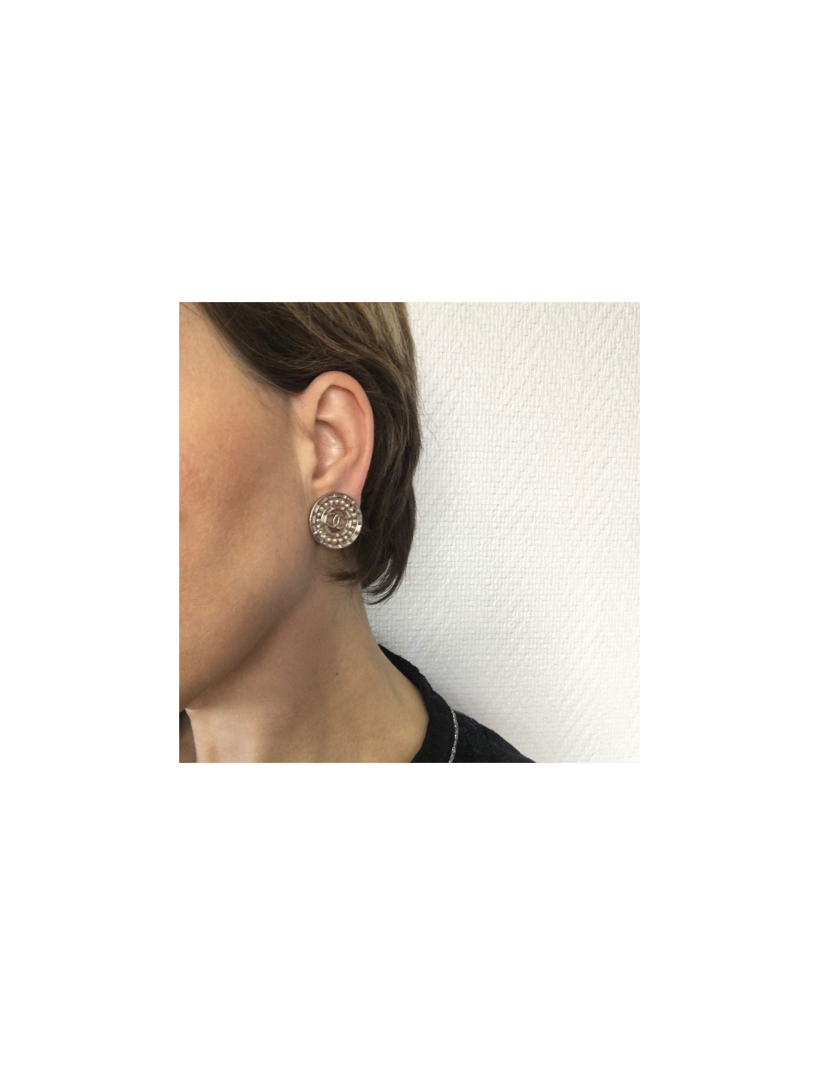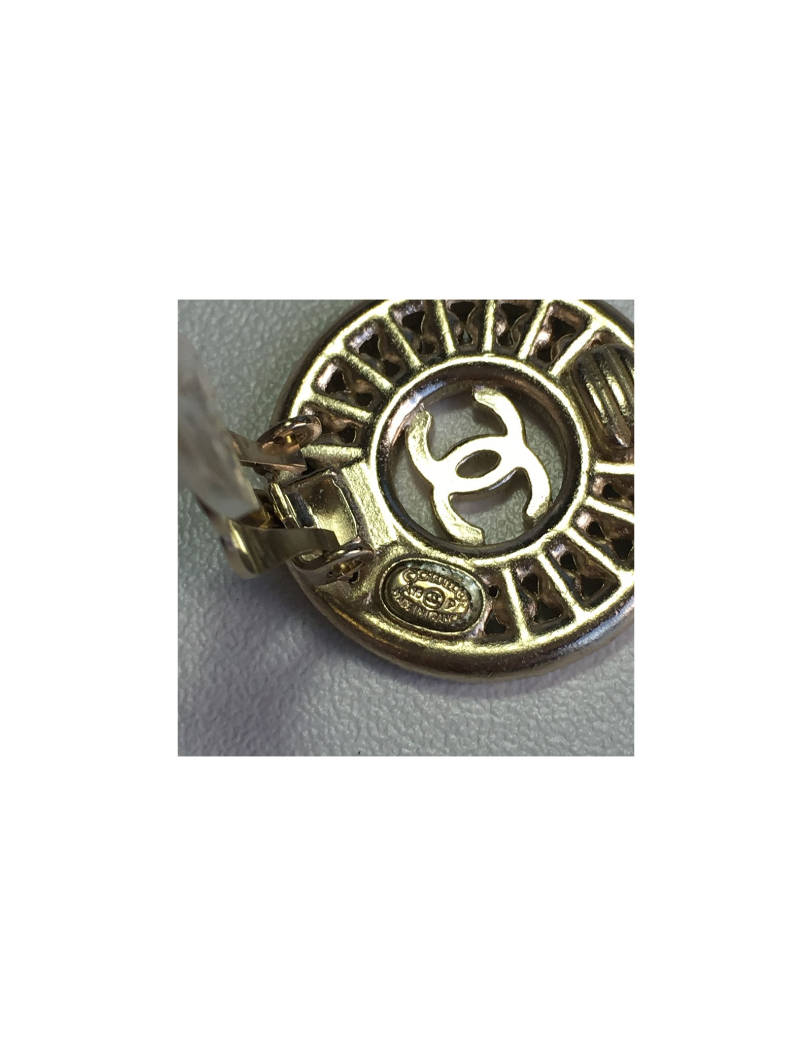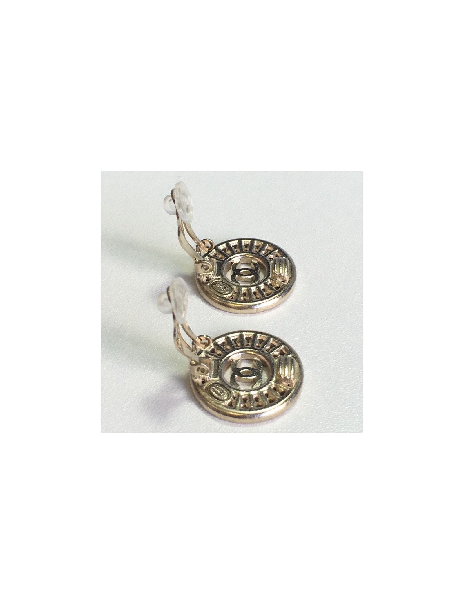 CHANEL round clip-on earrings in gilded metal, CC and Rhinestones