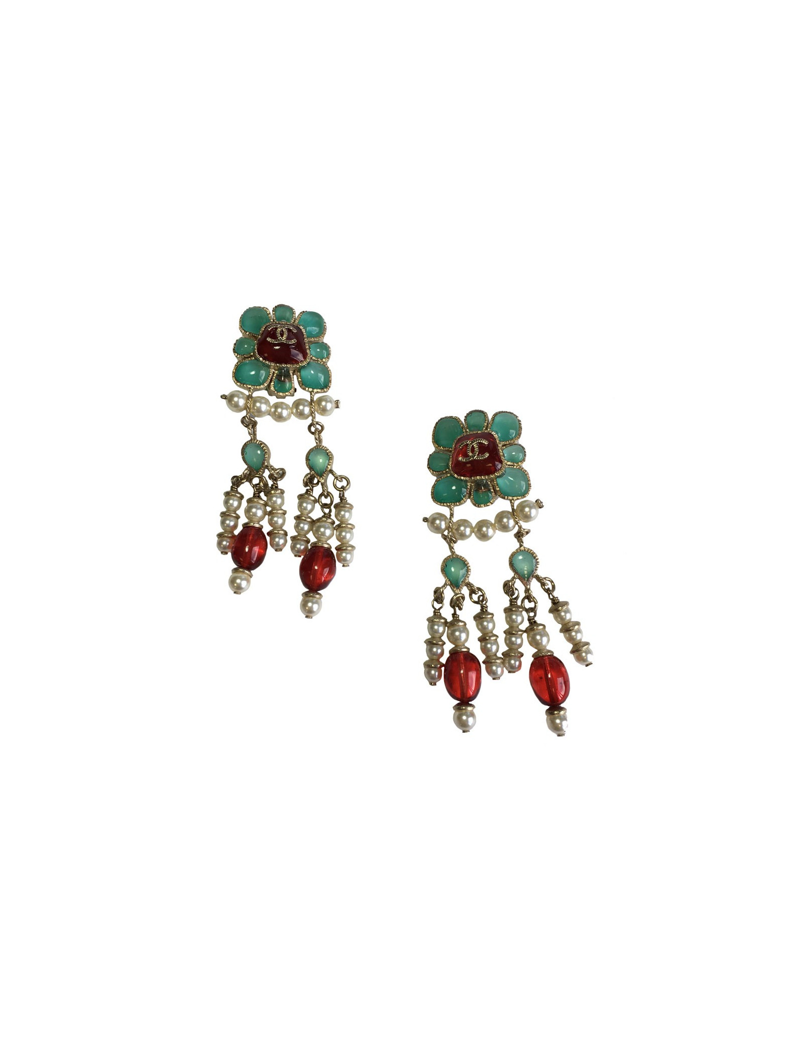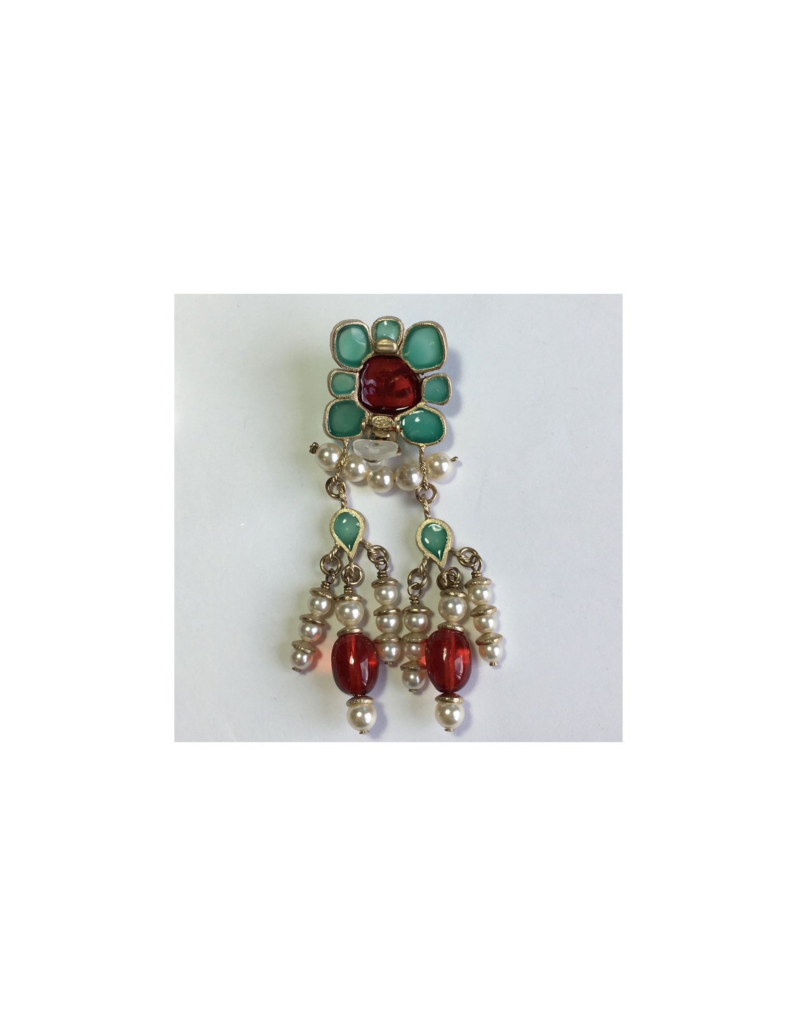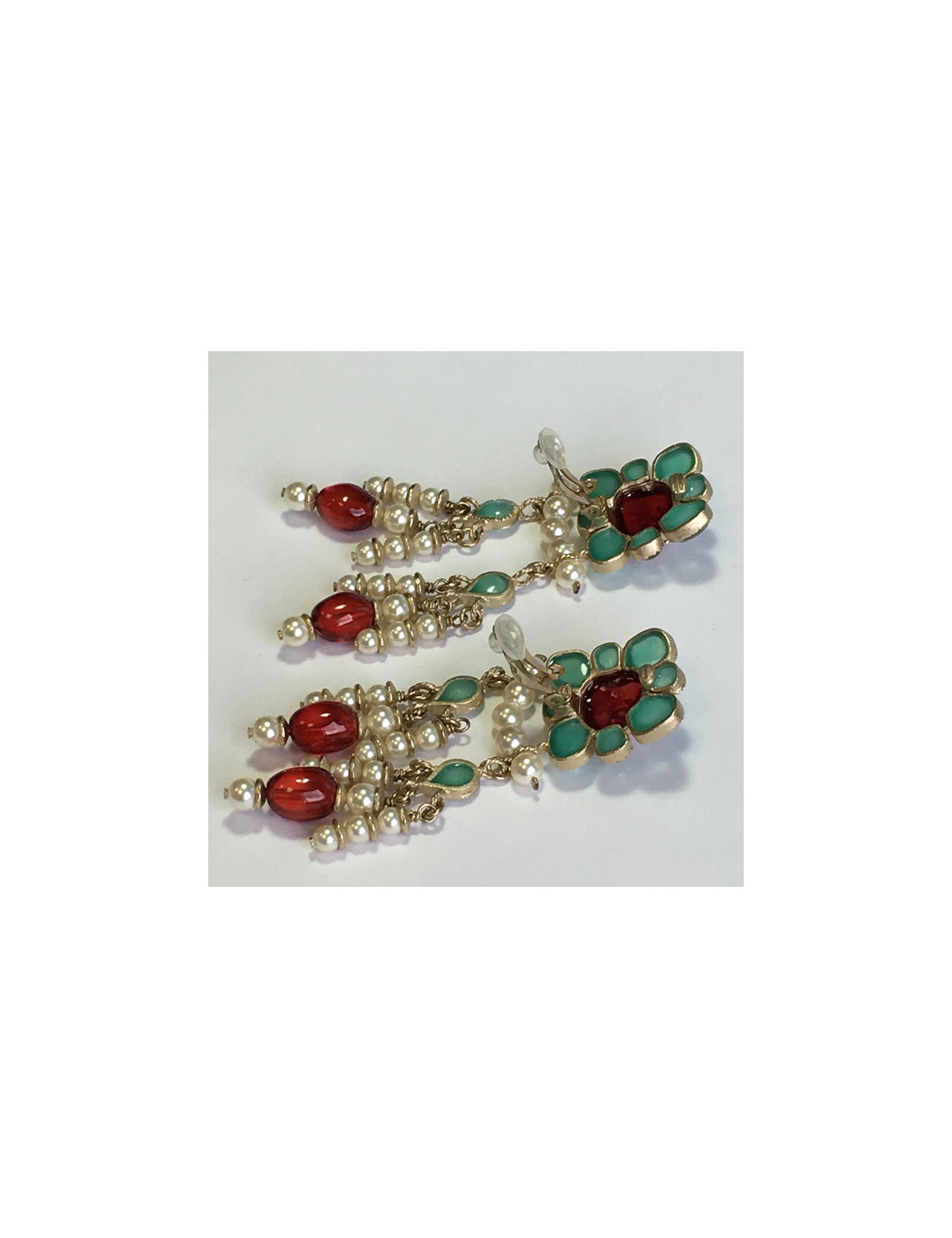 Sublimes boucles d'oreille clips CHANEL pendantes. En métal doré, perles nacrées, perle fantaisie rouge et pâte de verre couleur jade et rouge. Jamais portées. Pastille de la marque présente au dos.