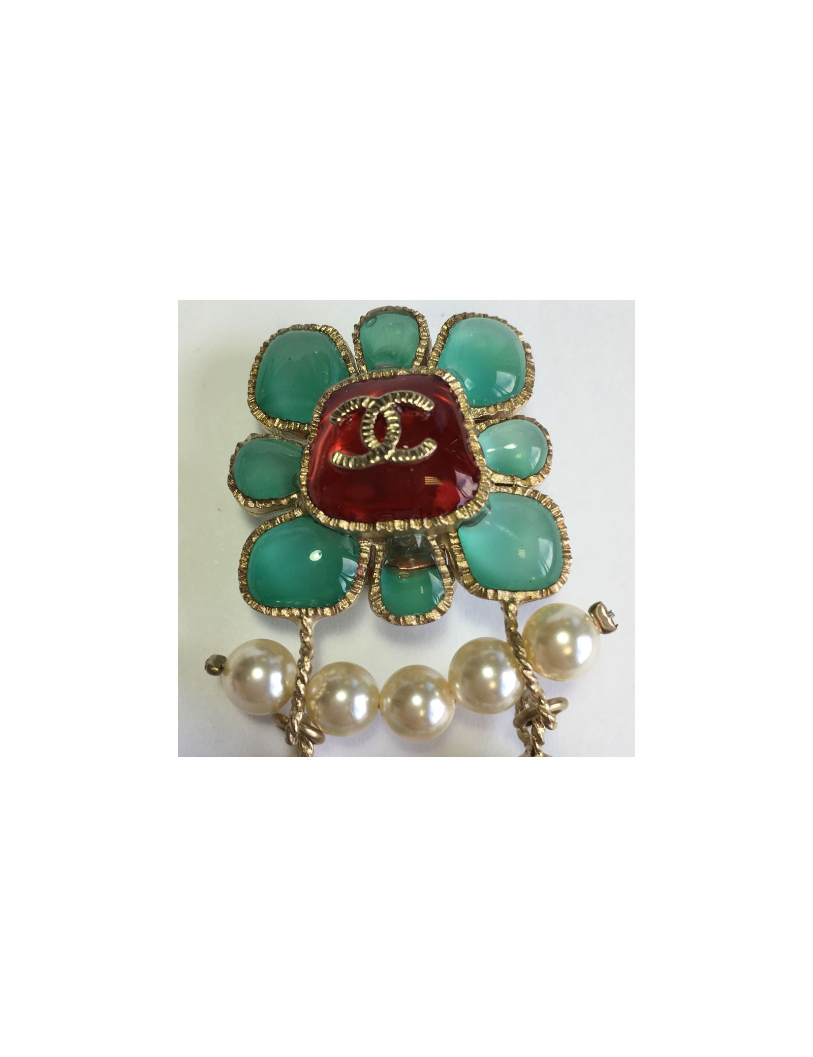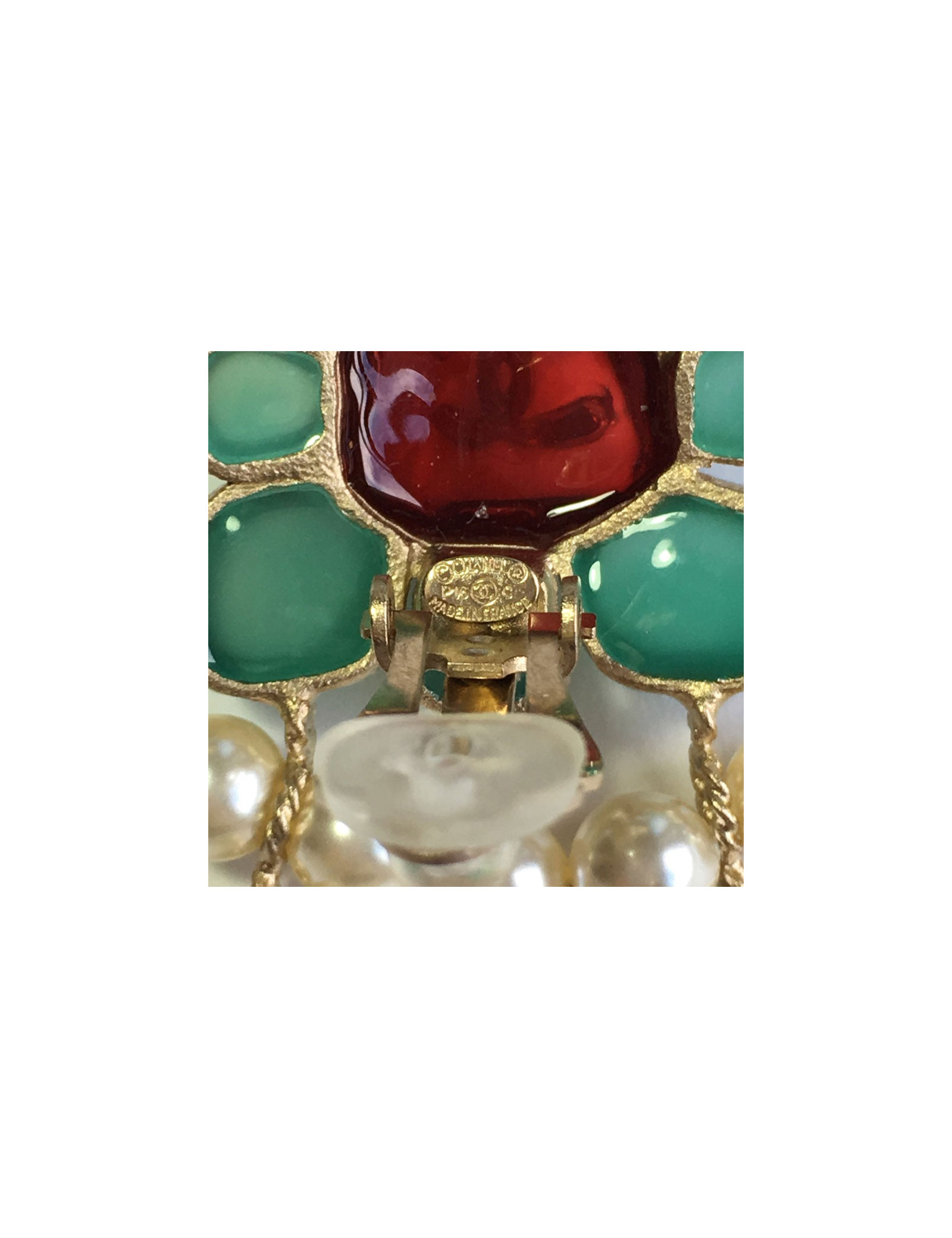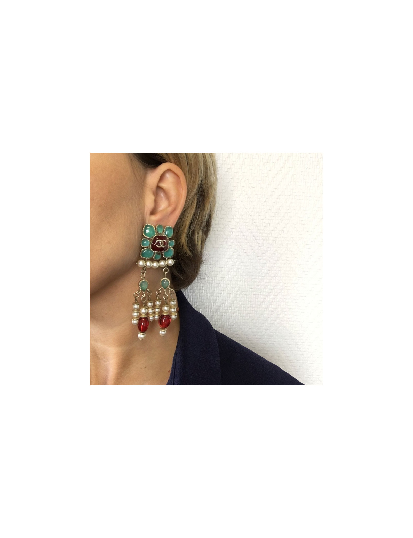 Sublimes boucles d'oreille clips CHANEL pendantes. En métal doré, perles nacrées, perle fantaisie rouge et pâte de verre couleur jade et rouge. Jamais portées. Pastille de la marque présente au dos.