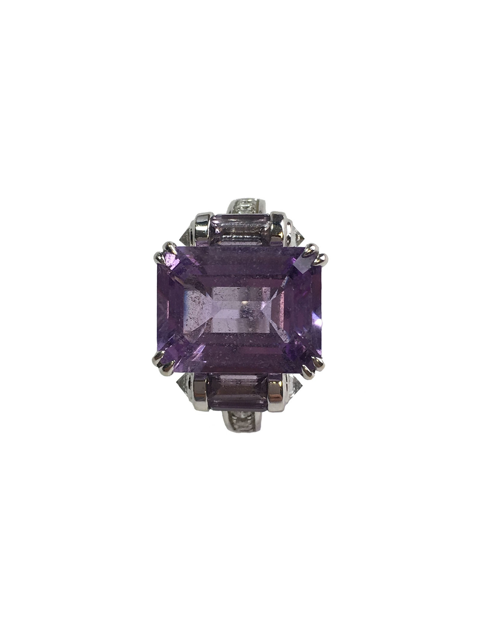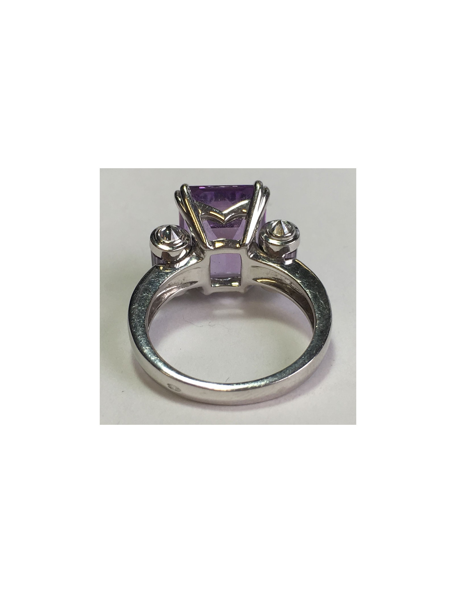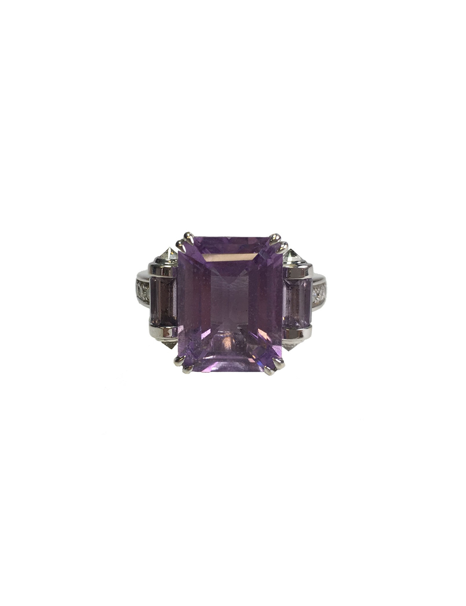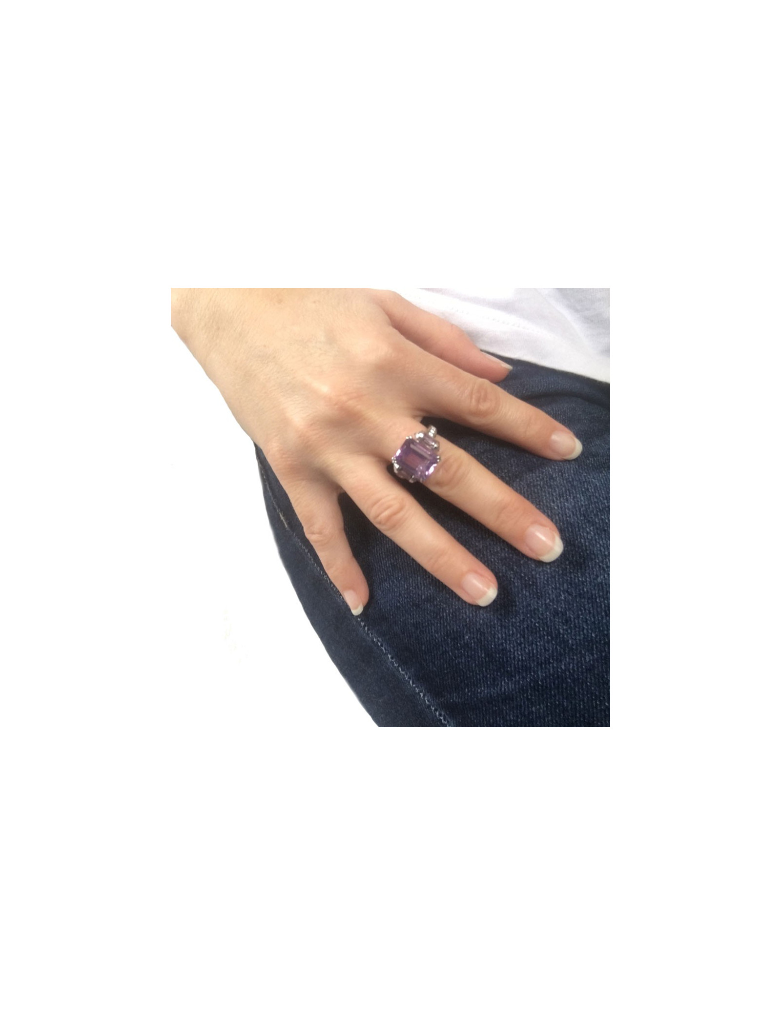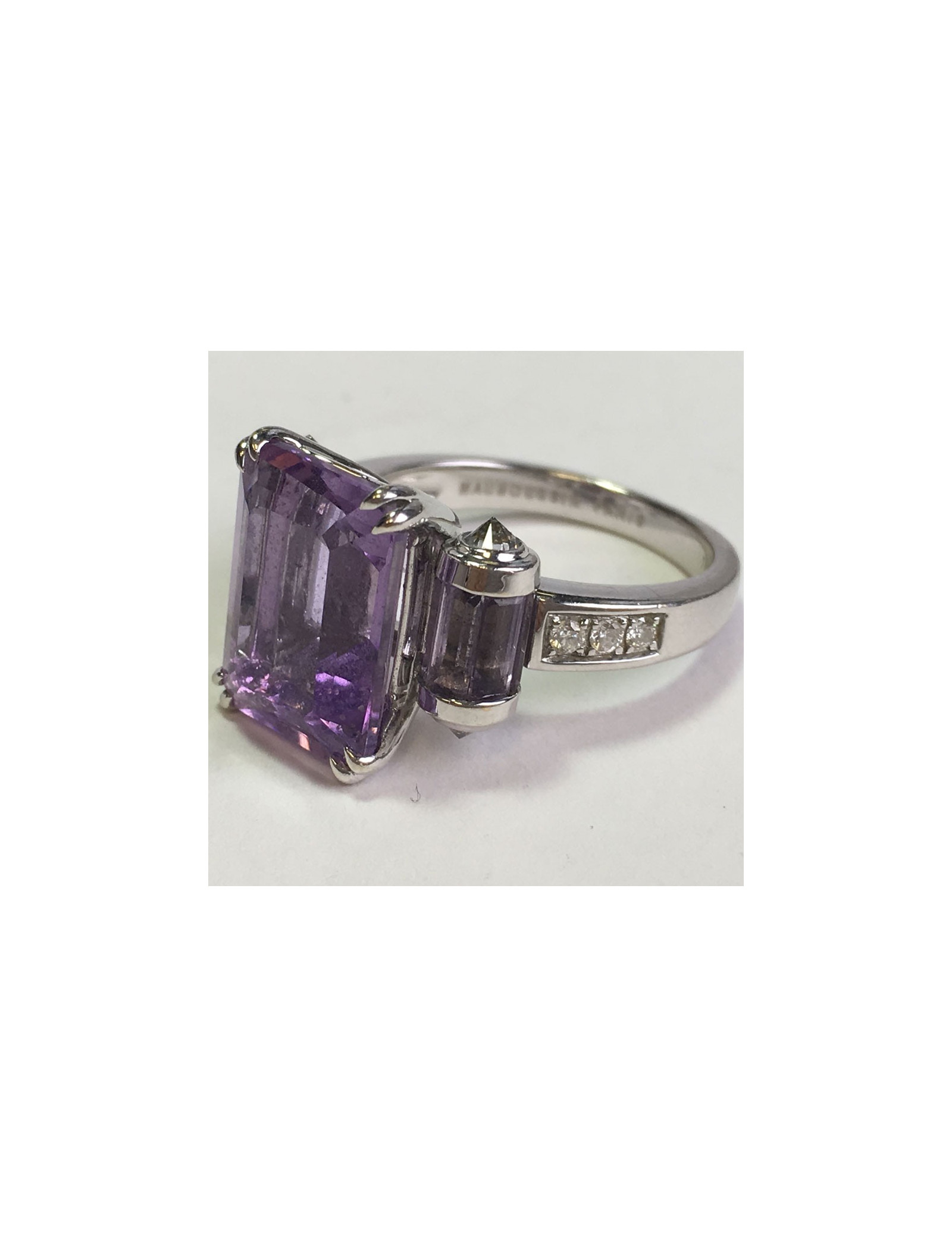 Très belle bague Mauboussin modèle "couleur baiser". Anneau en or blanc 18 carats, une belle améthyste taille émeraude de 5,90 cts épaulée de 2 rouleaux sertis de Roses de France taille baguette. Anneau et rouleaux sertis de diamants.