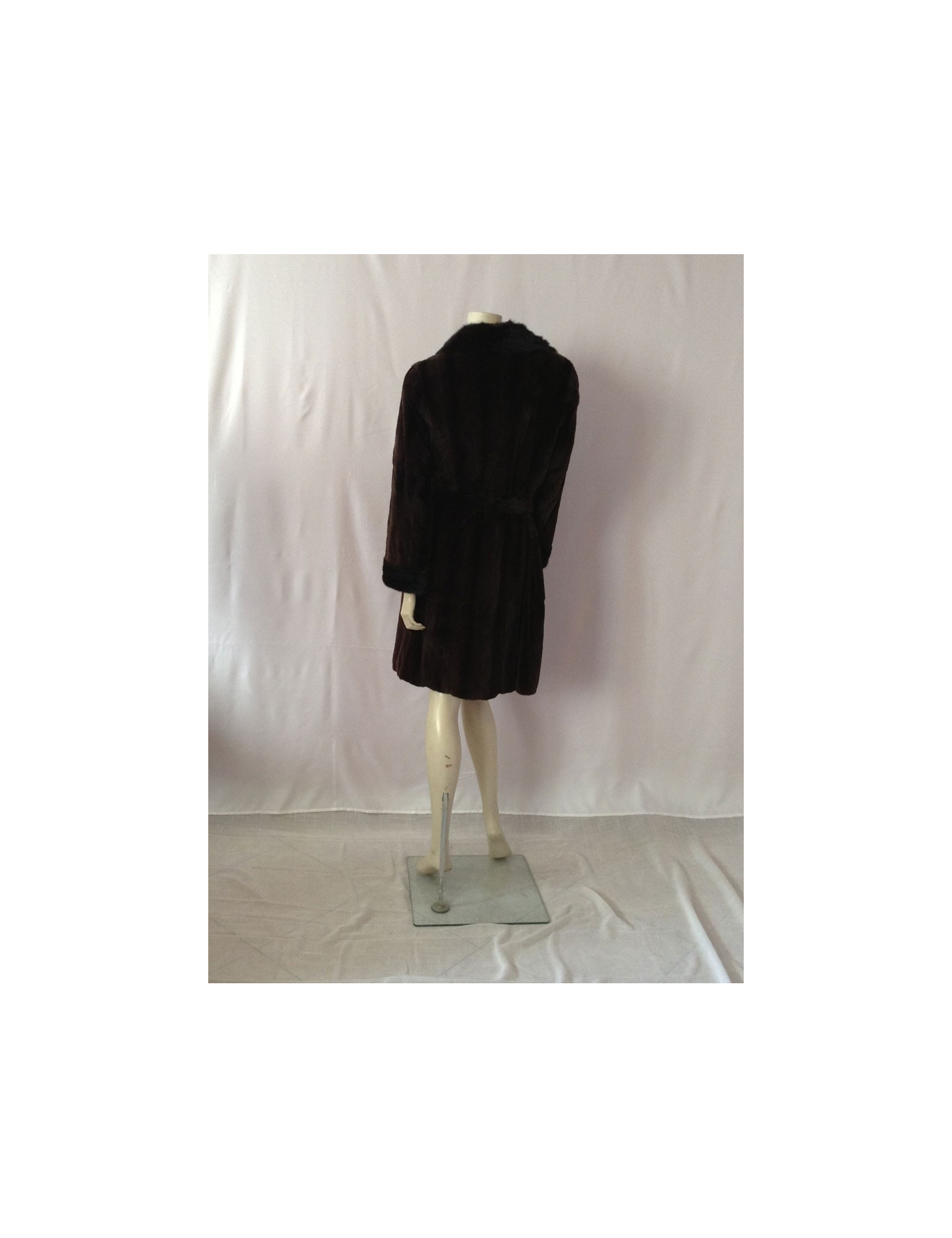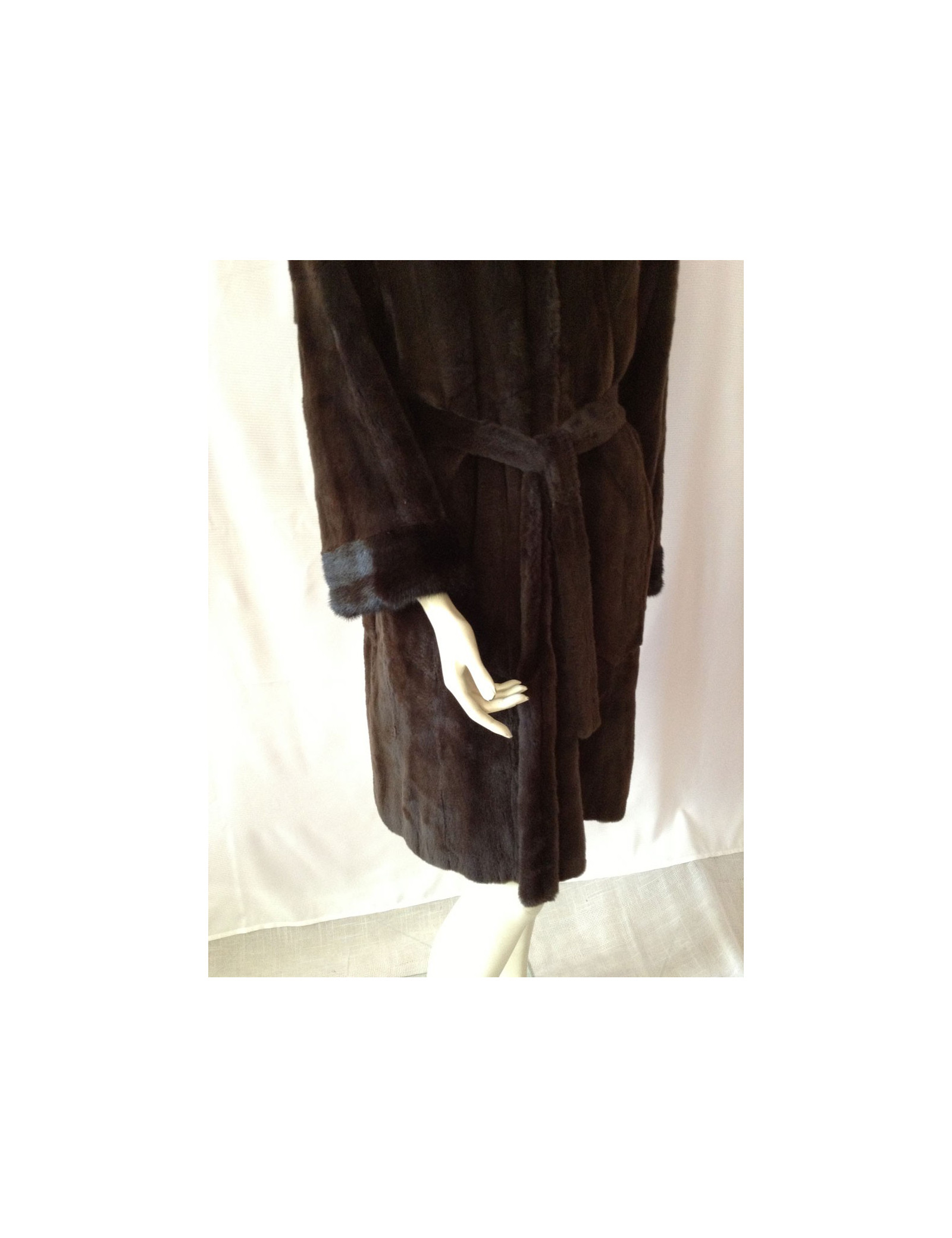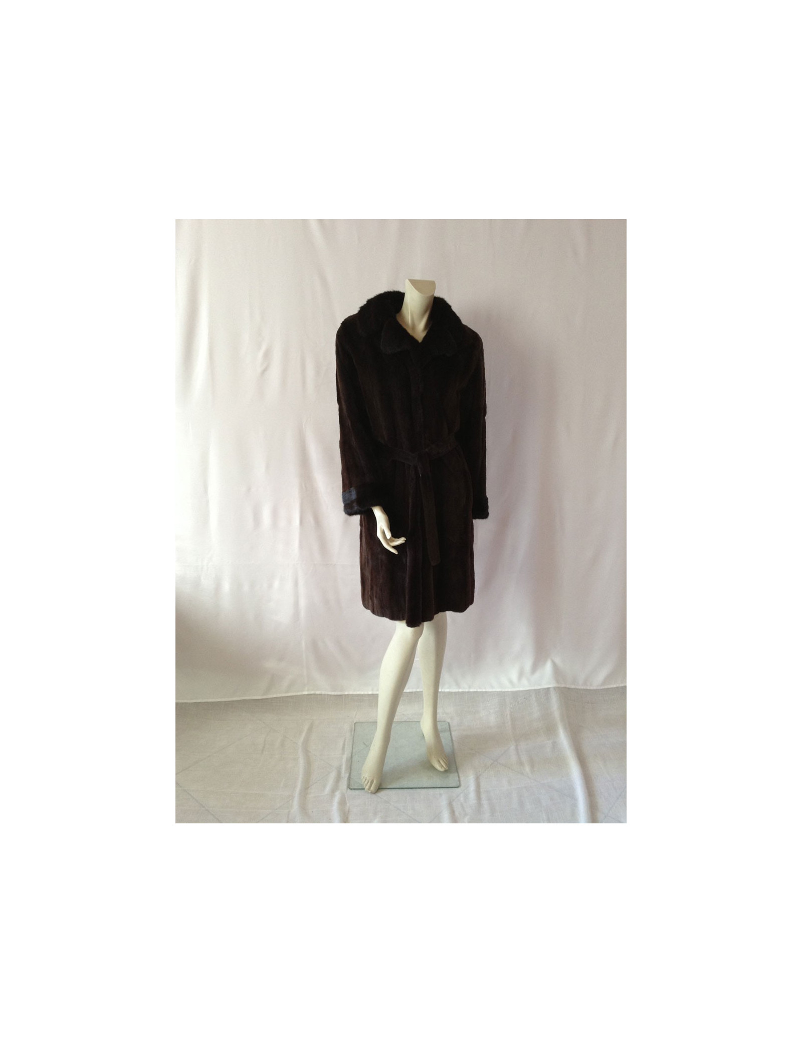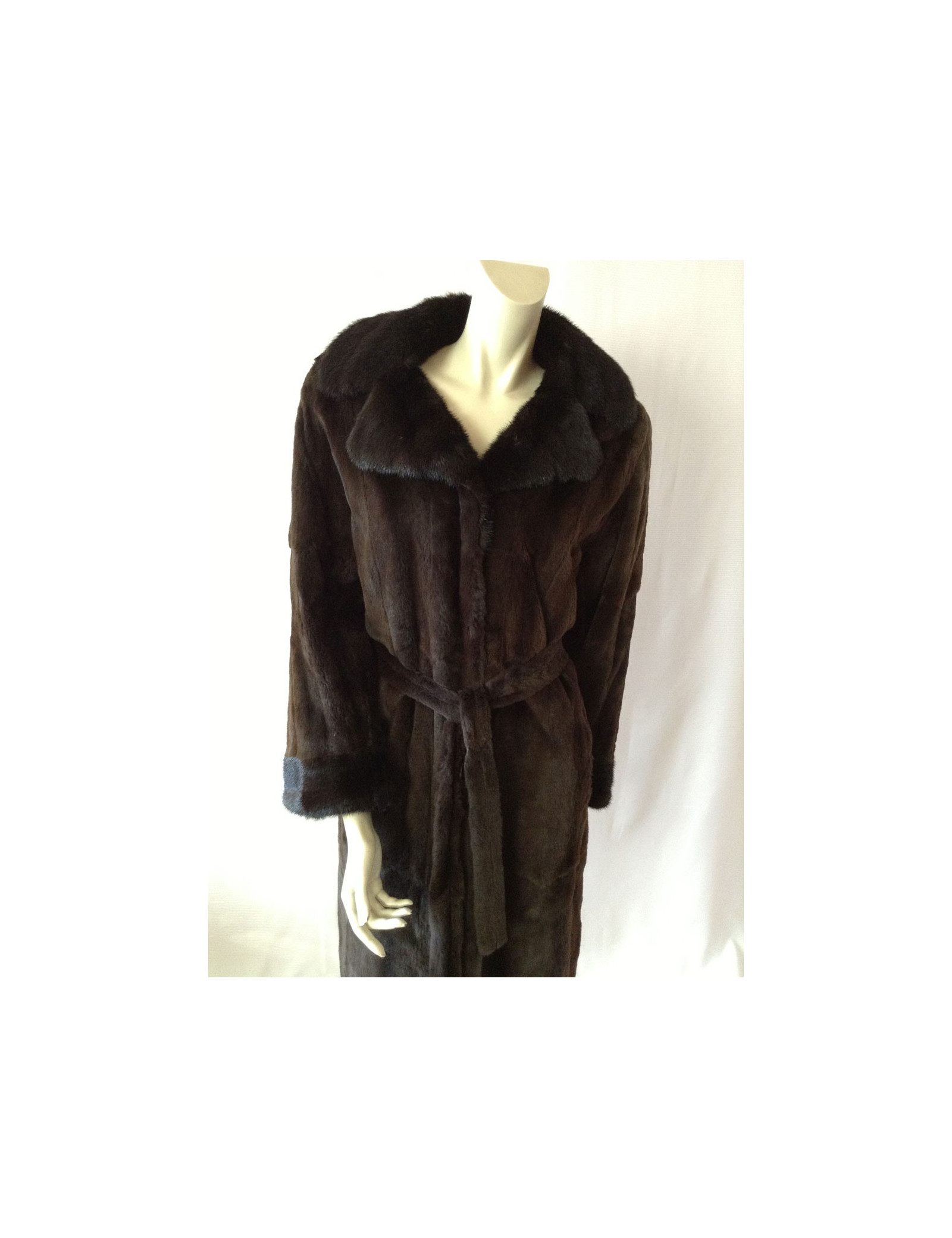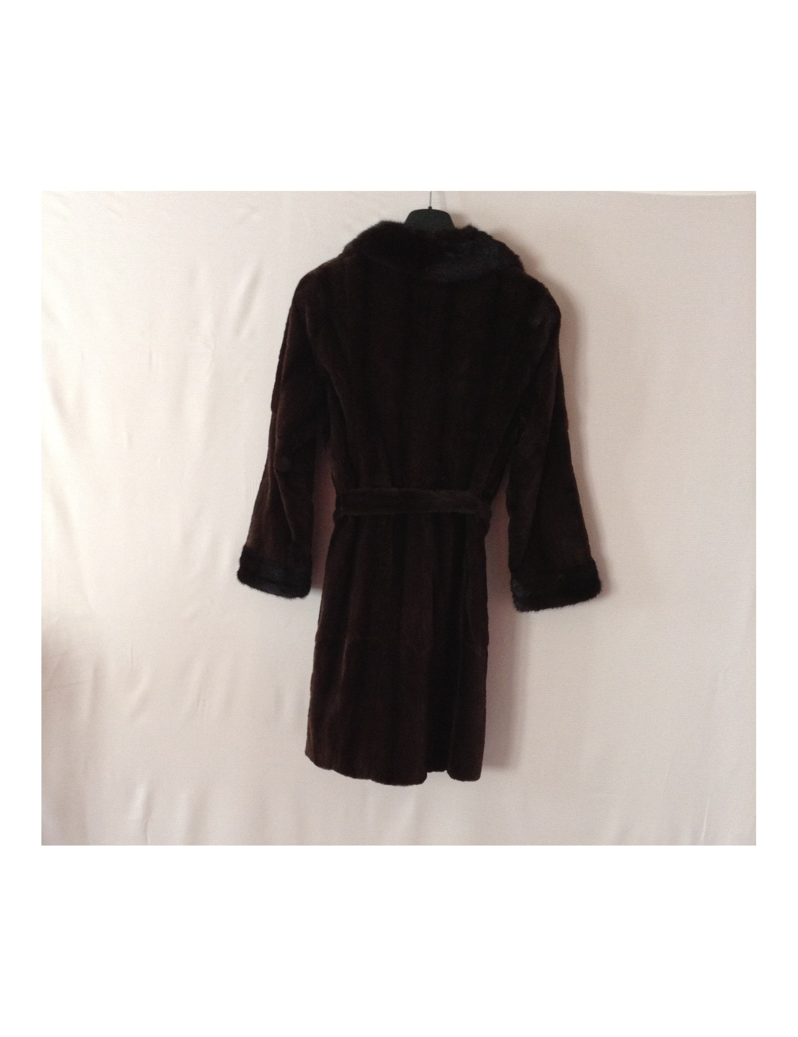 Mink coat shaved Brown with matching belt, collar and sleeves finishes are more Brown dark mink not shaved. This coat size as a 38fr coat without a mark.