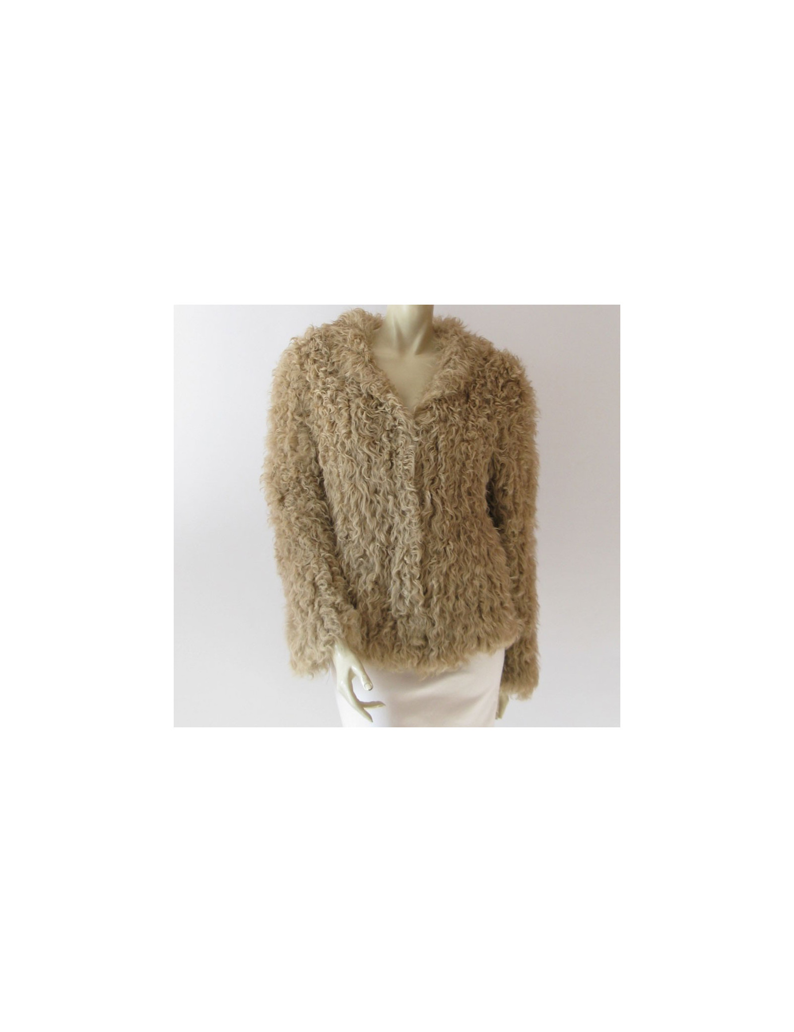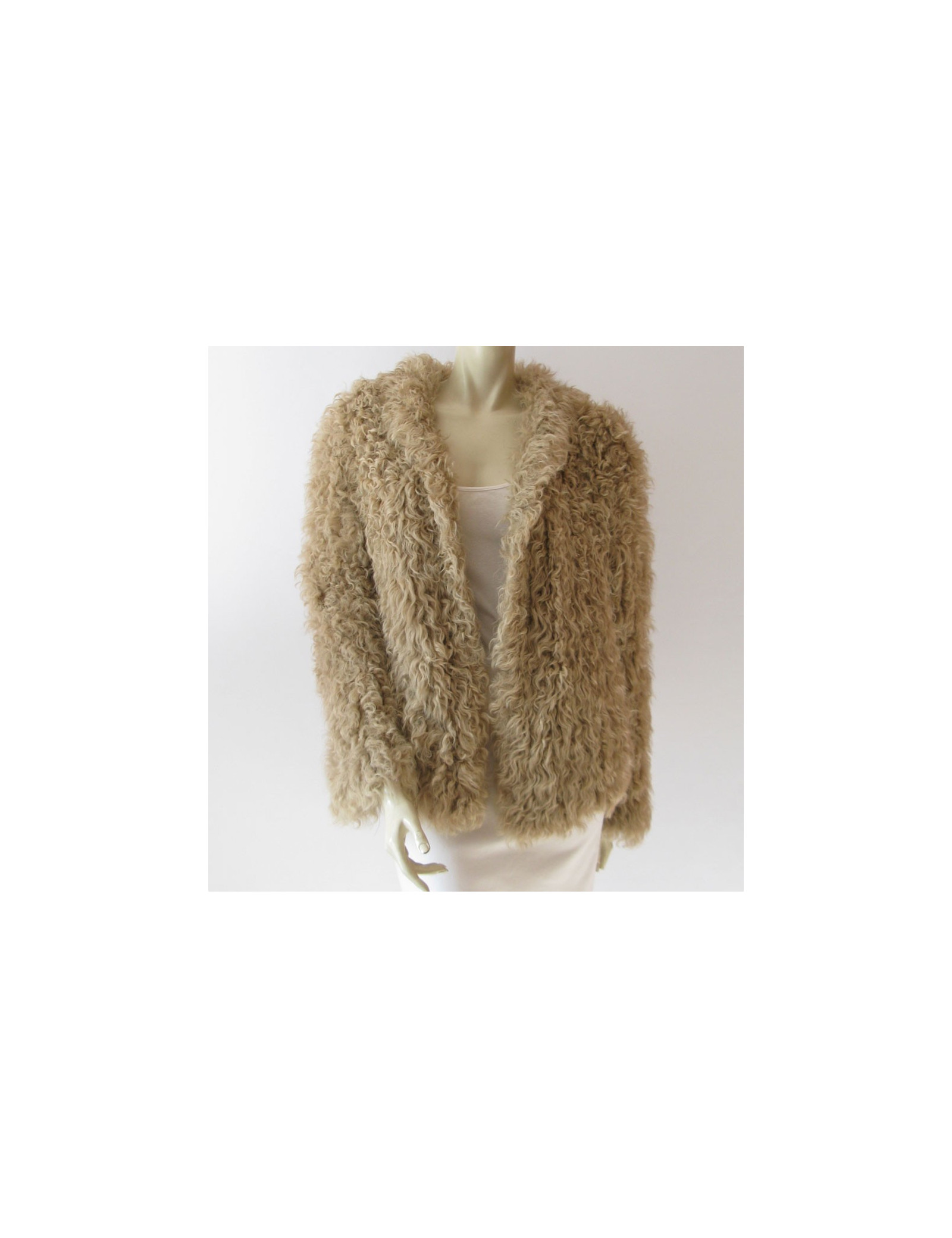 Superb! Jacket SPRUNG brothers "collection feather" in knitted Kalgan lamb. size S (38-40). Integrated hood, natural colour, straight cut, 2 pockets on the size, closing environment by invisible braces. It is 100% lamb fur. Collection: Autumn/winter, Natural colour Dimensions: length: 59 cm, lchest width: 56 cm,length of sleeves: 60 cm, Build: 38 cm