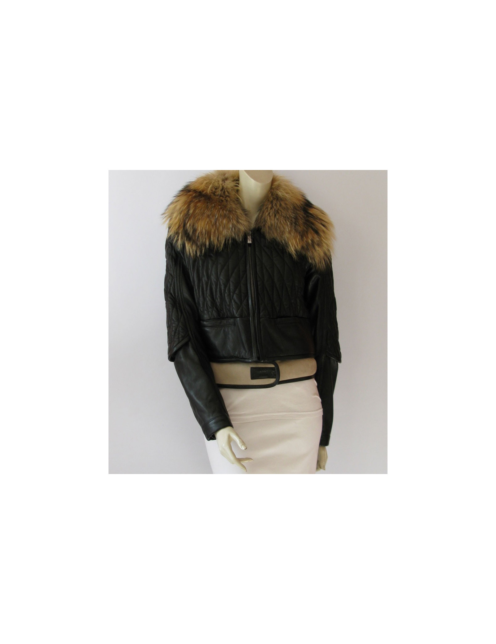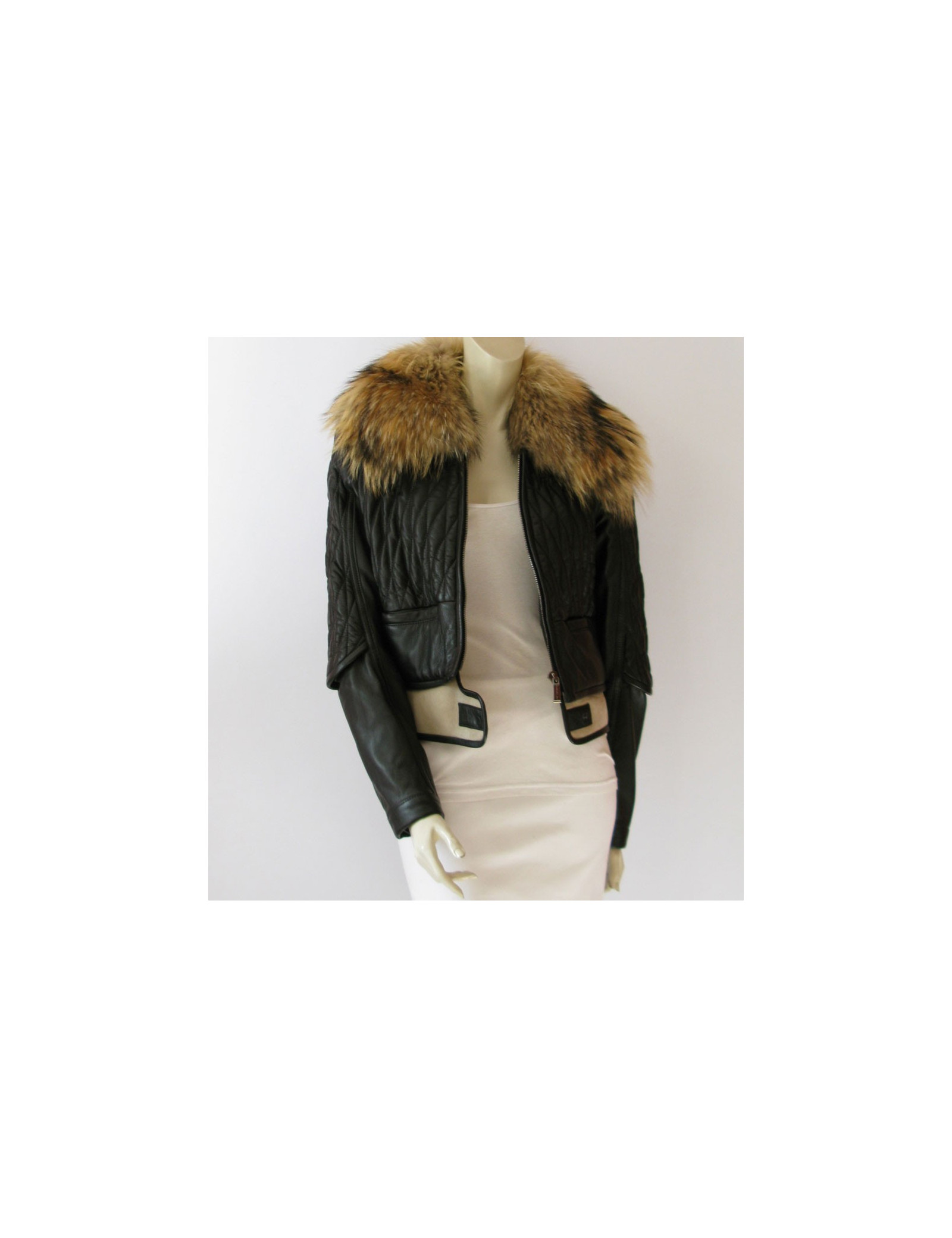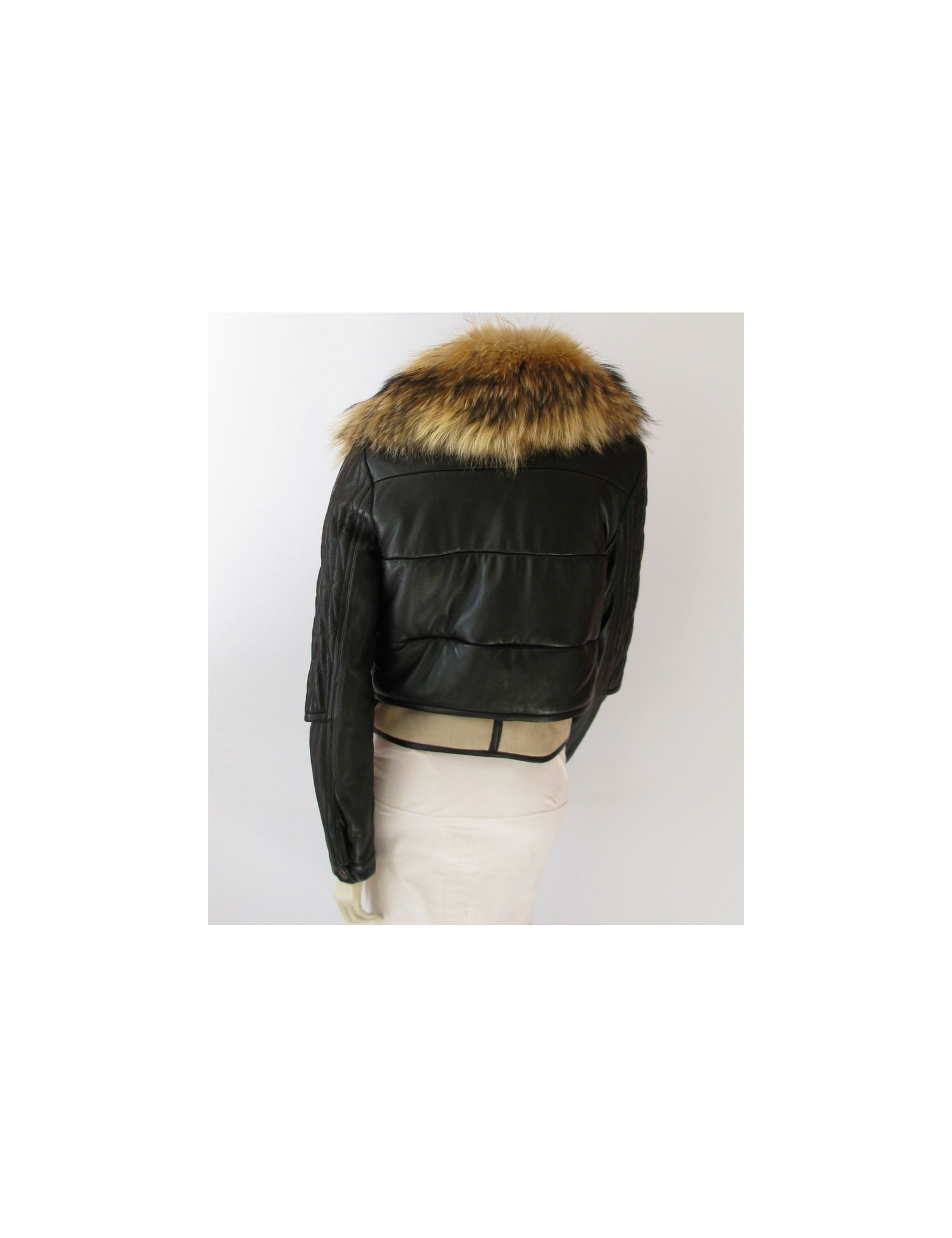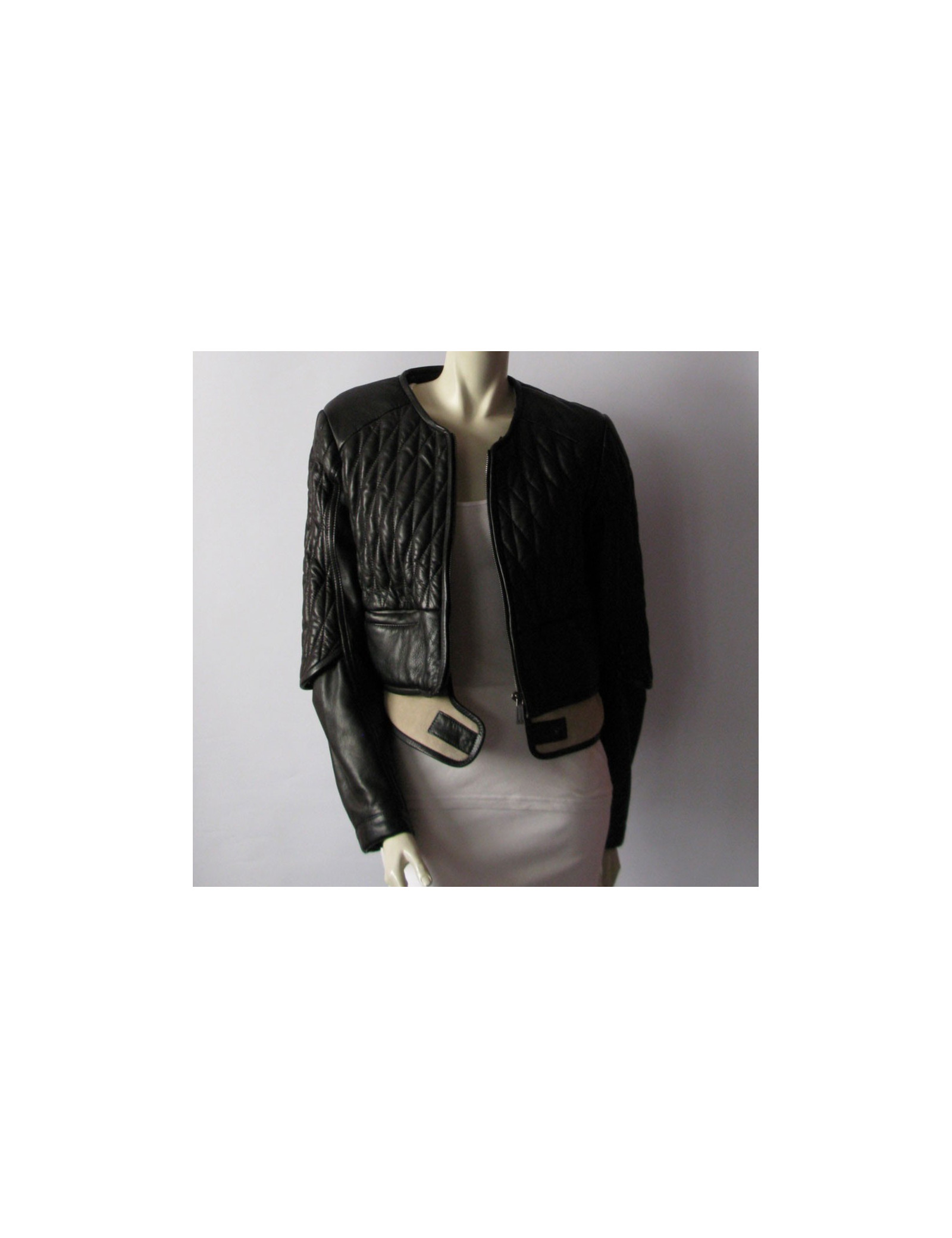 Rock Chic! Black quilted leather, jacket Biker BARBARA BUI T40FR removable collar Marmot in Russia, long sleeves, slightly adjusted cut. At the bottom of the band jacket contrasting suede off-white with setbacks in sheep and closing pressure. Pockets on the front. Wide zipper to the liveried "Barbara Bui", silk noire.100% lamb central interior. 100% silk lining. Recent collection: autumn/winter Length: 51 cm, Chest width: 49 cm Sleeve length: 66 cm, Build: 40 cm