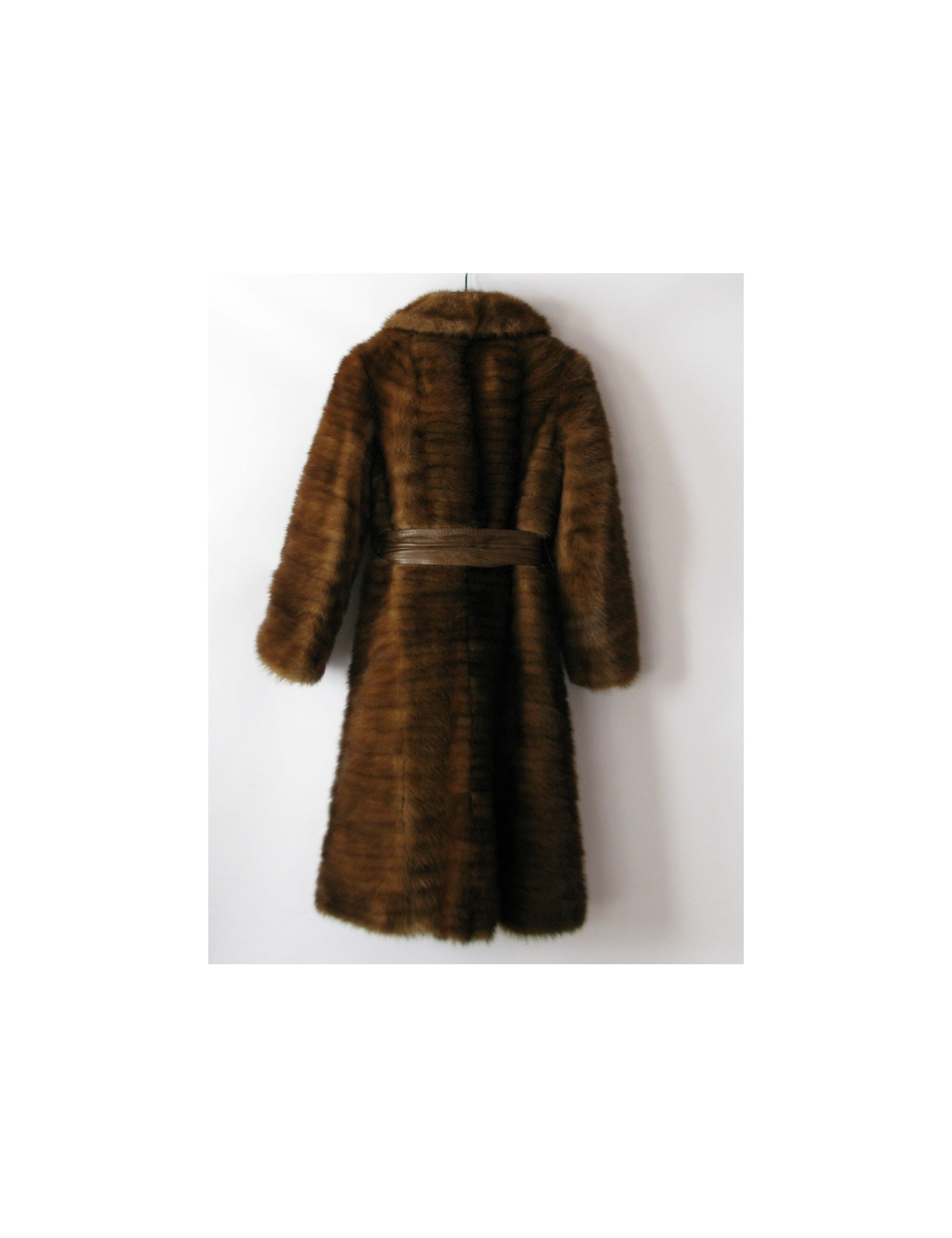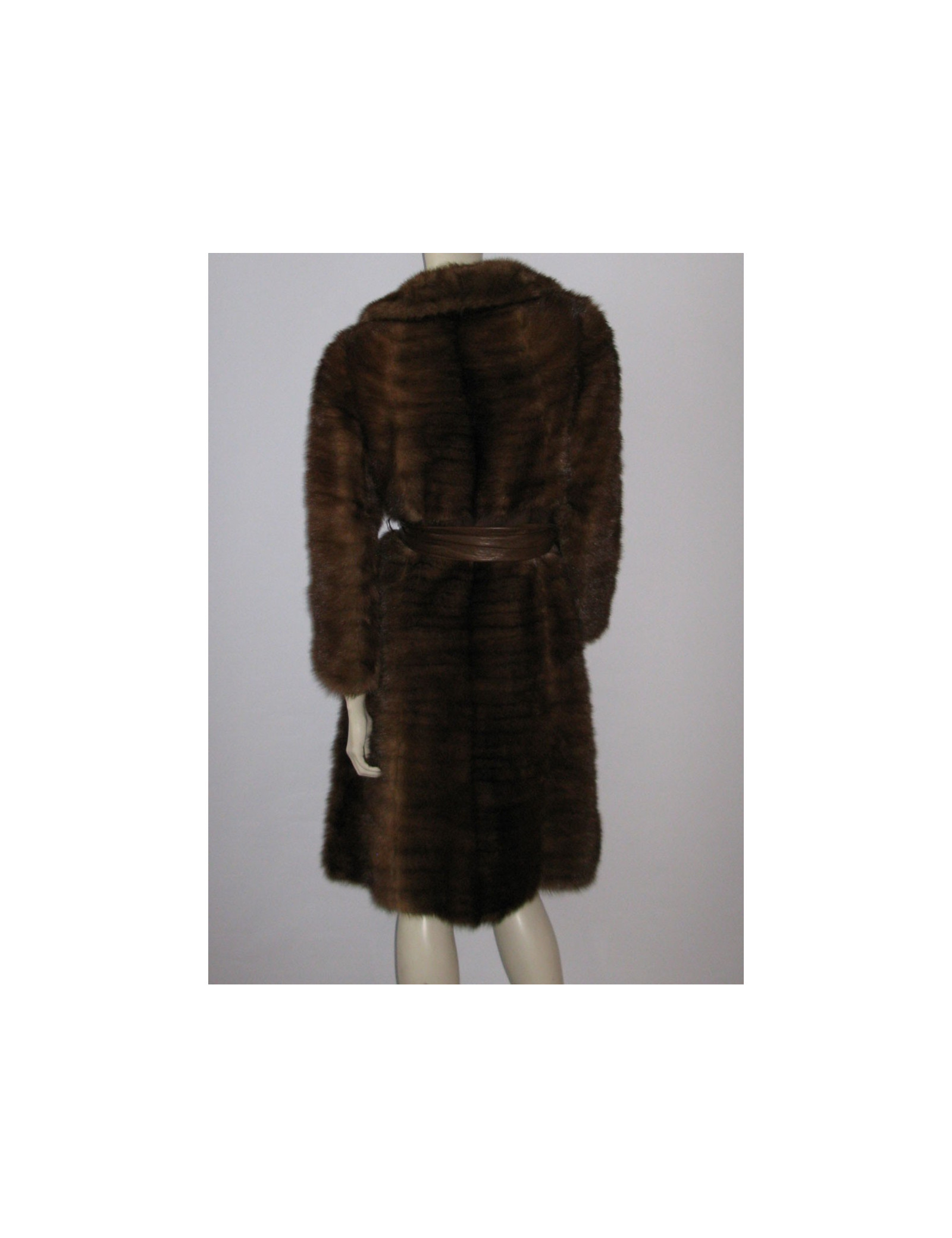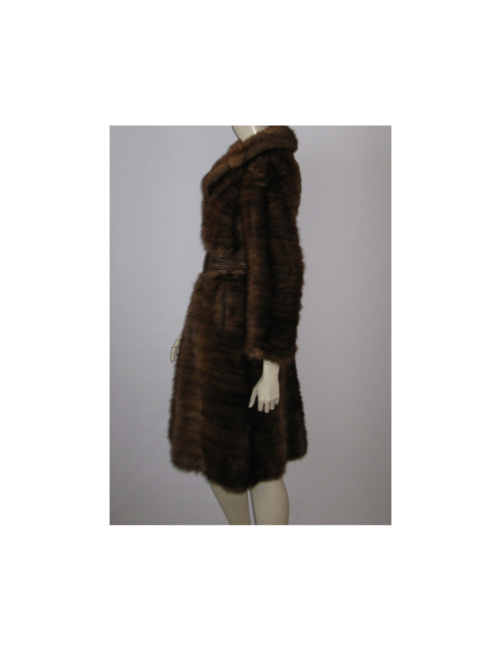 Splendid! Coat of mink year 70' Brown T36Fr, semi-long, notched collar, long sleeves. Mink female worked horizontally with a belt and a brown leather band built around the size. Closure by hooks. Pockets on the sides. 100% mink.