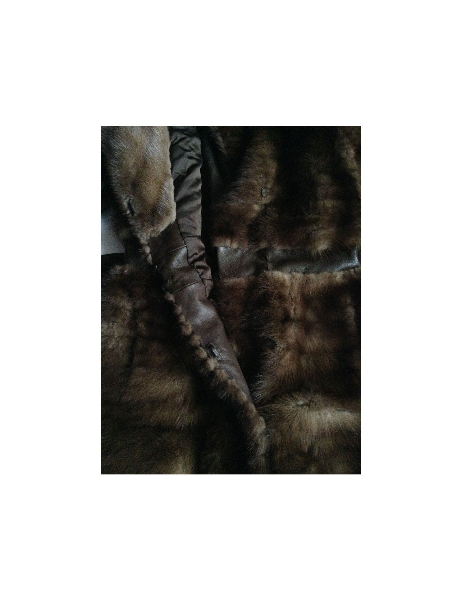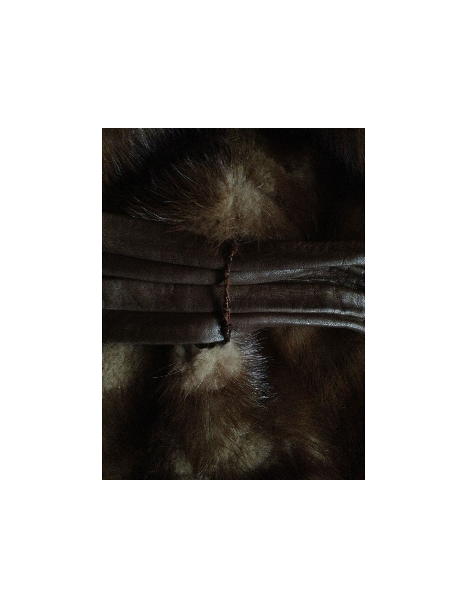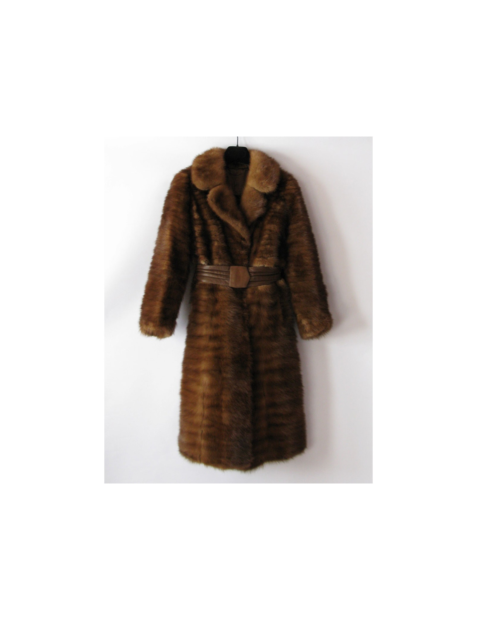 Splendid! Coat of mink year 70' Brown T36Fr, semi-long, notched collar, long sleeves. Mink female worked horizontally with a belt and a brown leather band built around the size. Closure by hooks. Pockets on the sides. 100% mink.