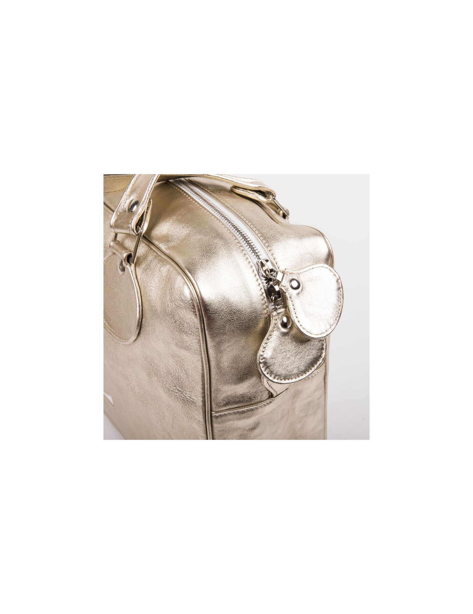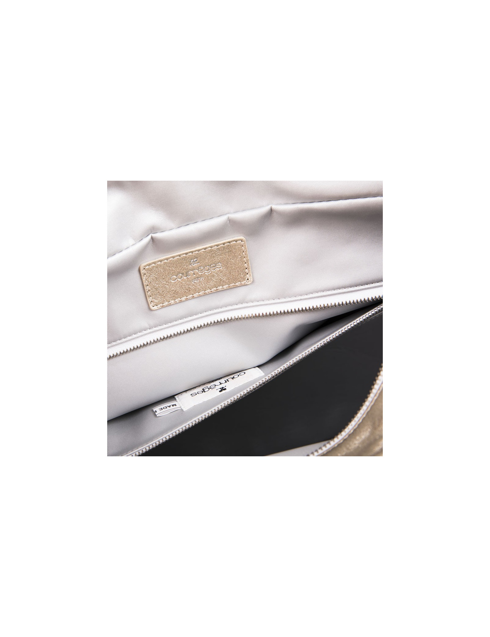Courrèges bag in golden soft smooth lamb leather. Silver metal hardware. Double zipper.