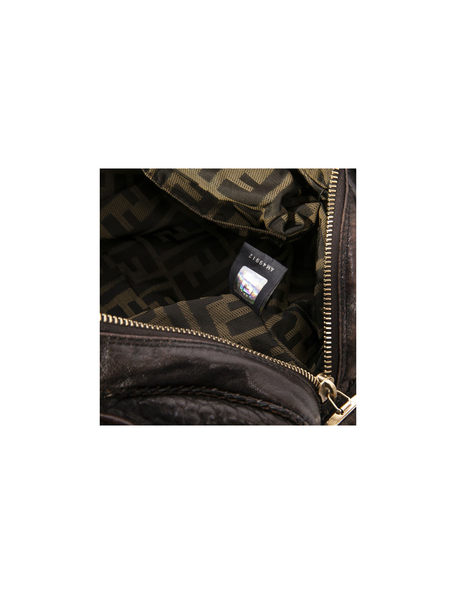 A flat pocket inside. Leather handles braided. Serial number AM49912.
