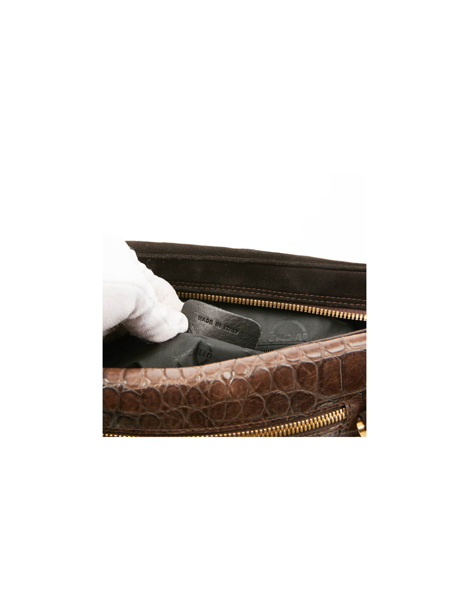 Last items in stock HANDBAGS HERMES Vintage brown Porosus bag HERMES 33659 2,500.00 € HERMES vintage brown Porosus bag Condition : goodMade in FranceGender : womanModel : shoulder bagMaterial :Porosus crocodileLining : smooth brown leatherColor : brownMeasurements : 18 x 22 x 8 cmHandle : 49 cmLetter: B in a circleYear : 1972Hardware : gold finish metal (micro-scratches)Details : vintage, Hermès signature inside clasp, shoulder strap, one... Add to cart