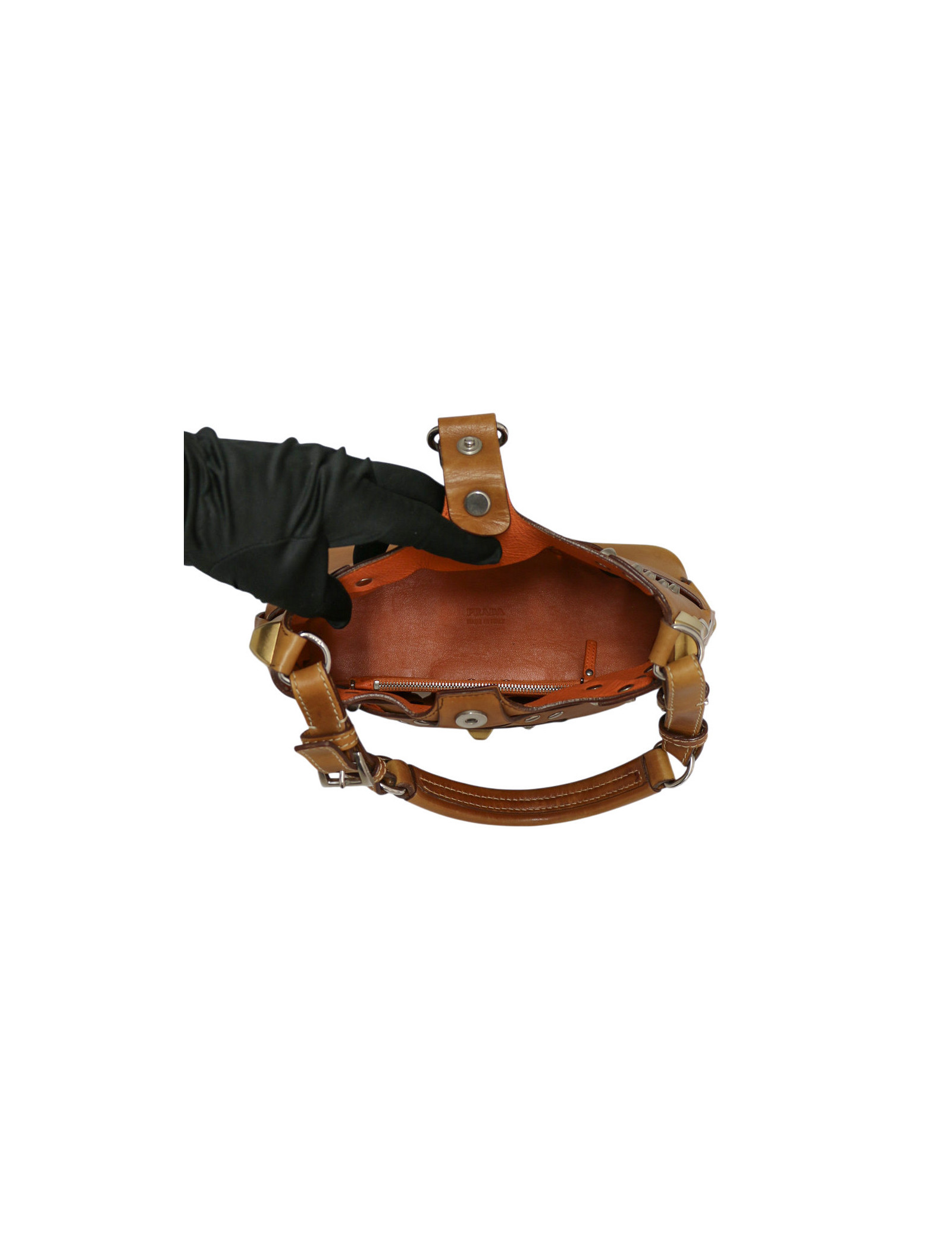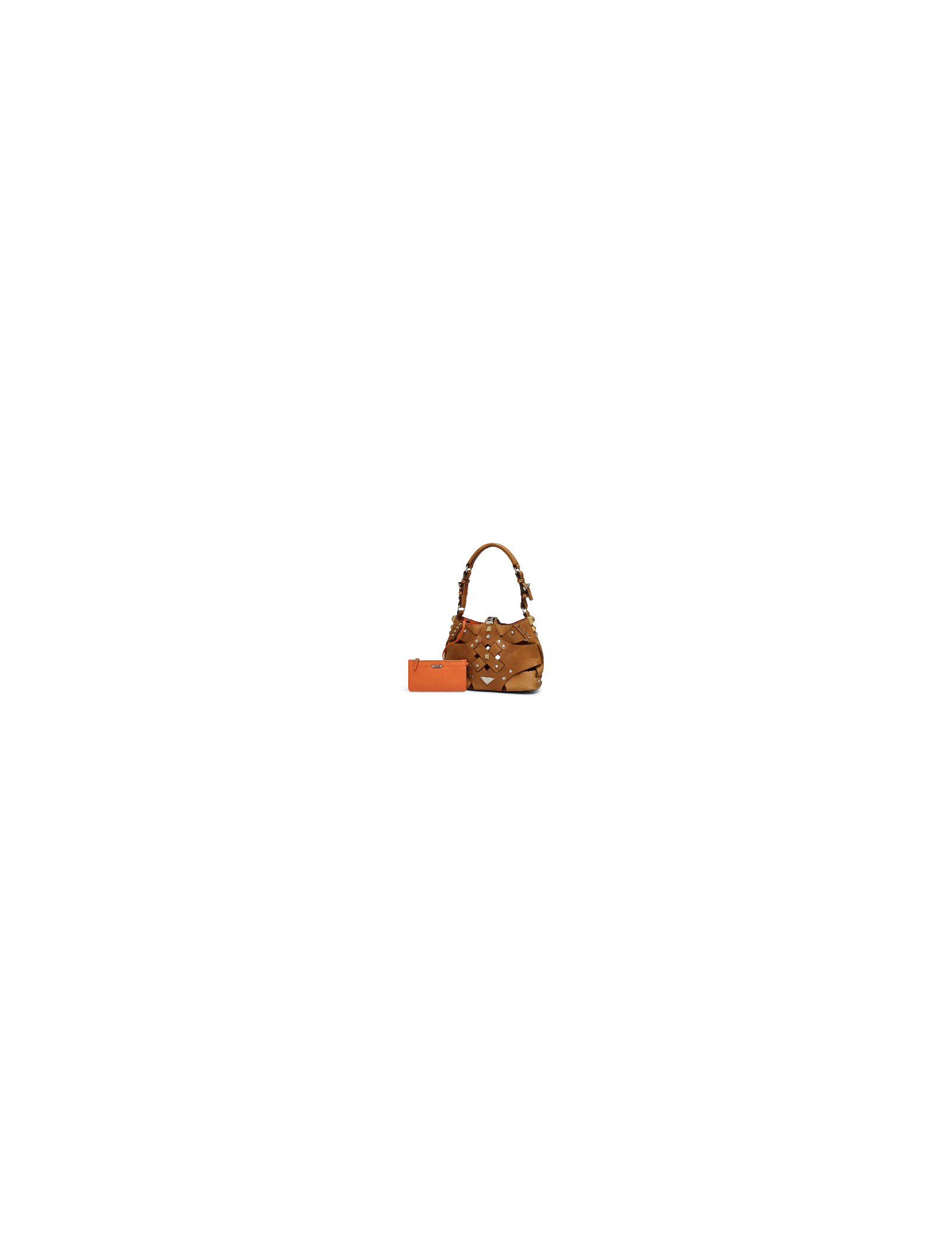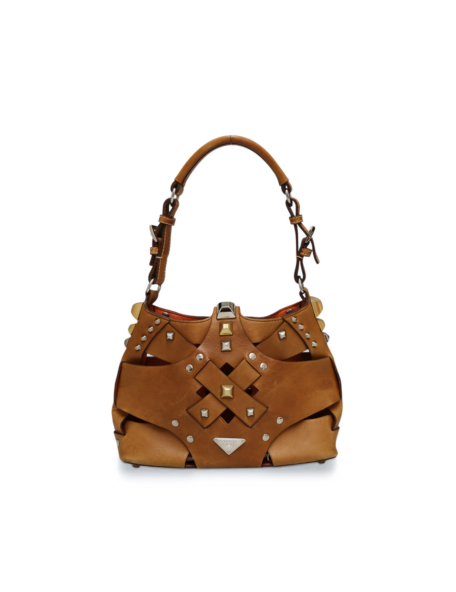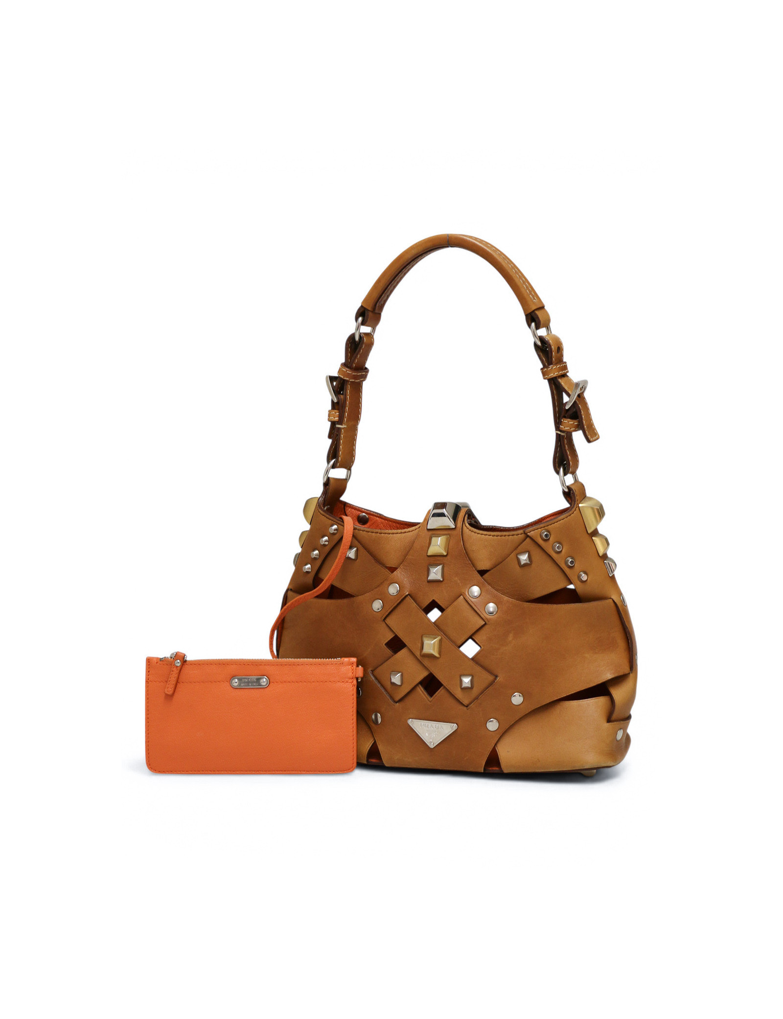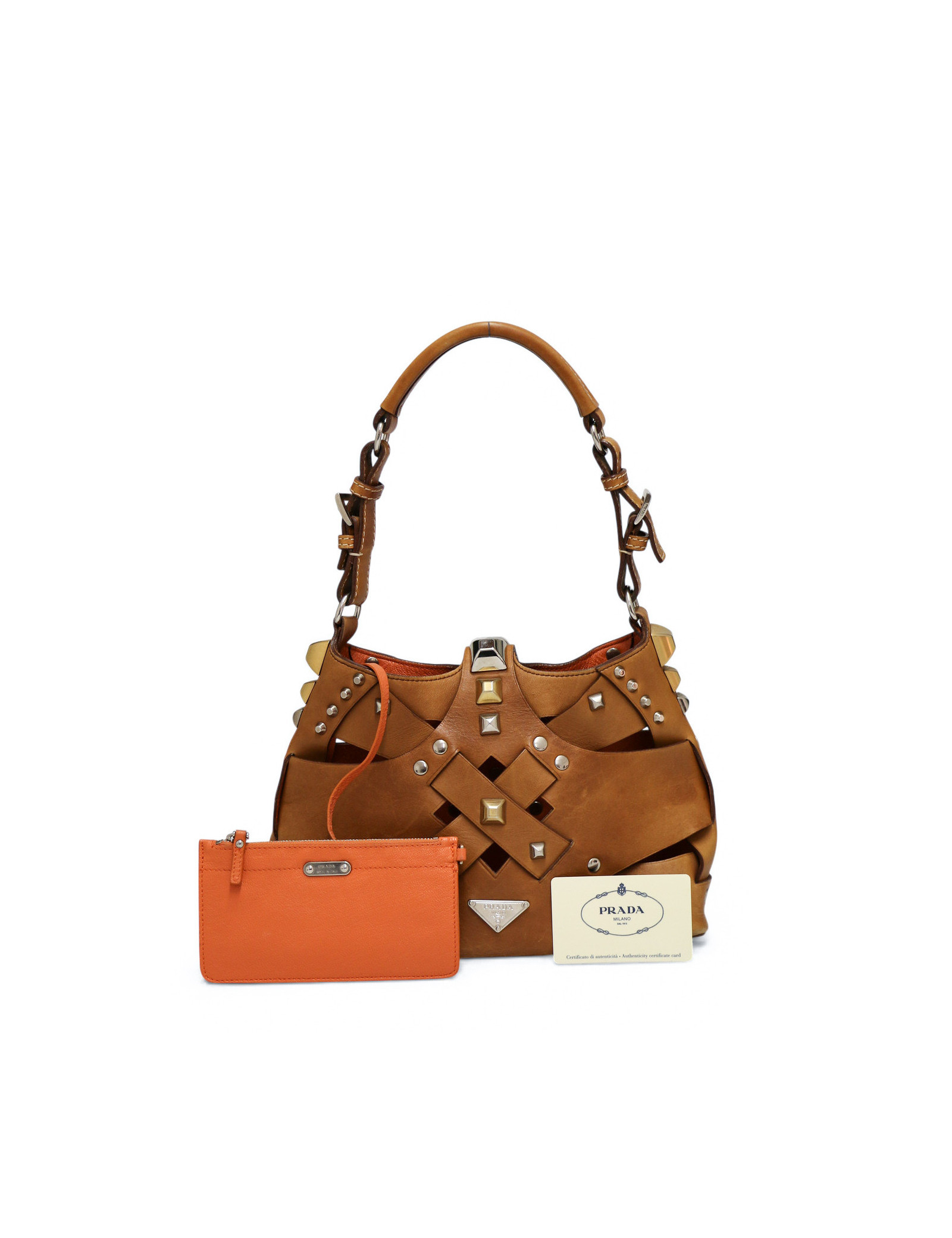 Discover the bold character of this small Prada hobo bag in brown studded leather, an iconic piece with an audacious and refined style. Crafted in brown leather, it stands out with its pattern of gold and silver studs, adding a touch that is both modern and sophisticated. The silver-tone hardware pairs perfectly with the two-tone studs, while the snap-button closure reveals a bright orange leather interior.It is also complemented by a matching orange leather zipped pouch, ideal for organizing your essentials.