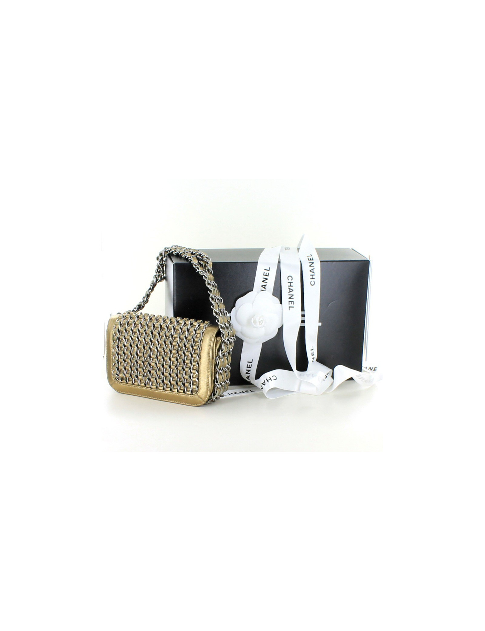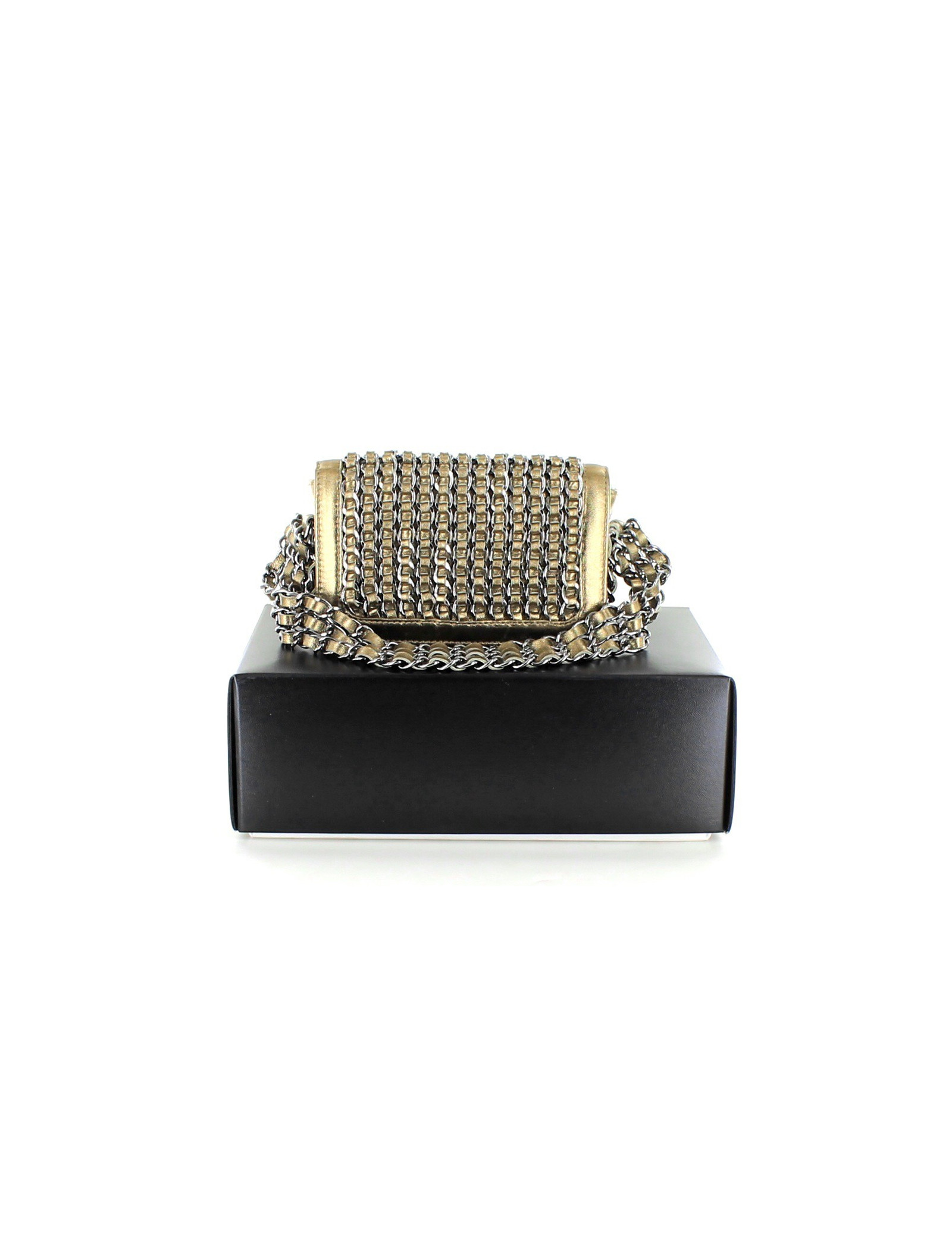 Collector! Small Chanel 'jewelry' flap bag in bronze gilded leather. On the flap There are chains on which are interlaced ribbons in leather. Blackened shiny silver metal hardware.