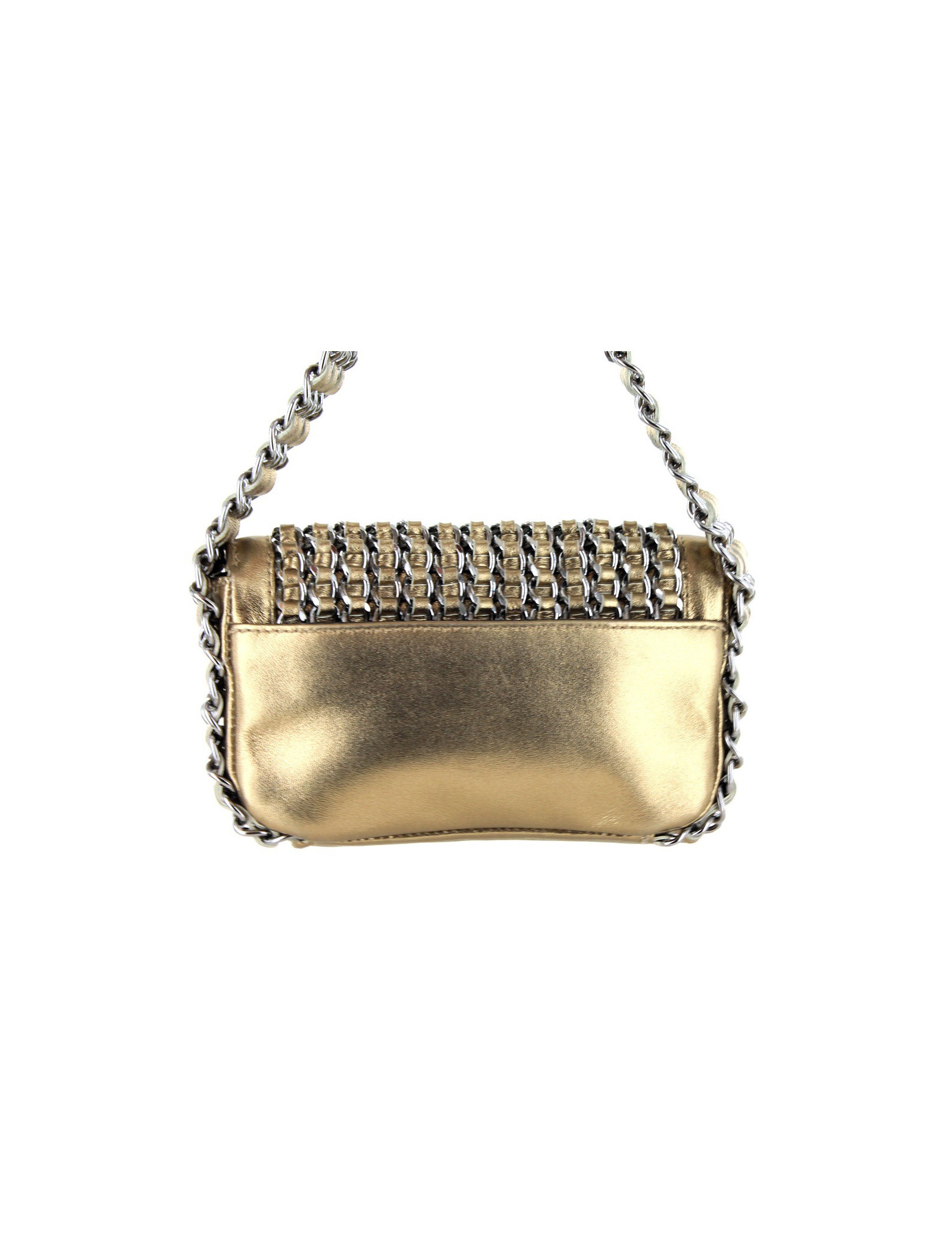 It is worn on the arm or the hand by a shoulder strap consisting of 3 chains intertwined by leather ribbons of 37 cm.