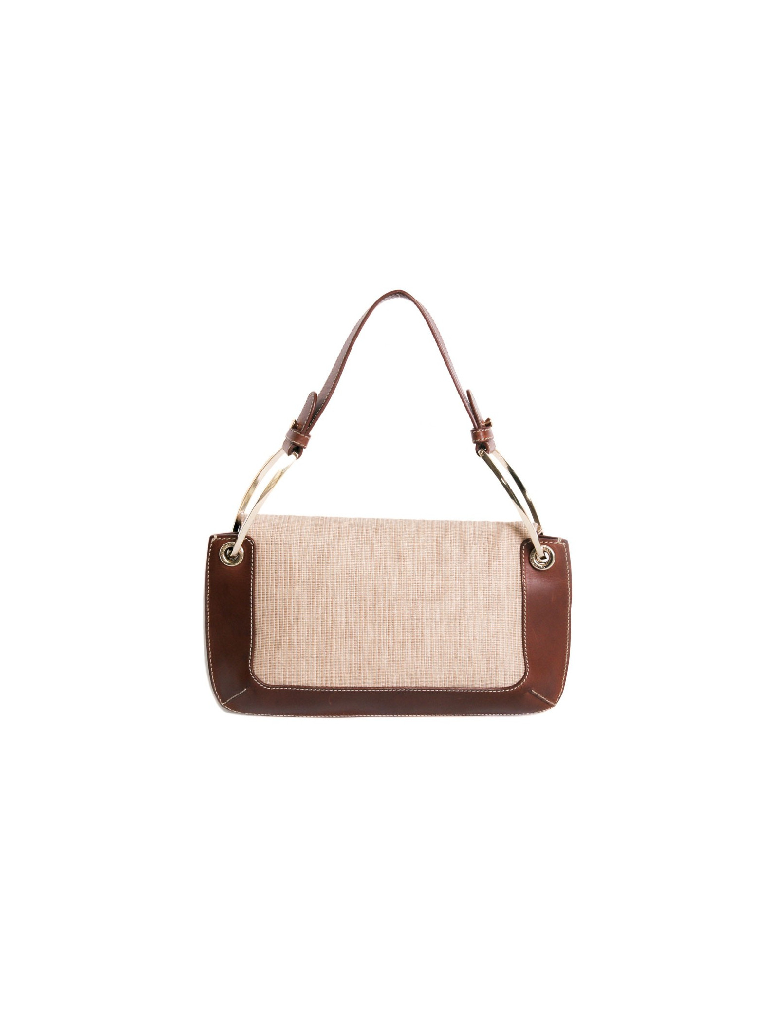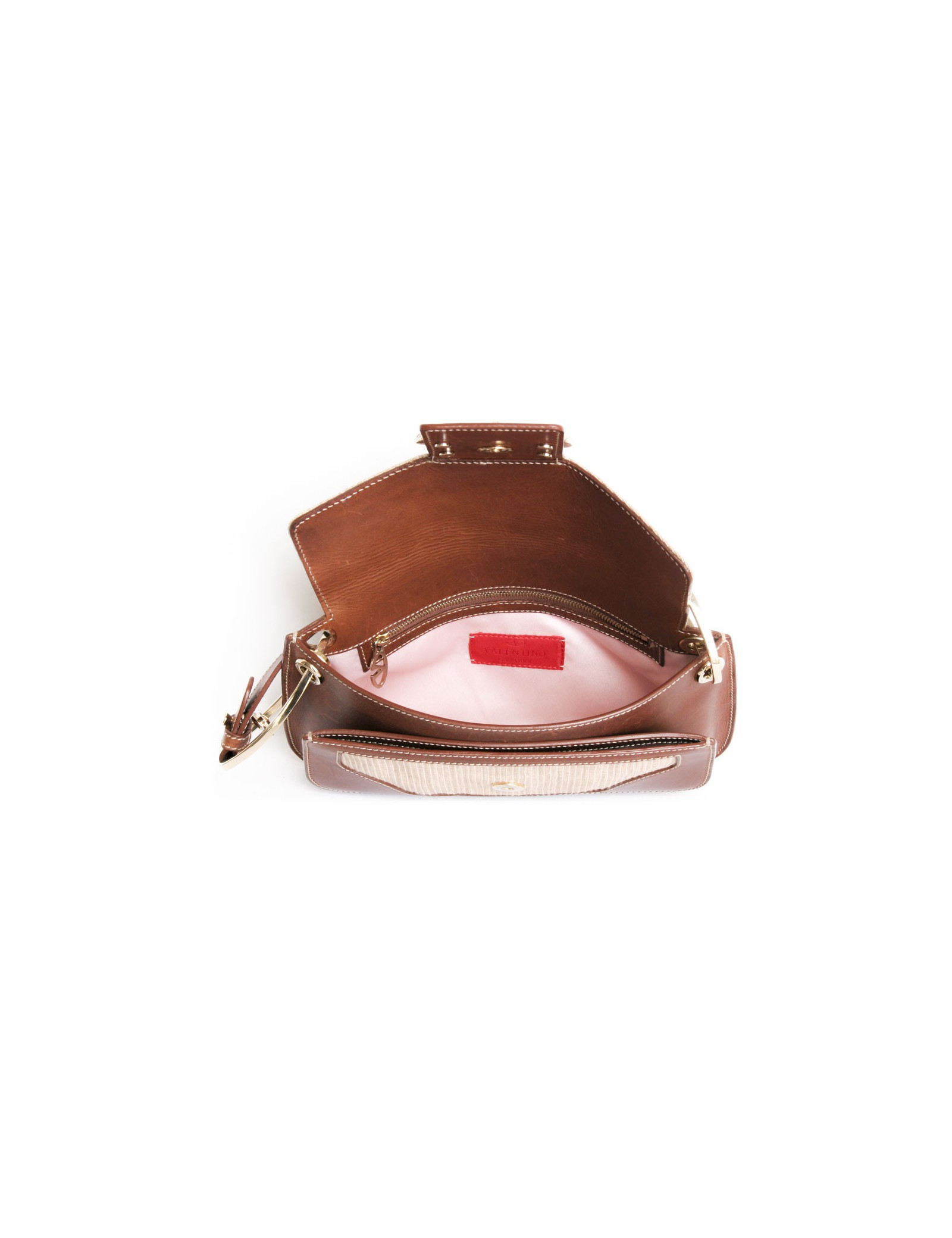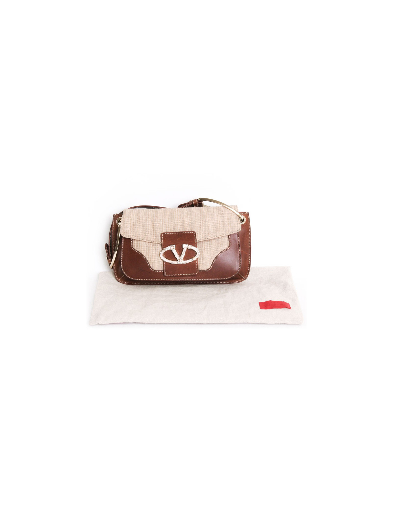 Valentin Garavani bag, fiberglass abaca and cognac leather. It is worn on the shoulder.