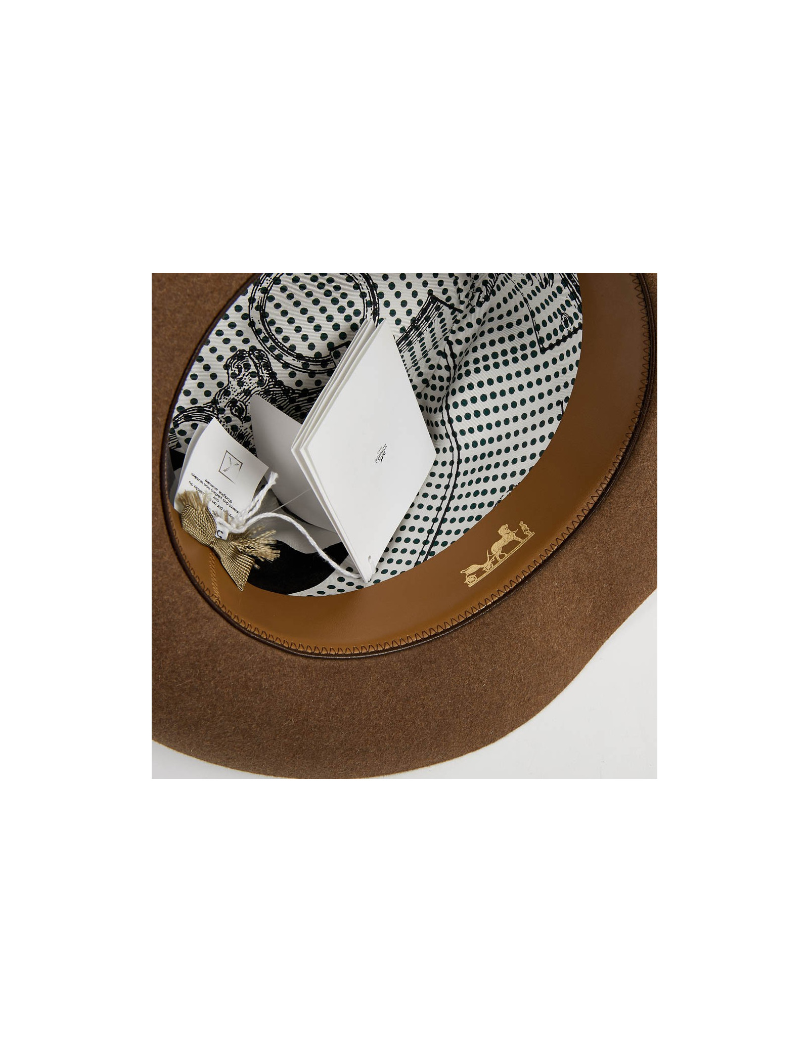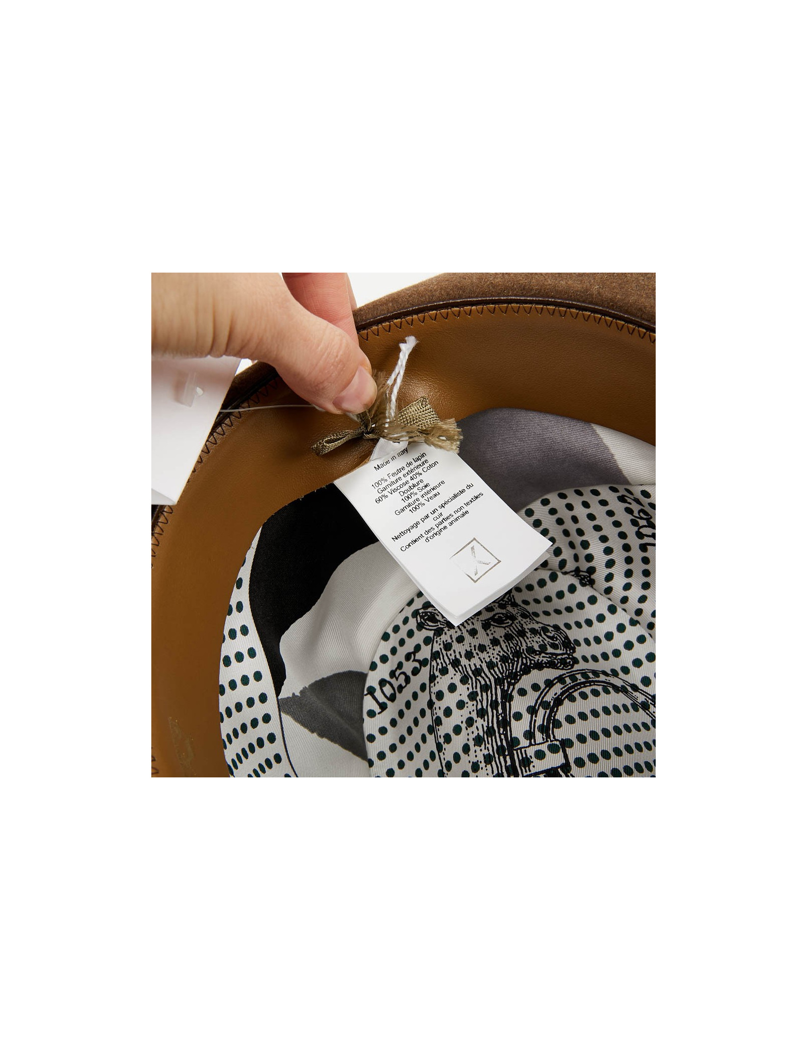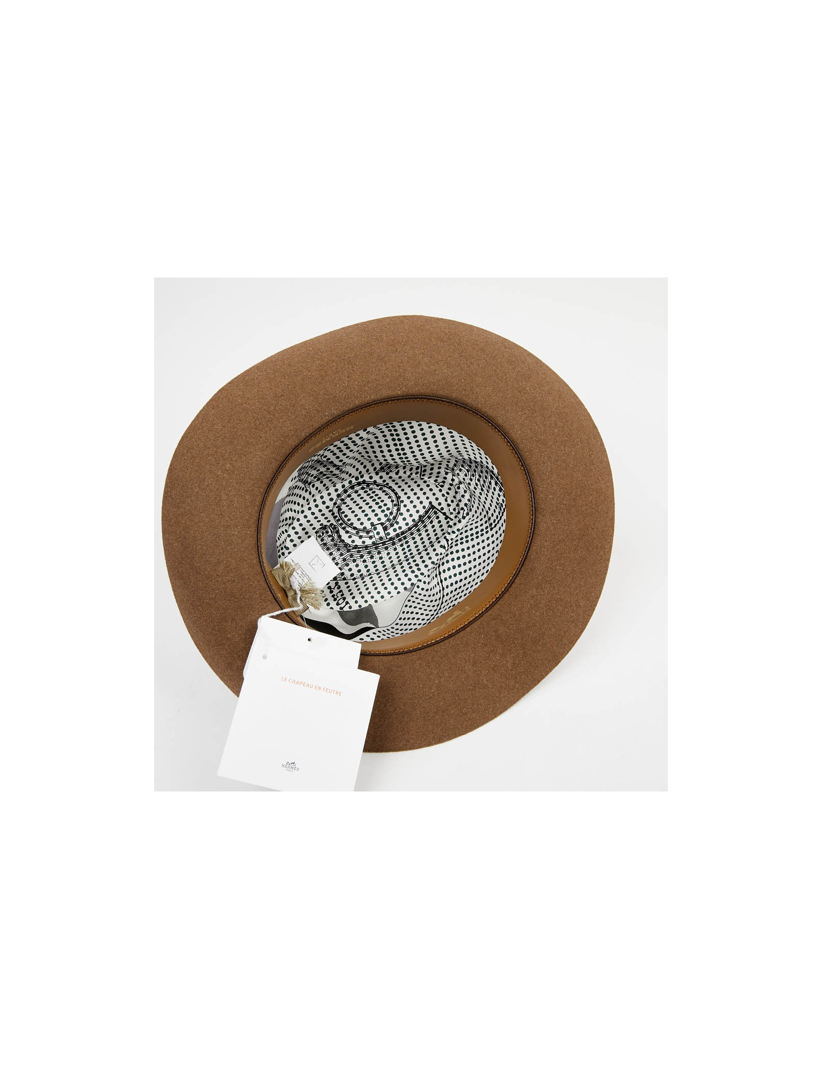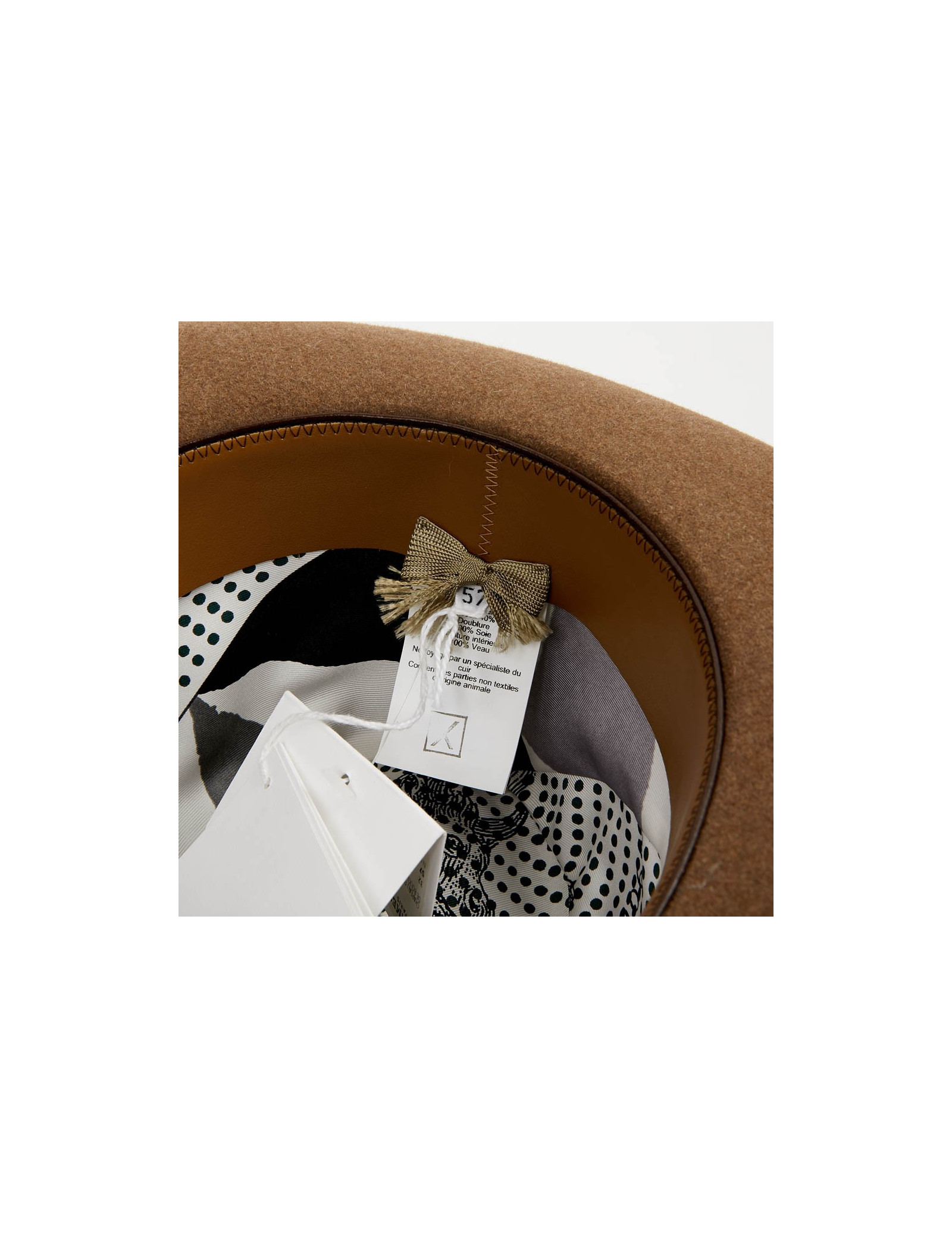 The inside border is made of gold calf leather. The lining is in silk. The outer border is grosgrain beige. This hat is suitable for a woman as well as a man. Its head circumference is 57 cm, the width of the borders is 7 cm and the height 12 cm.