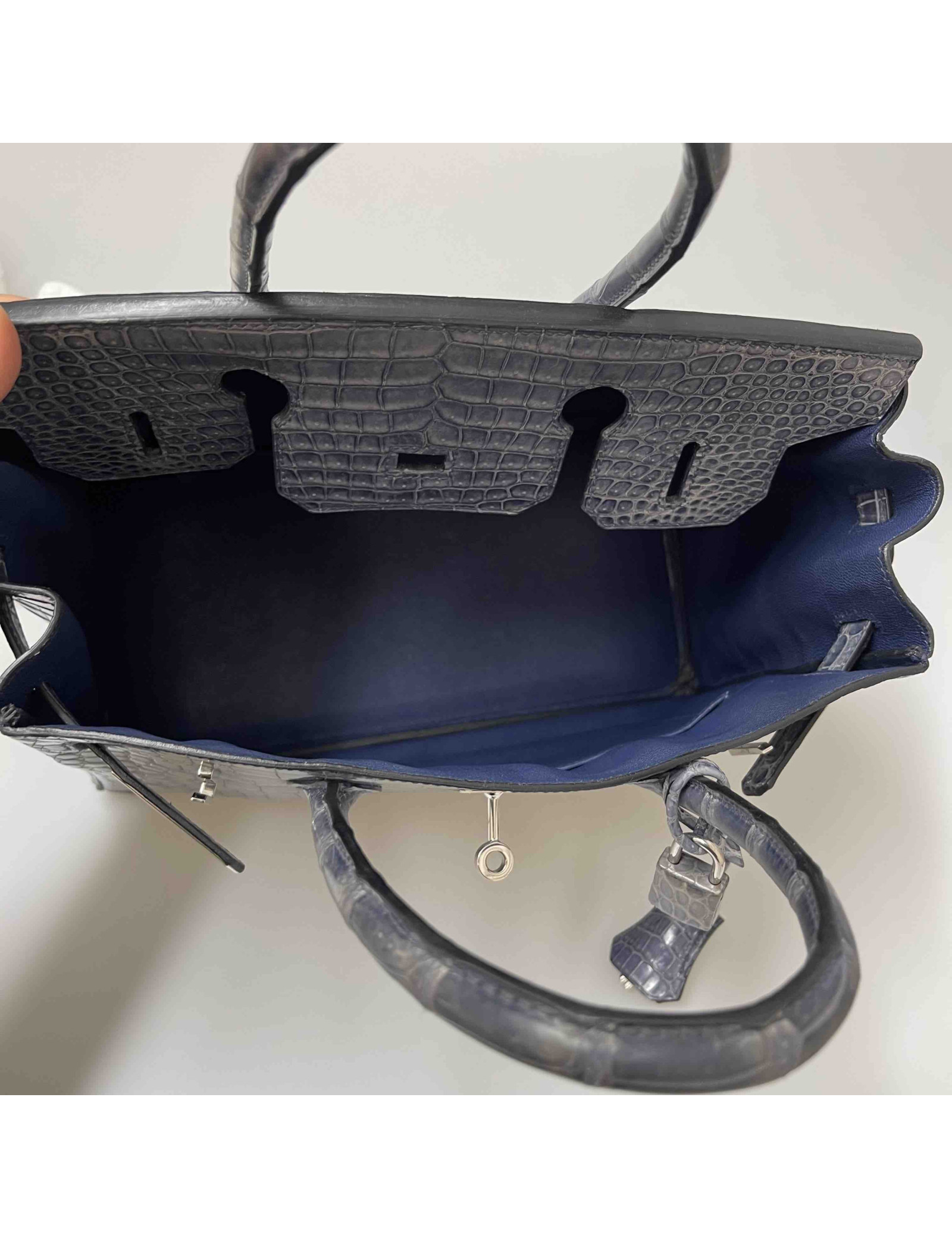-3,500.00 € Last items in stock HERMES BIRKIN HERMES Birkin 30 blue leather and gold hardware HERMES 36836 23,500.00 € 27,000.00 € Hermes Birkin 30 blue Epsom leather Condition : very goodMade in FranceCollection : Birkin 30Gender : unisexMaterial : Epsom grained leatherLining: blue leatherColor : bleu de PrusseMeasurements : 30 x 21 x 16 cmStamp : letter AYear : 2017Hardware : gold finish metal (micro-scratches)Details : padlock, pull-tab, clochette and keys (x2). Can be carried by... Add to cart