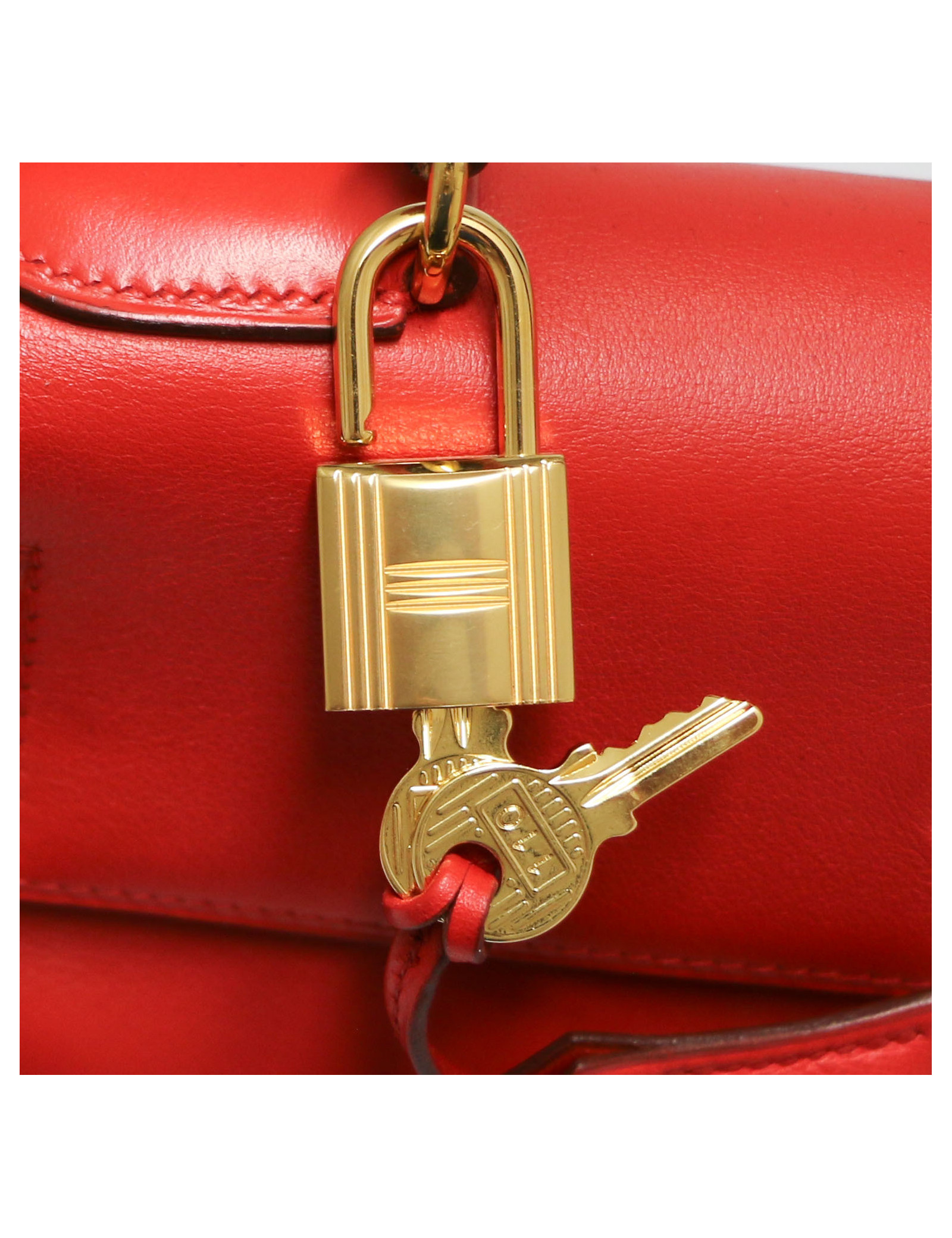 Details : pull tab, bell, padlock and two keys. The plastic is still on the hardware except on the shoulder strap and under the clasp. The leather and corners of the bag are in very good condition.