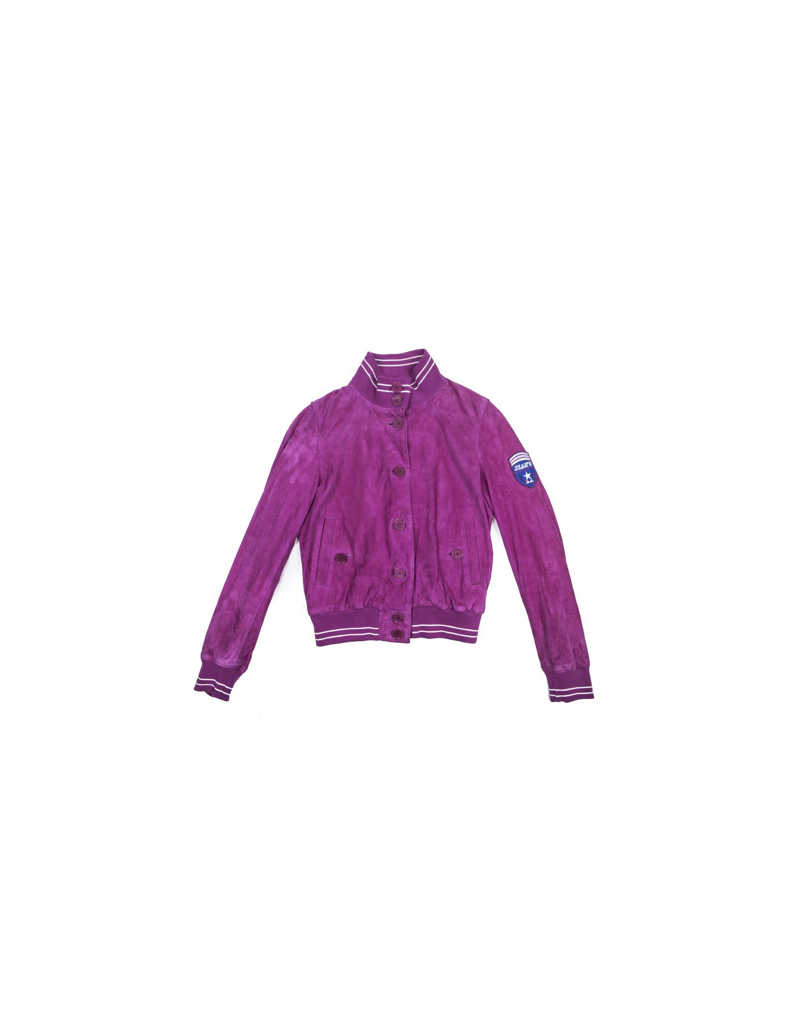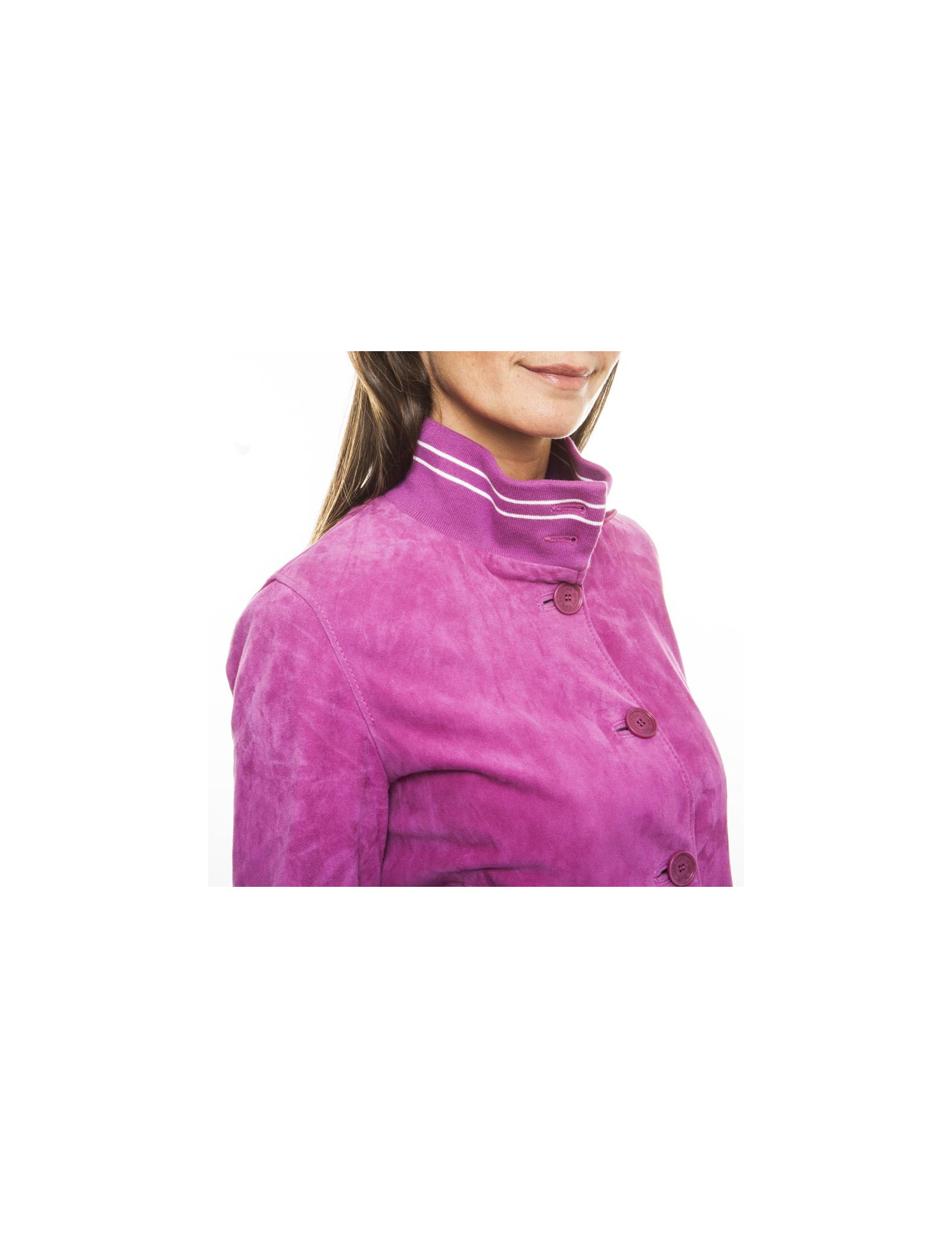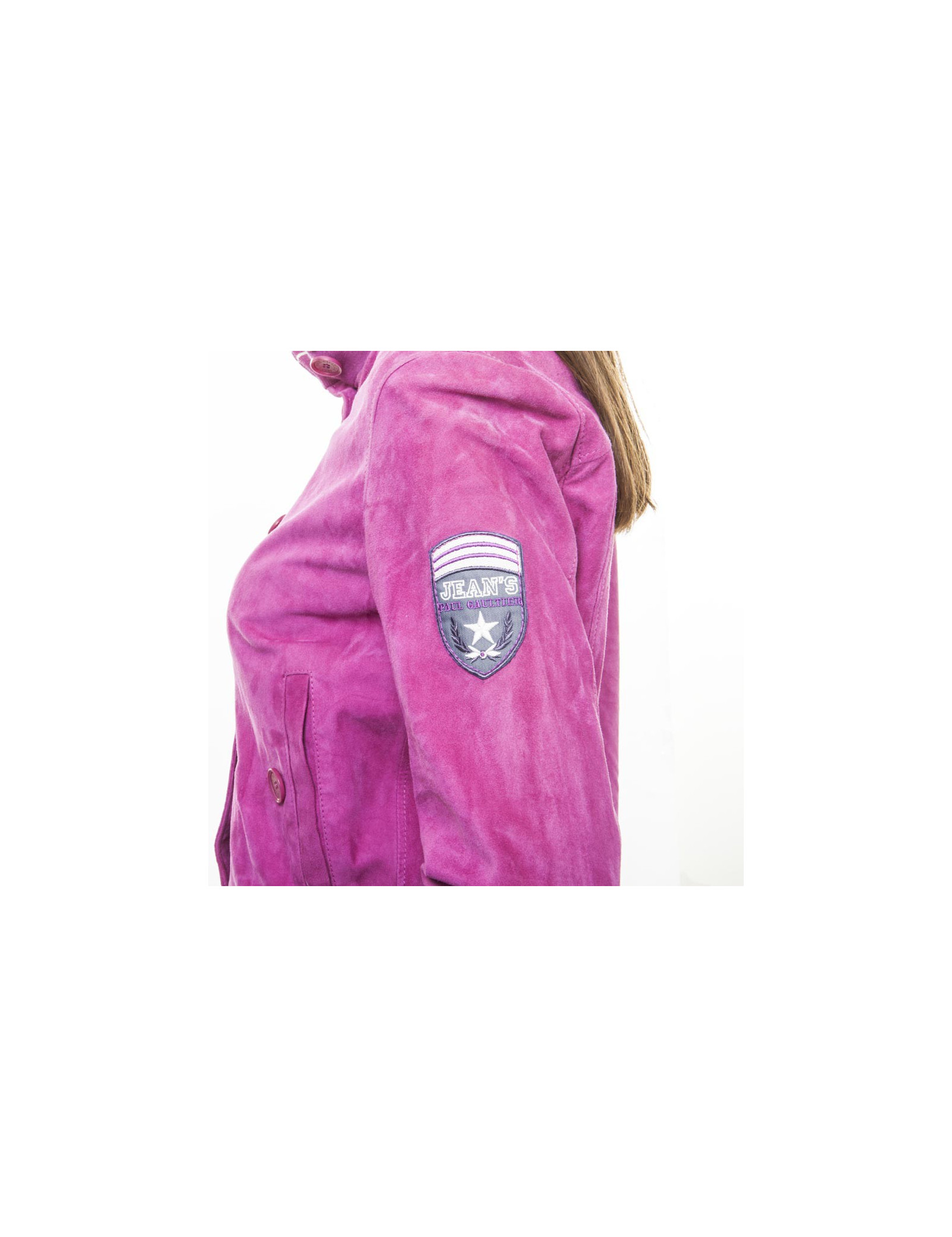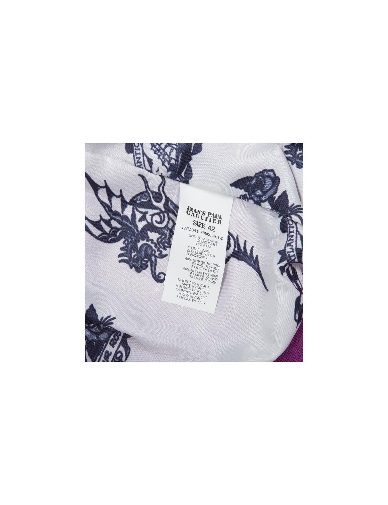 Jean Paul Gaultier jacket in fuchsia velvet calfskin. It closes with 6 buttons, with two pockets. Elasticated at the wrists and lower back. There is a "Jean's Paul Gaultier" badge on the left shoulder of the jacket. White polyester interior with navy blue designs.