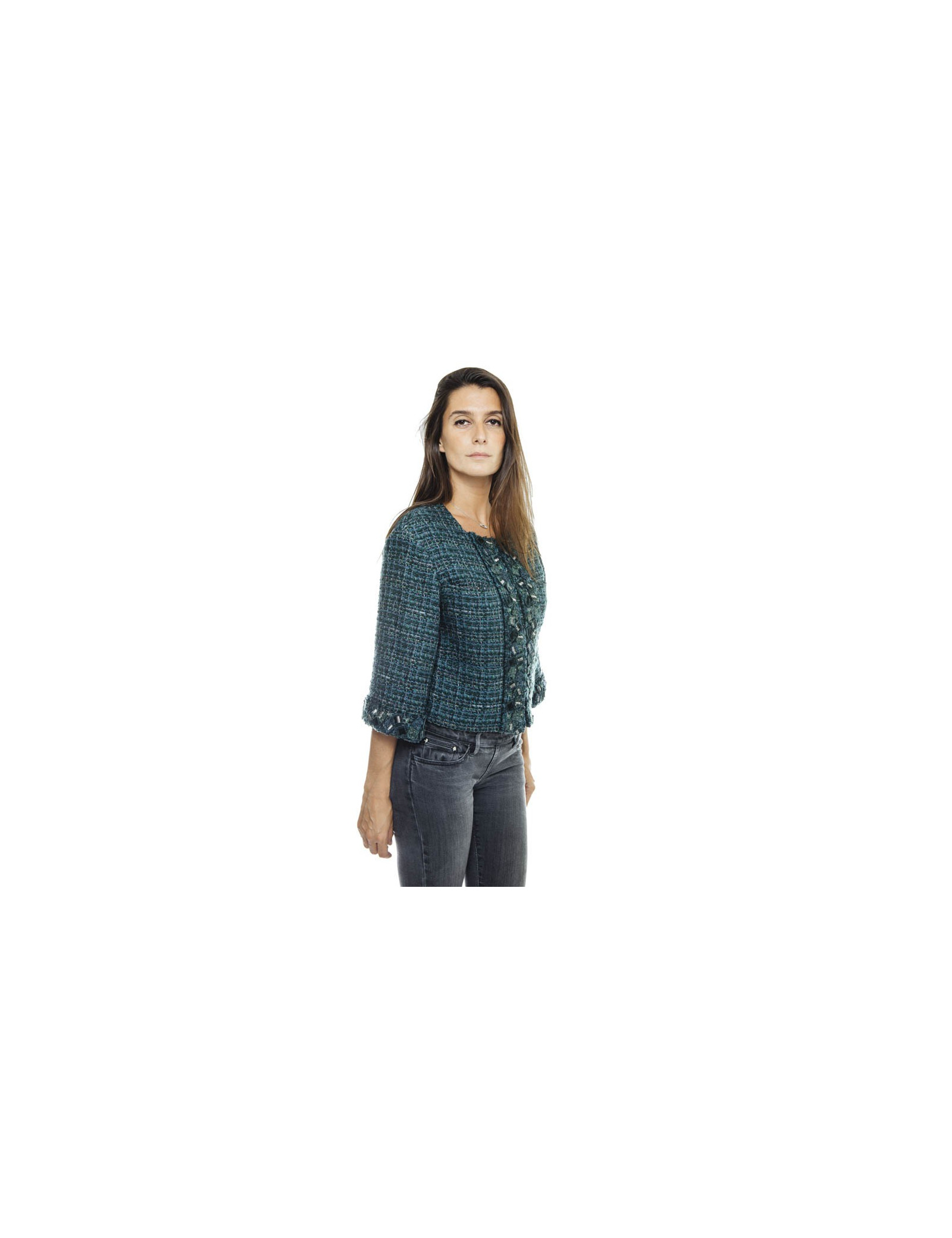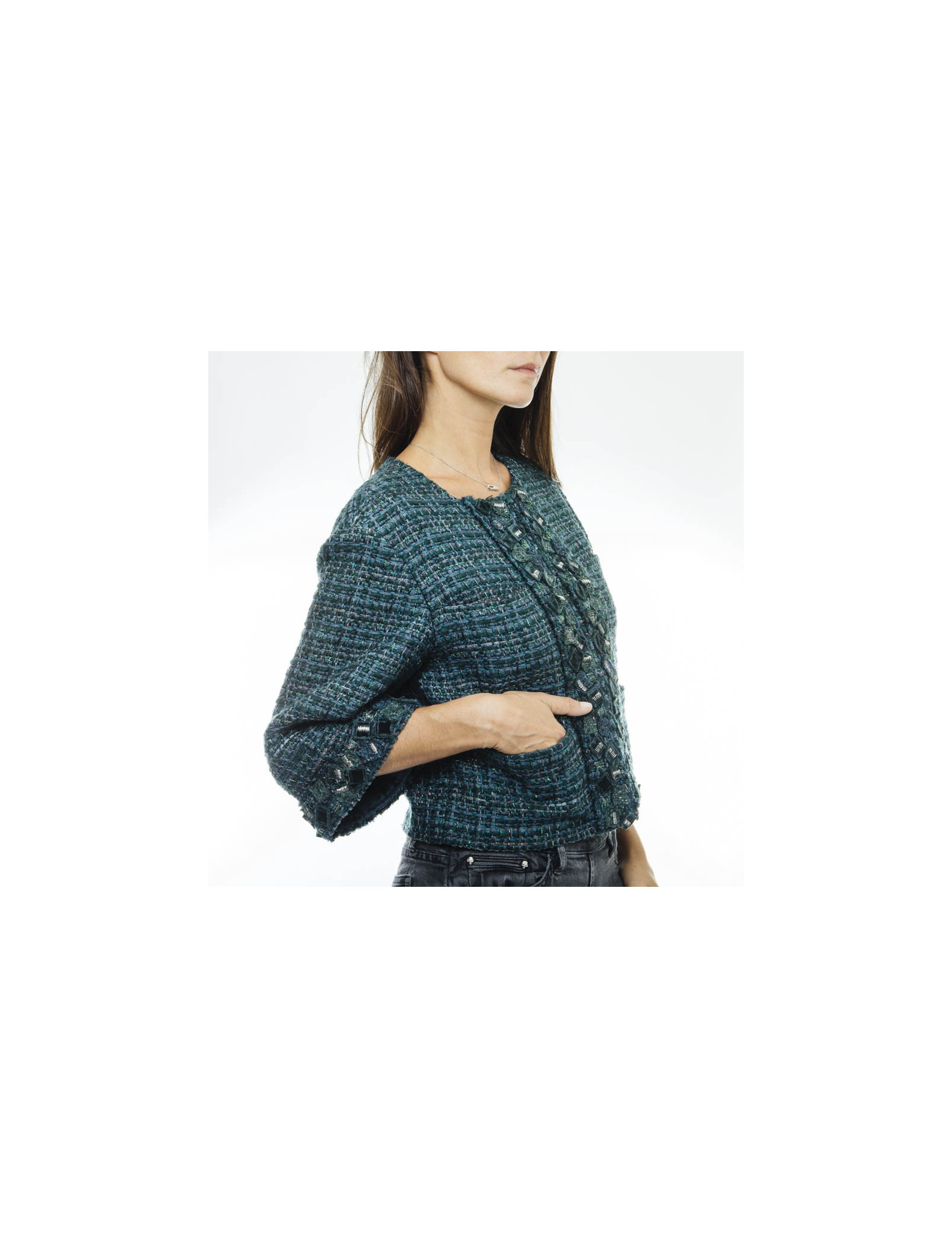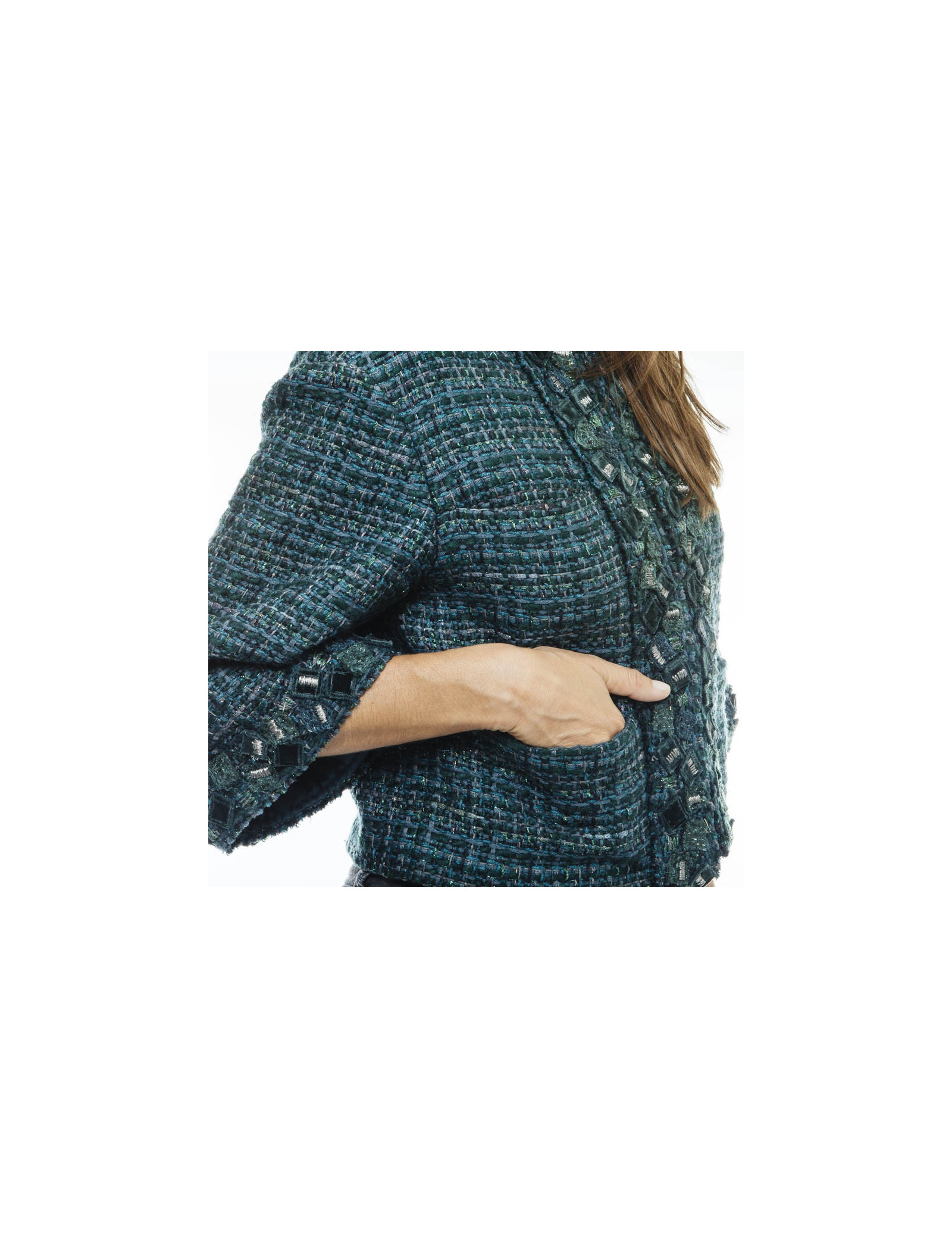 Chanel jacket in green tweed, blue and lamé lurex. The borders are embroidered with multi squares of velvet, green tweed and silver threads. 4 pockets at the front. Closing with 4 invisible hooks.