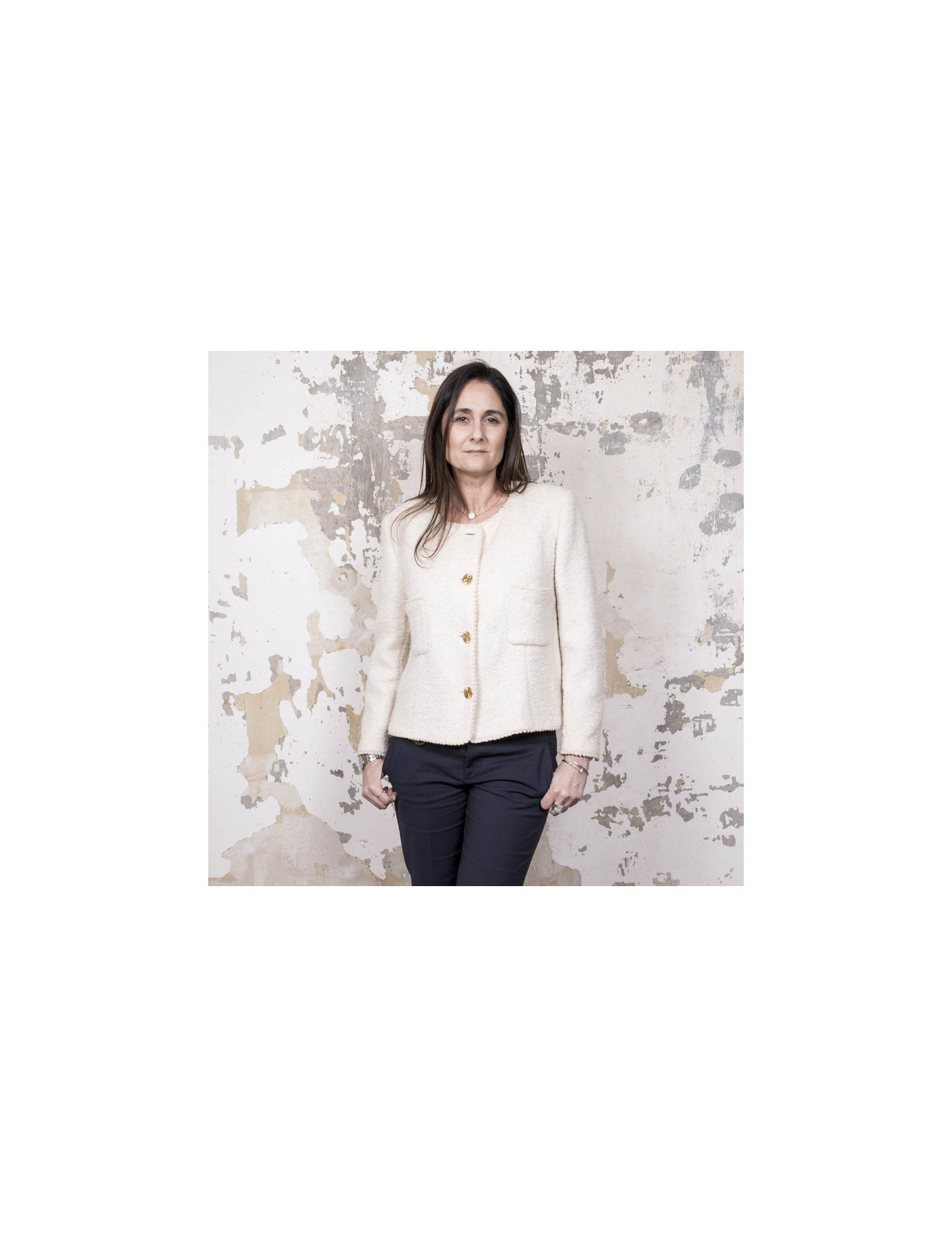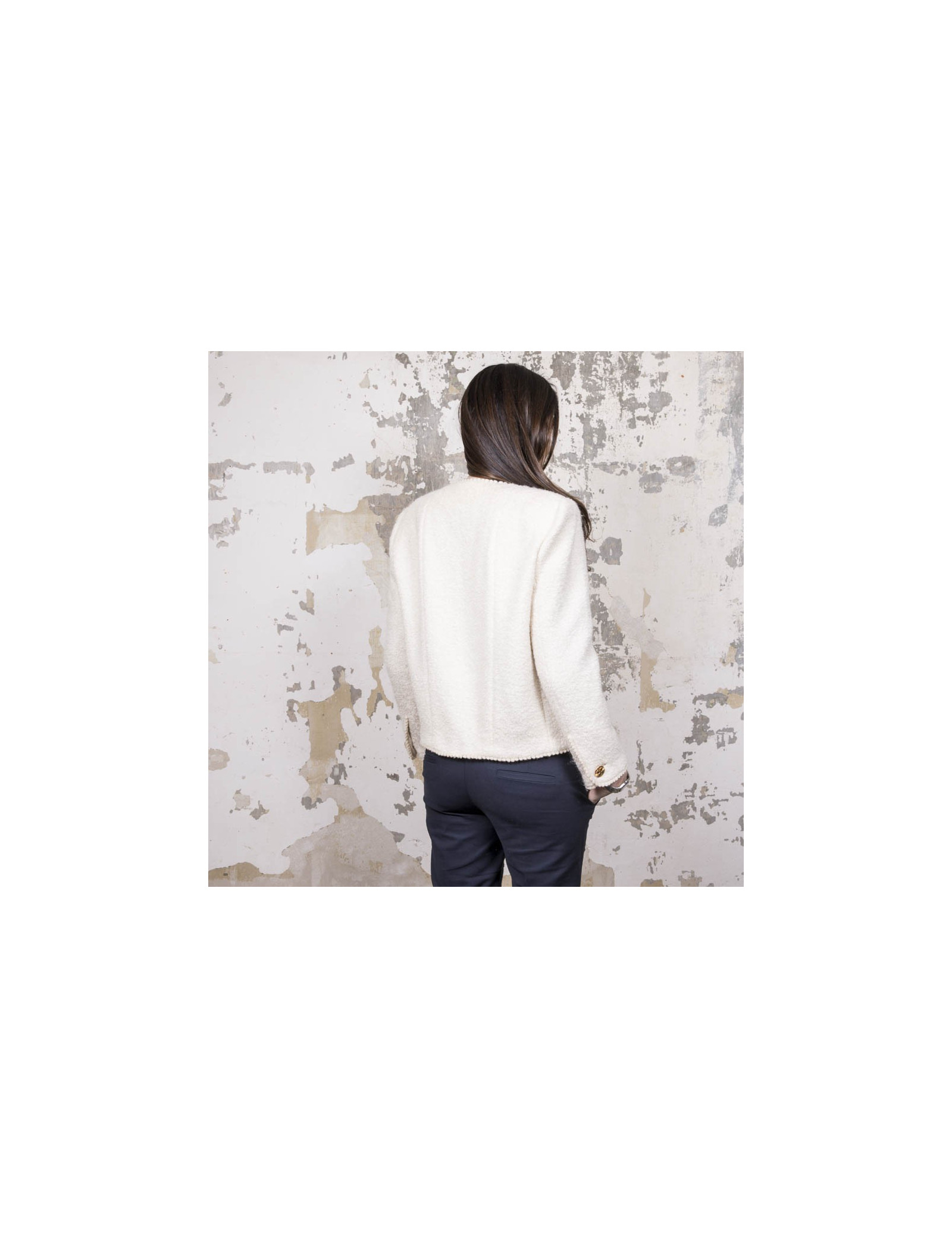 Chanel vintage ecru tweed jacket. It closes with four golden metal buttons. We find the same button at each wrist and two slit pockets at the waist.