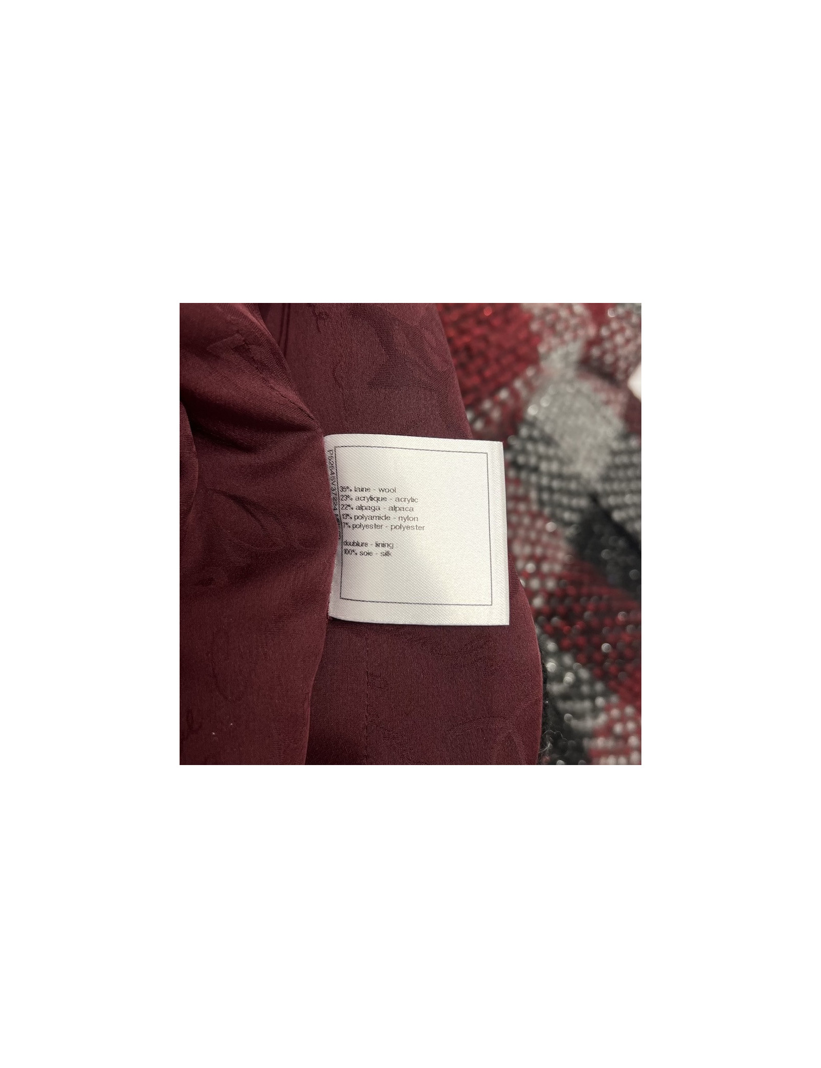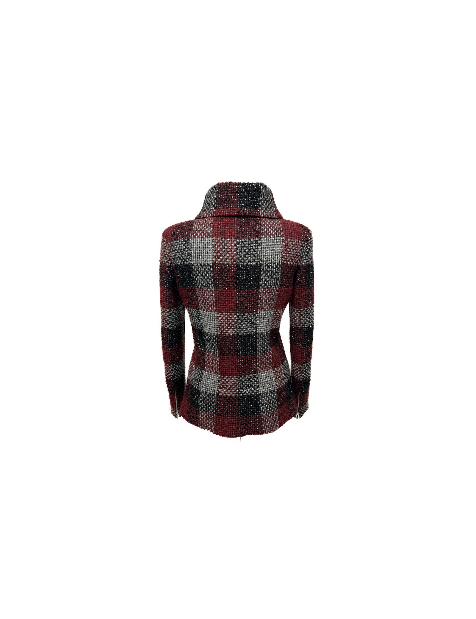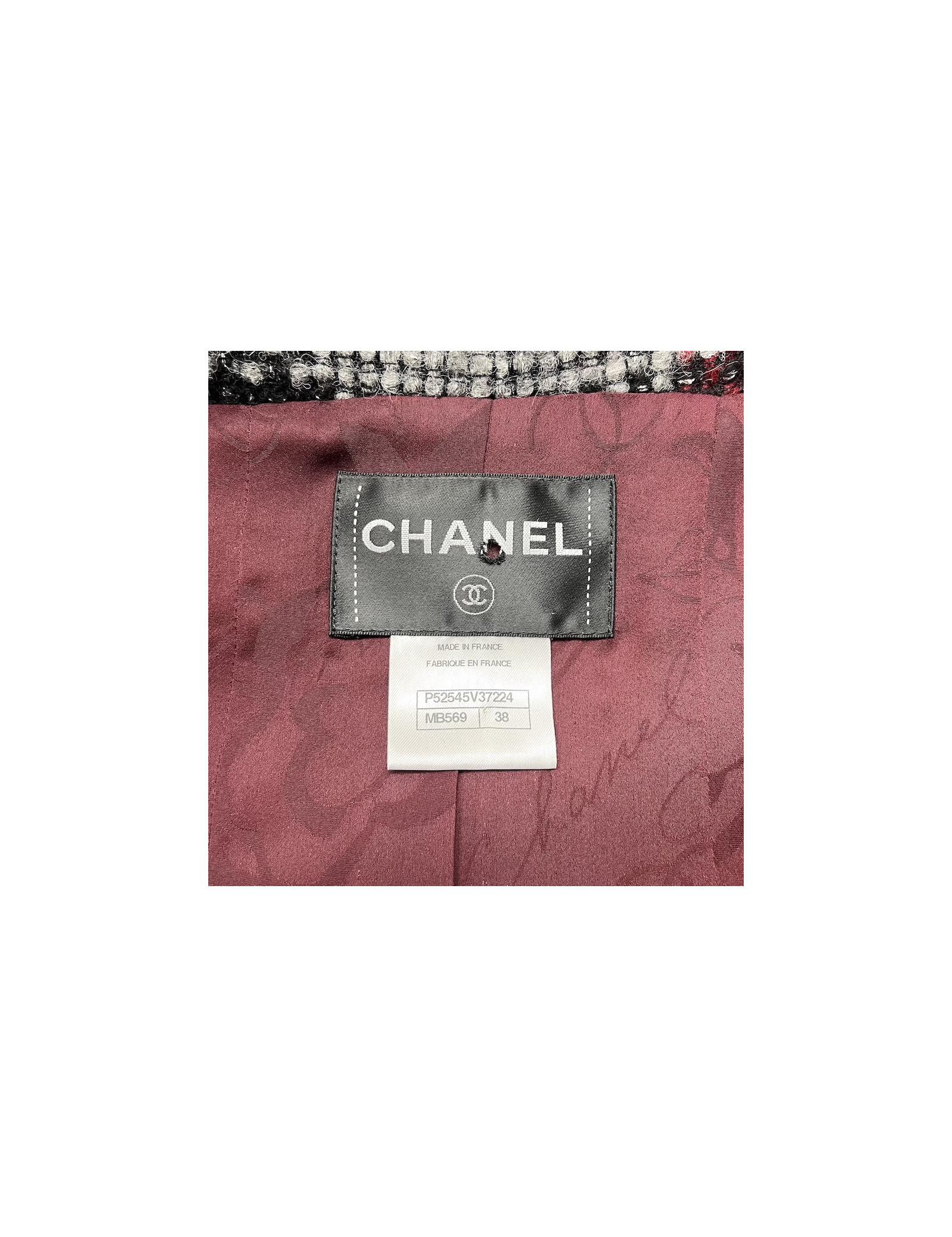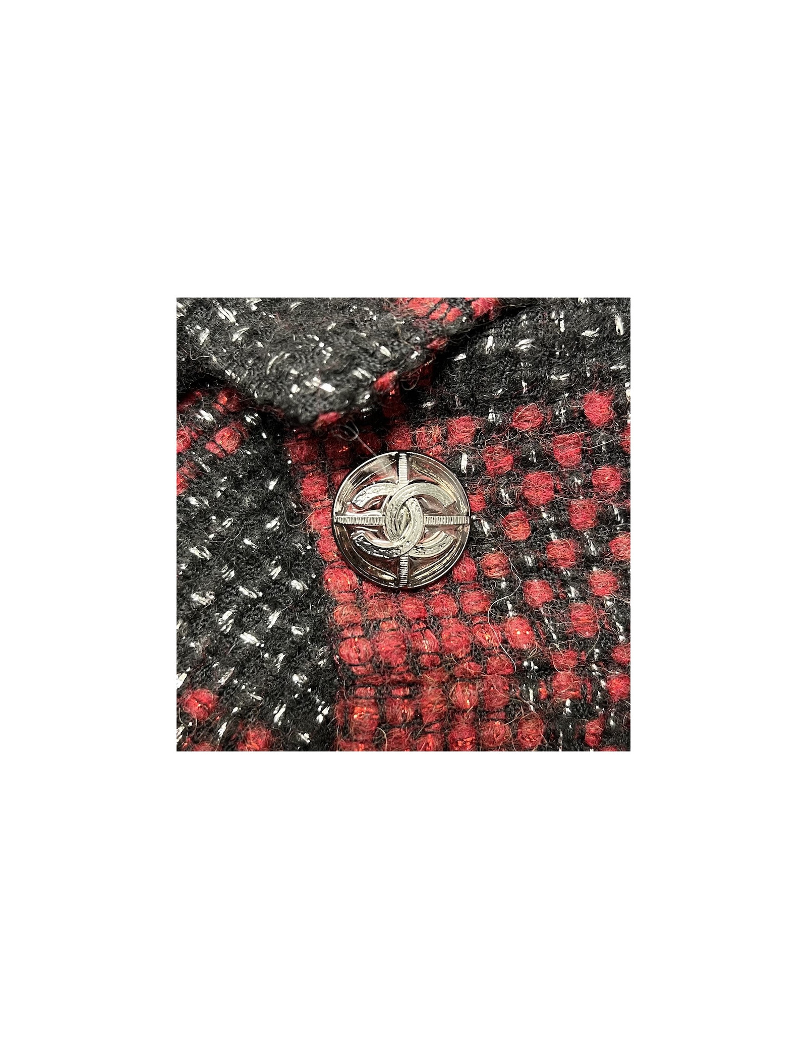 Superb Chanel jacket in tweed with red, silver and black check. It closes with black buttons marked under a paste. The lining is in burgundy monogram silk.