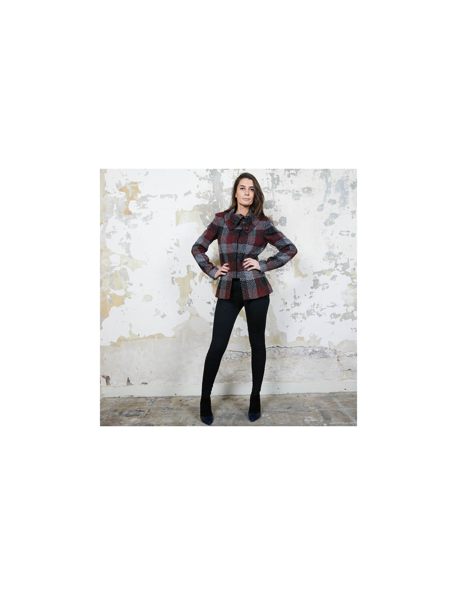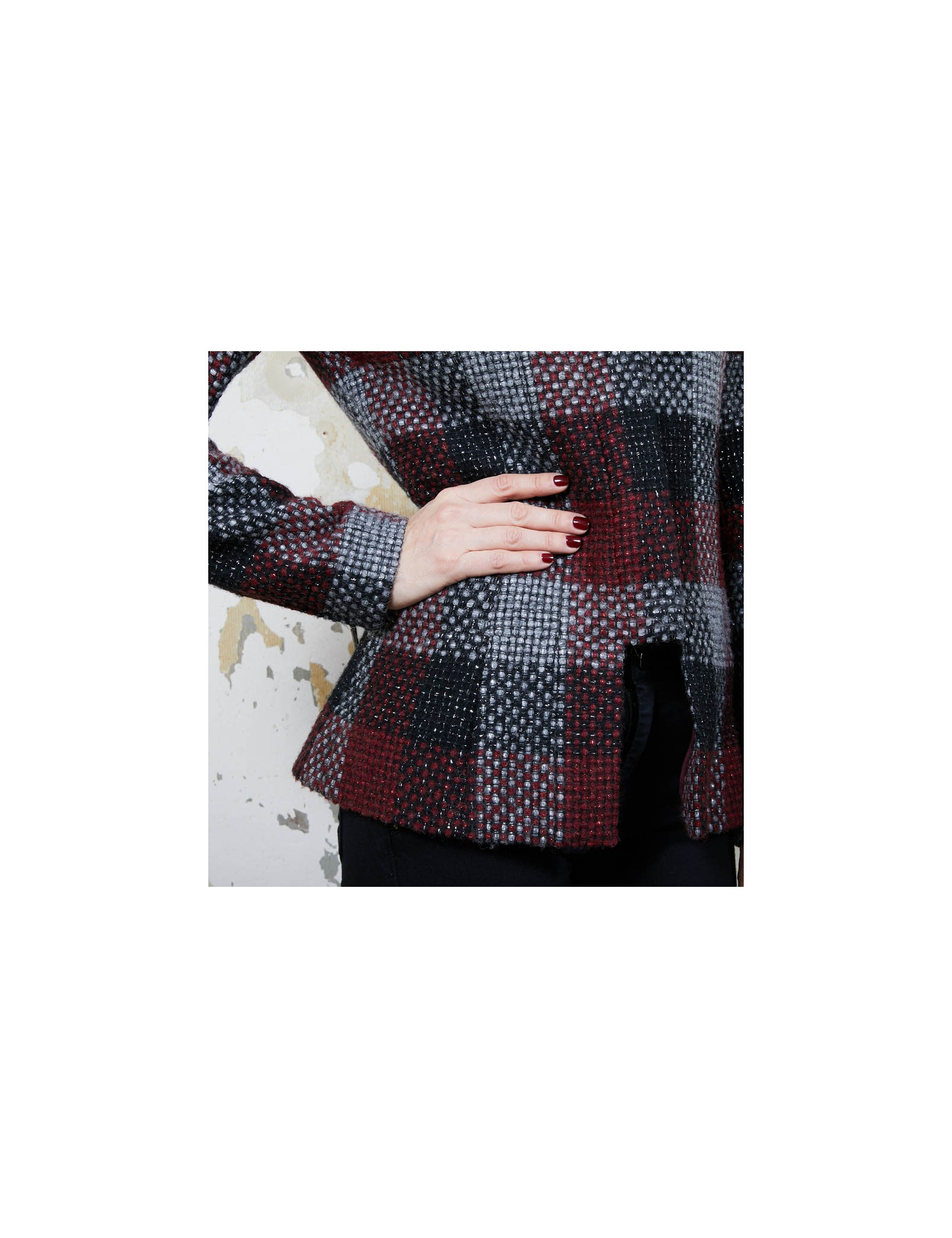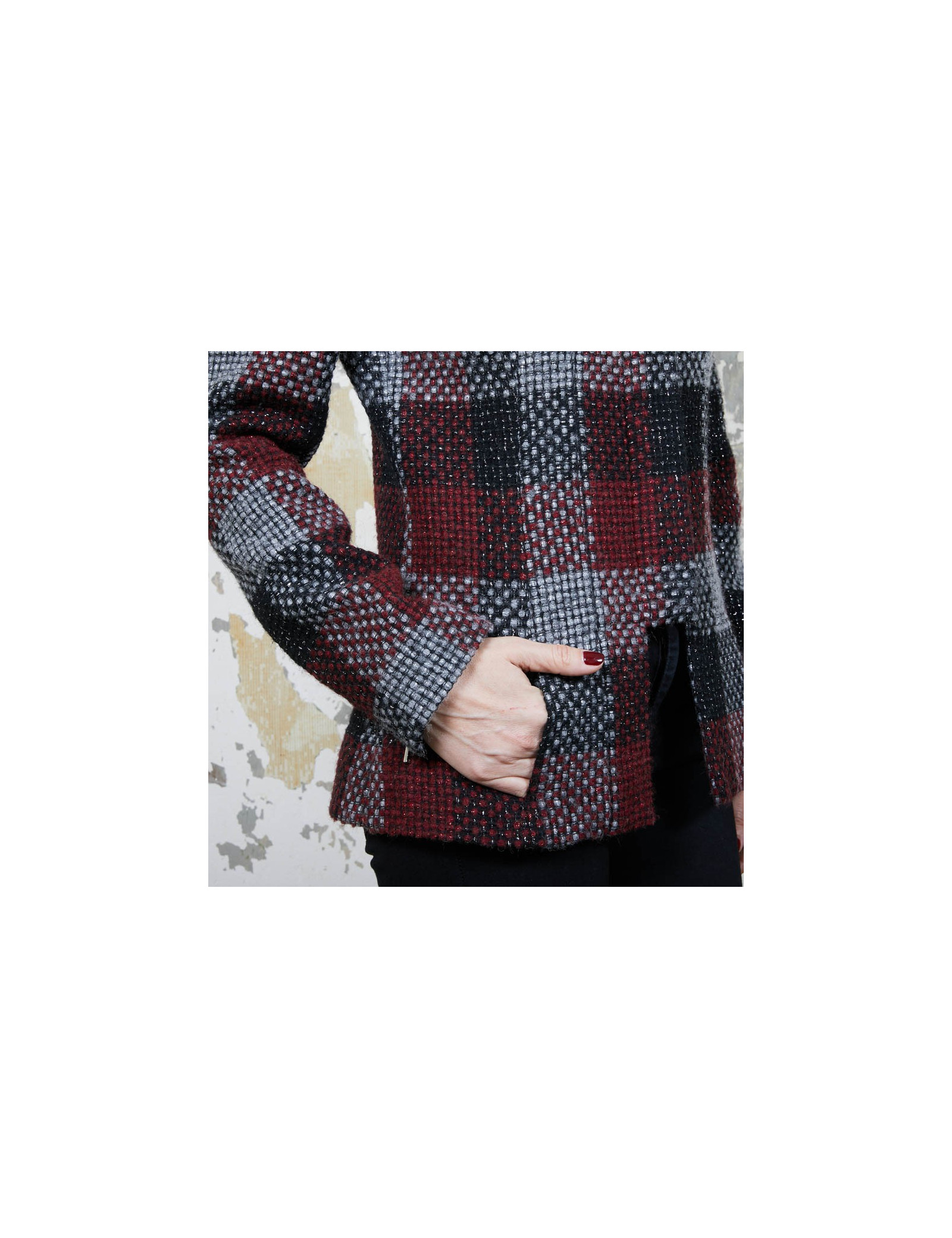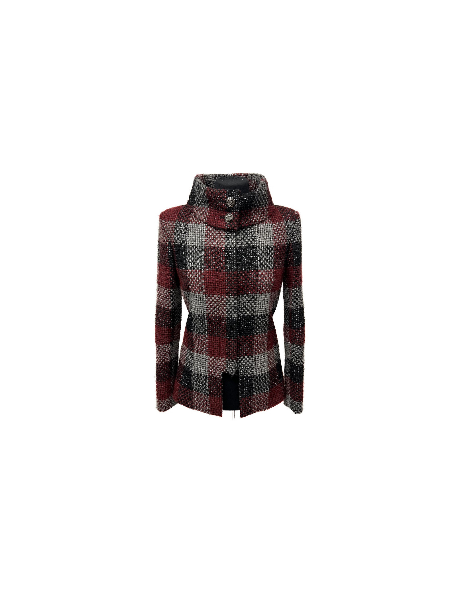 Superb Chanel jacket in tweed with red, silver and black check. It closes with black buttons marked under a paste. The lining is in burgundy monogram silk.