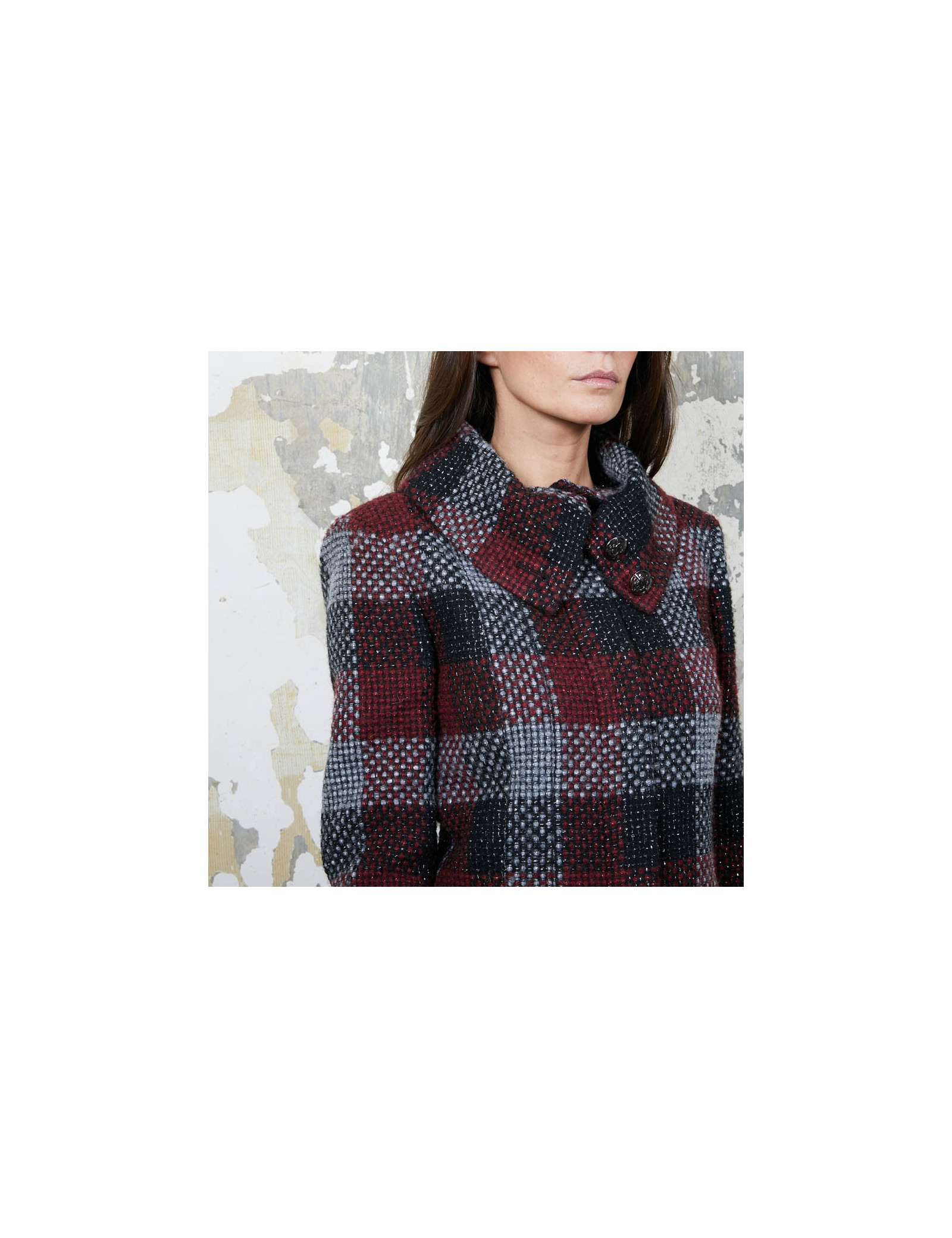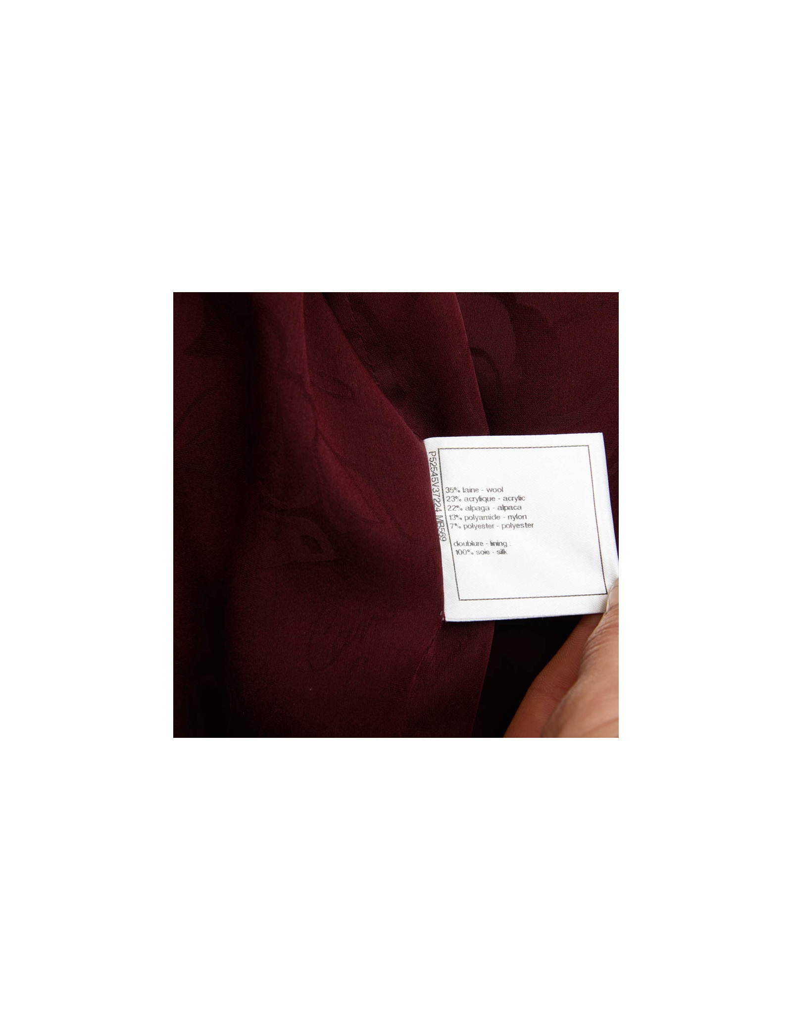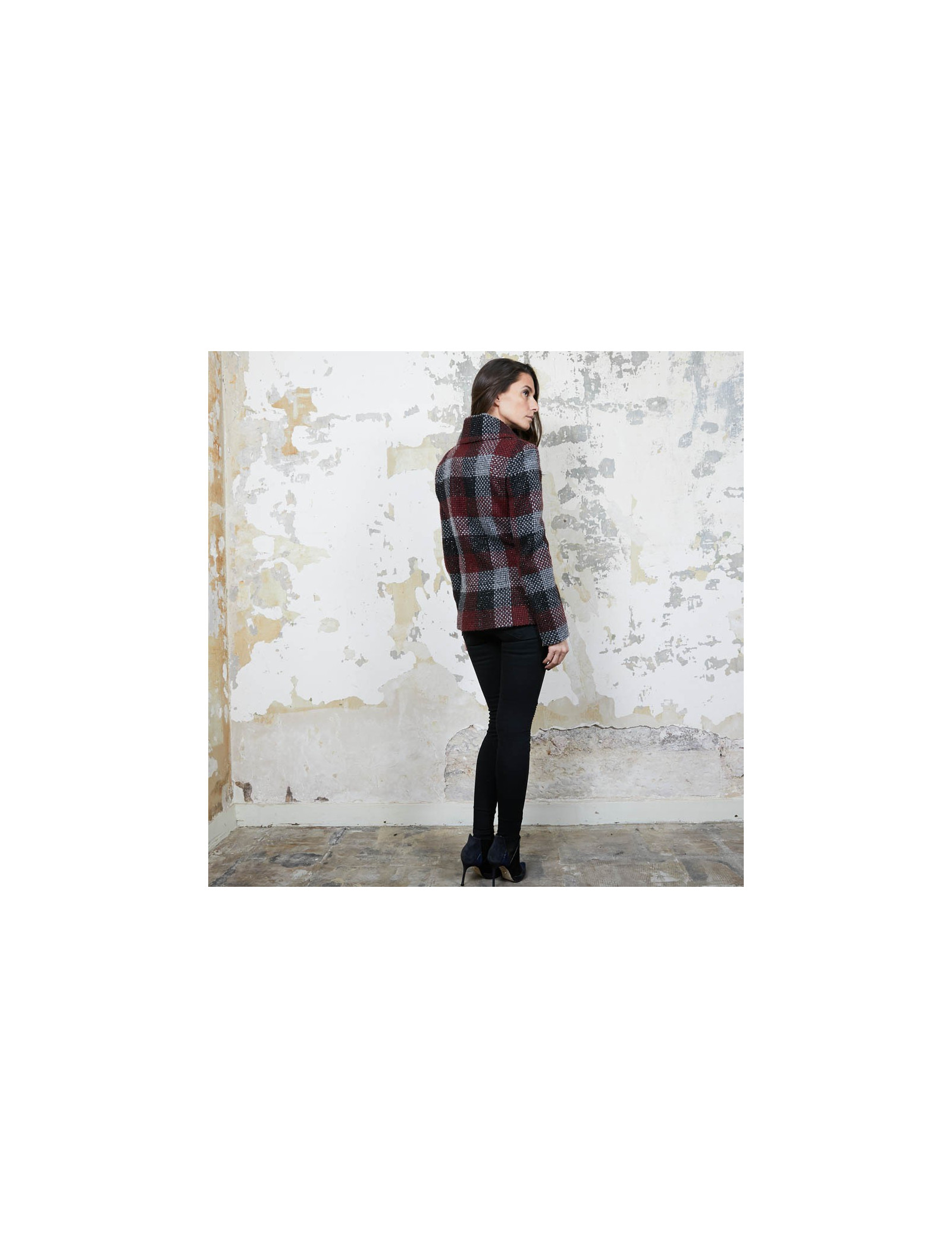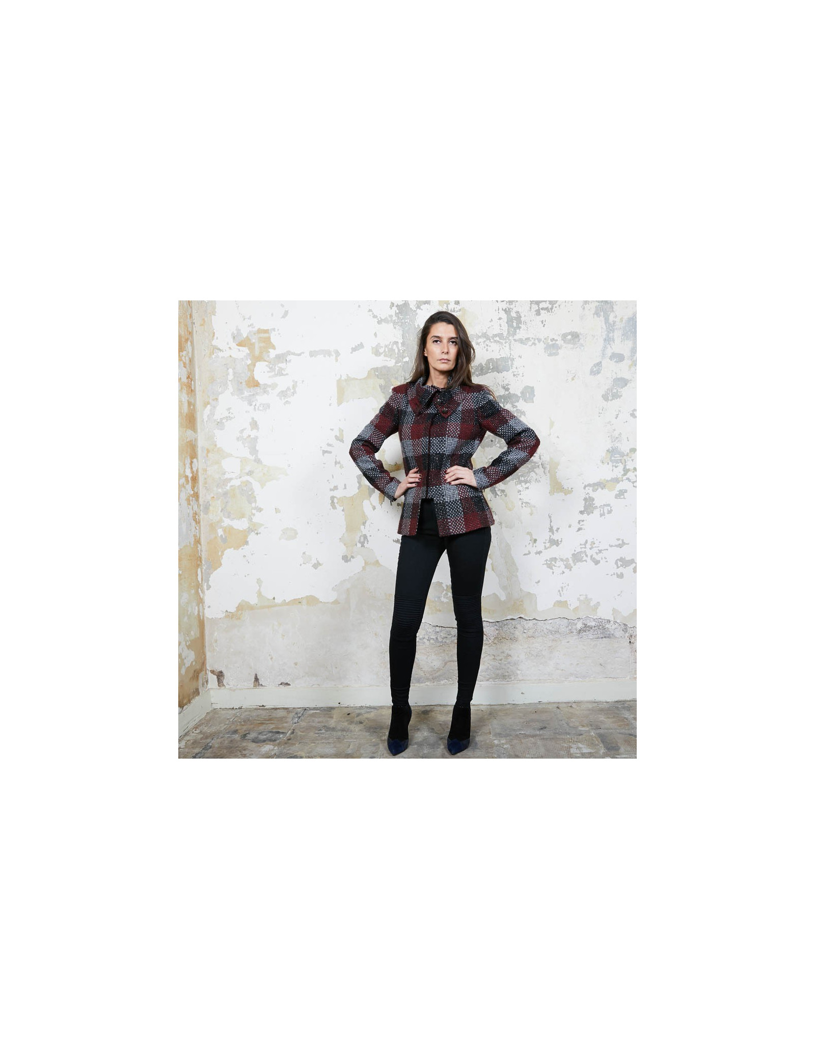 Superb Chanel jacket in tweed with red, silver and black check. It closes with black buttons marked under a paste. The lining is in burgundy monogram silk.