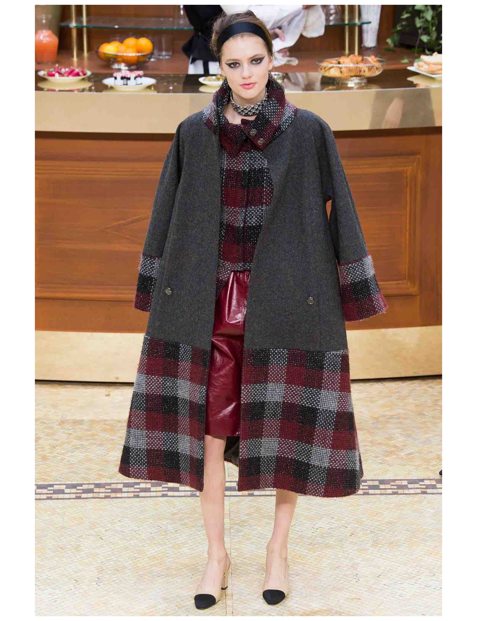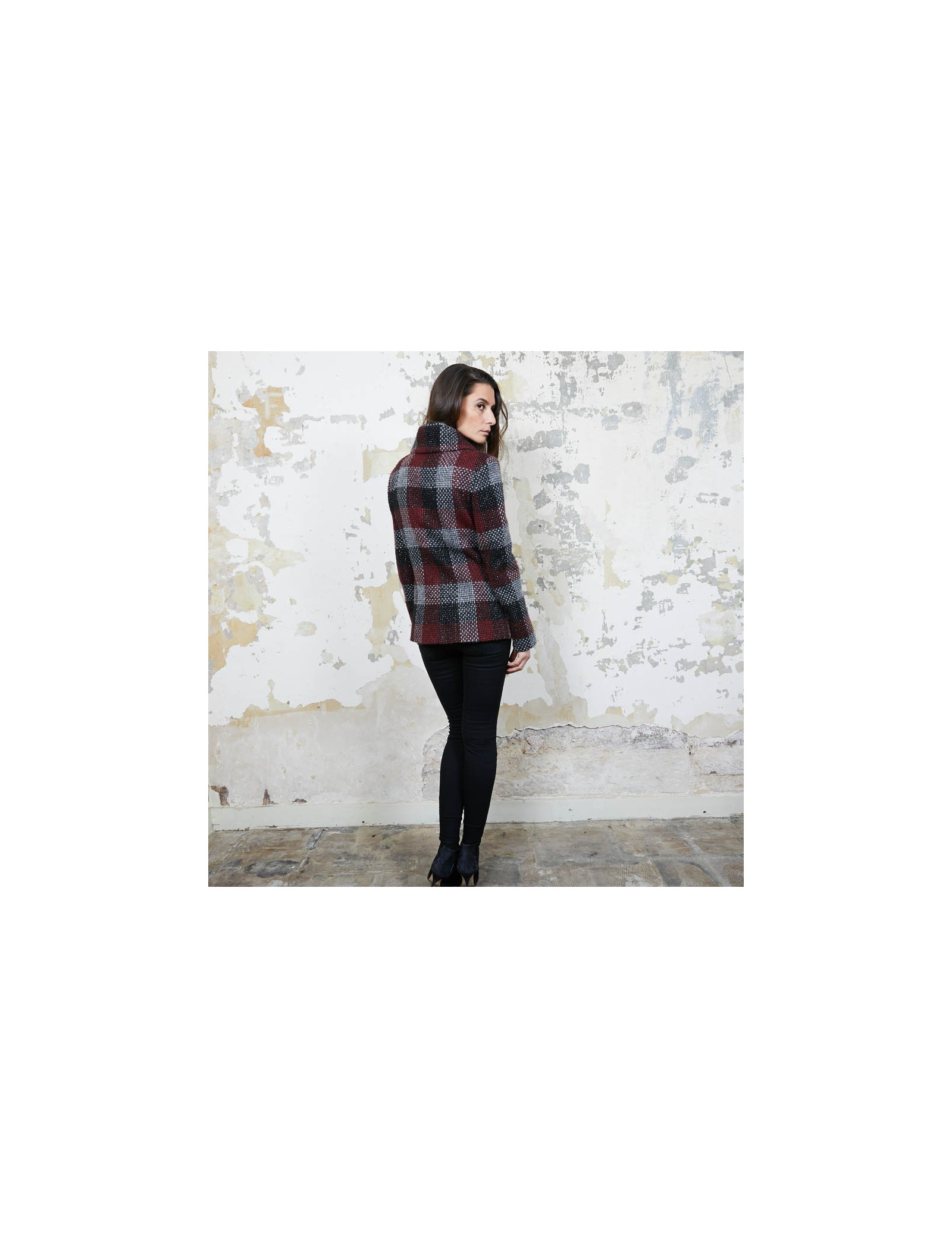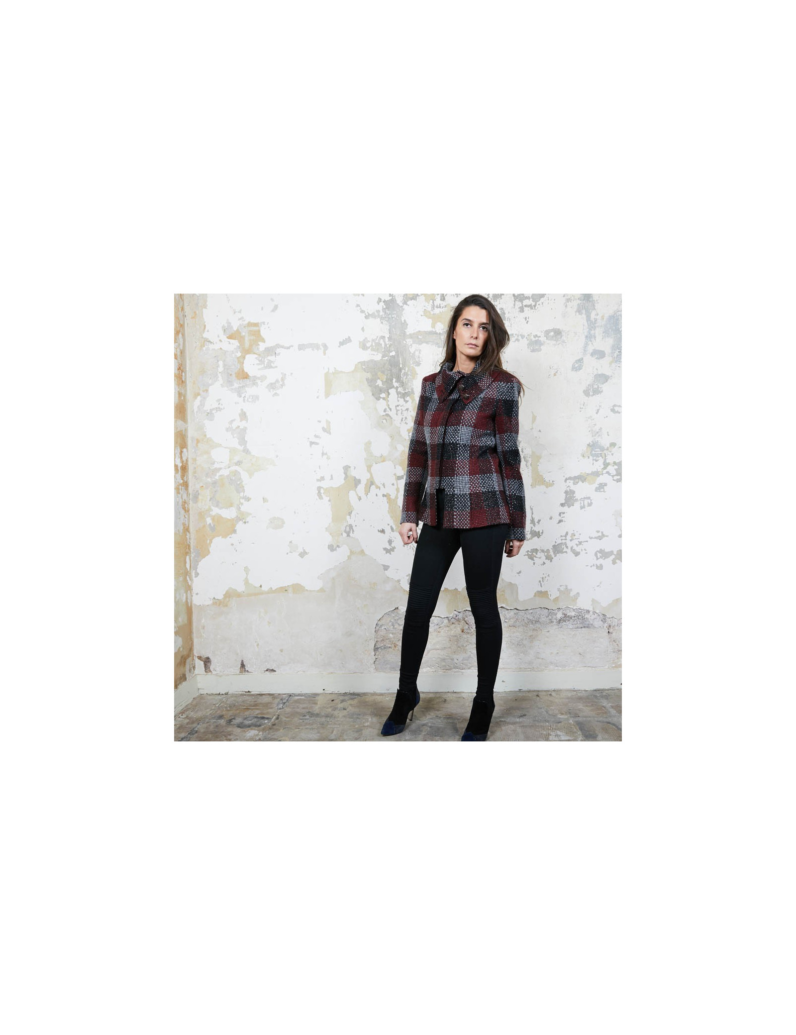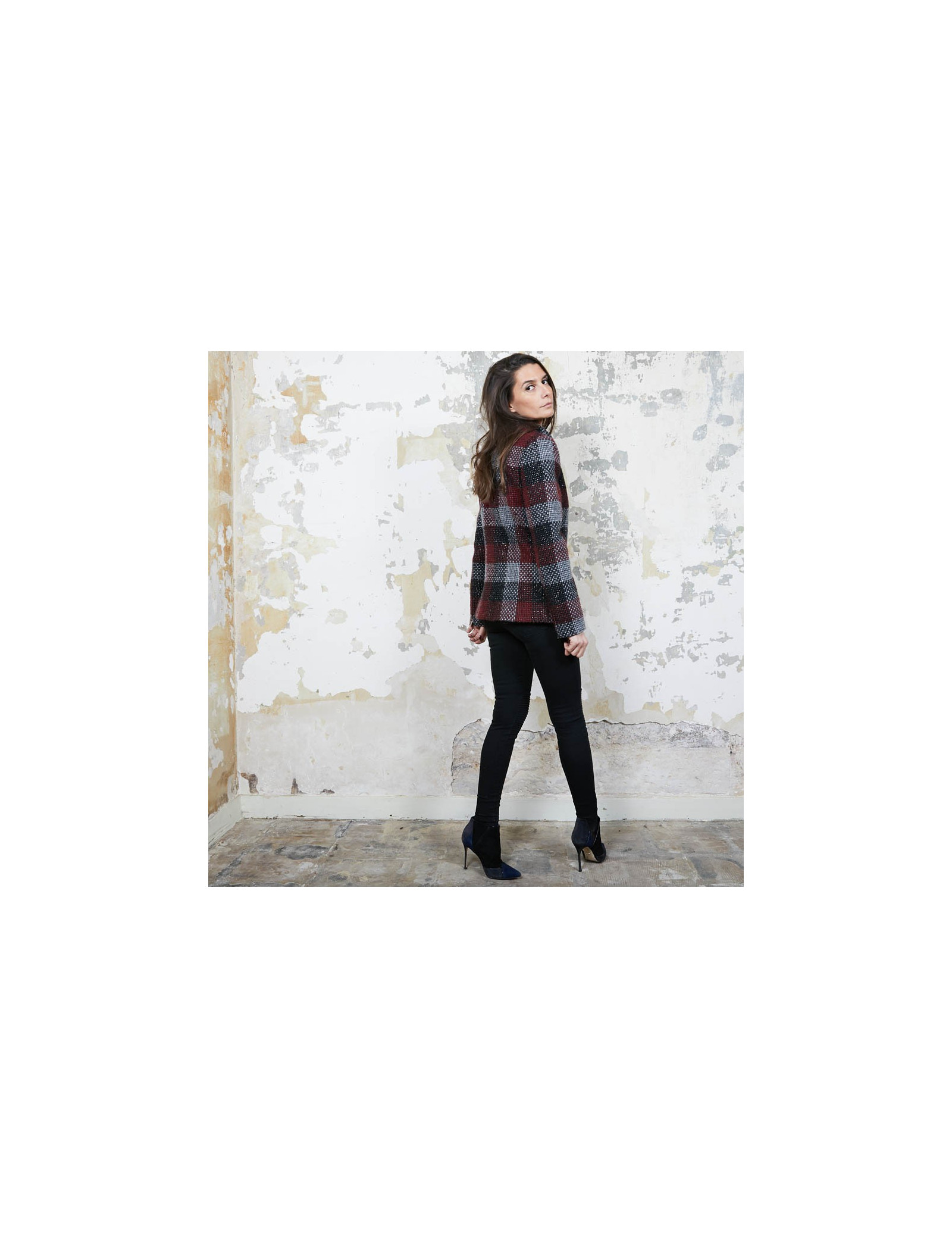 Superb Chanel jacket in tweed with red, silver and black check. It closes with black buttons marked under a paste. The lining is in burgundy monogram silk.