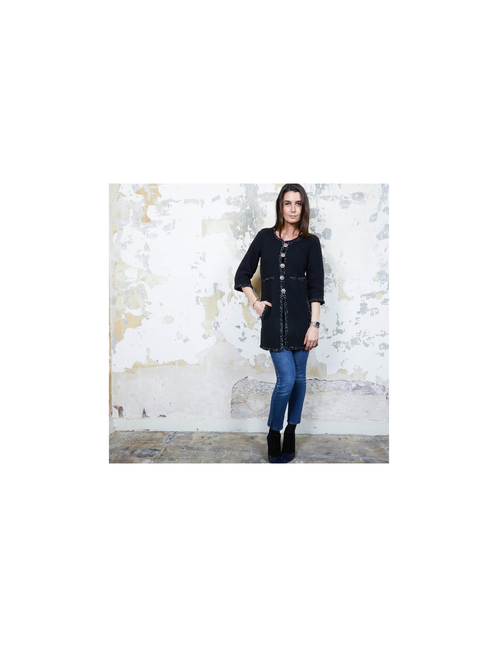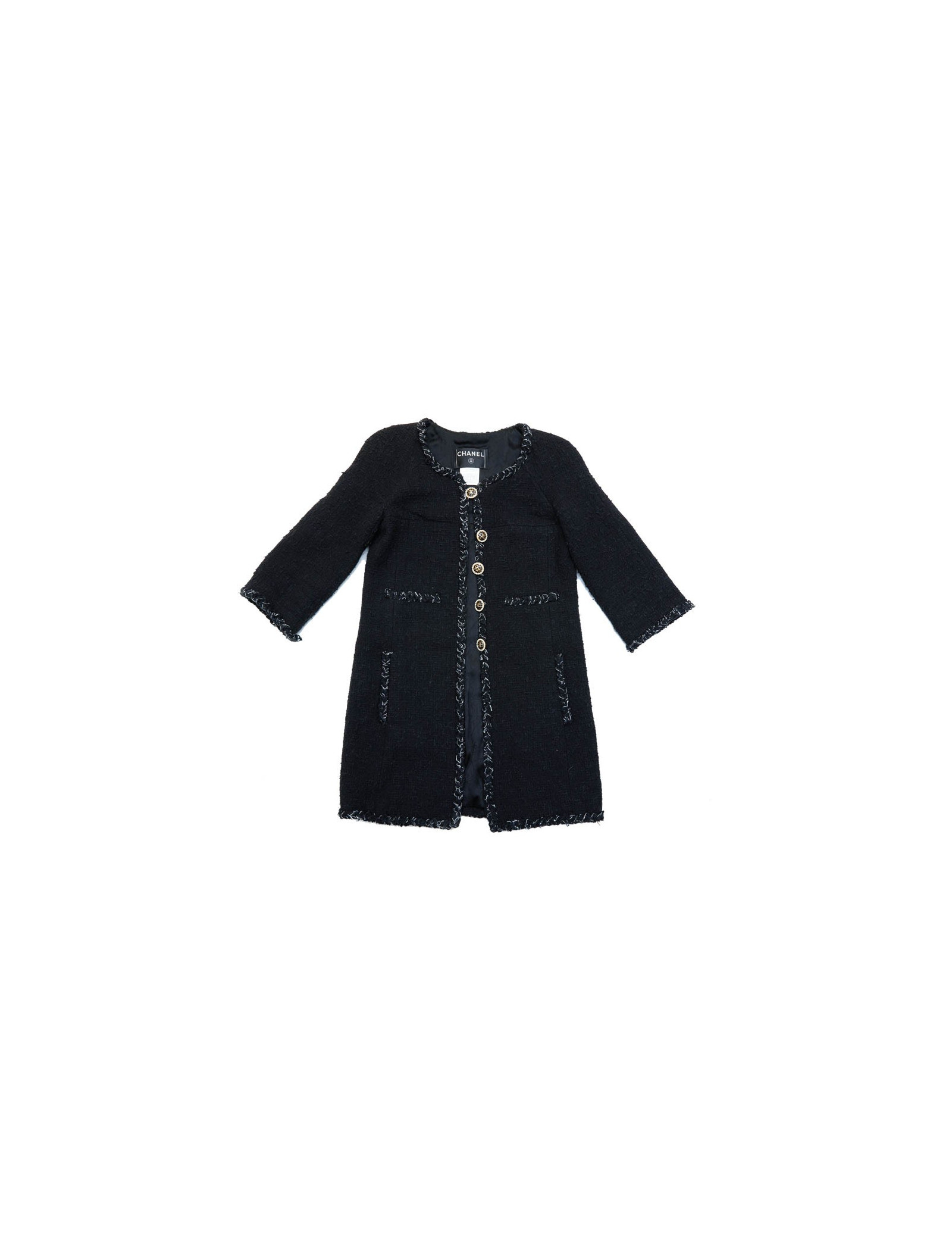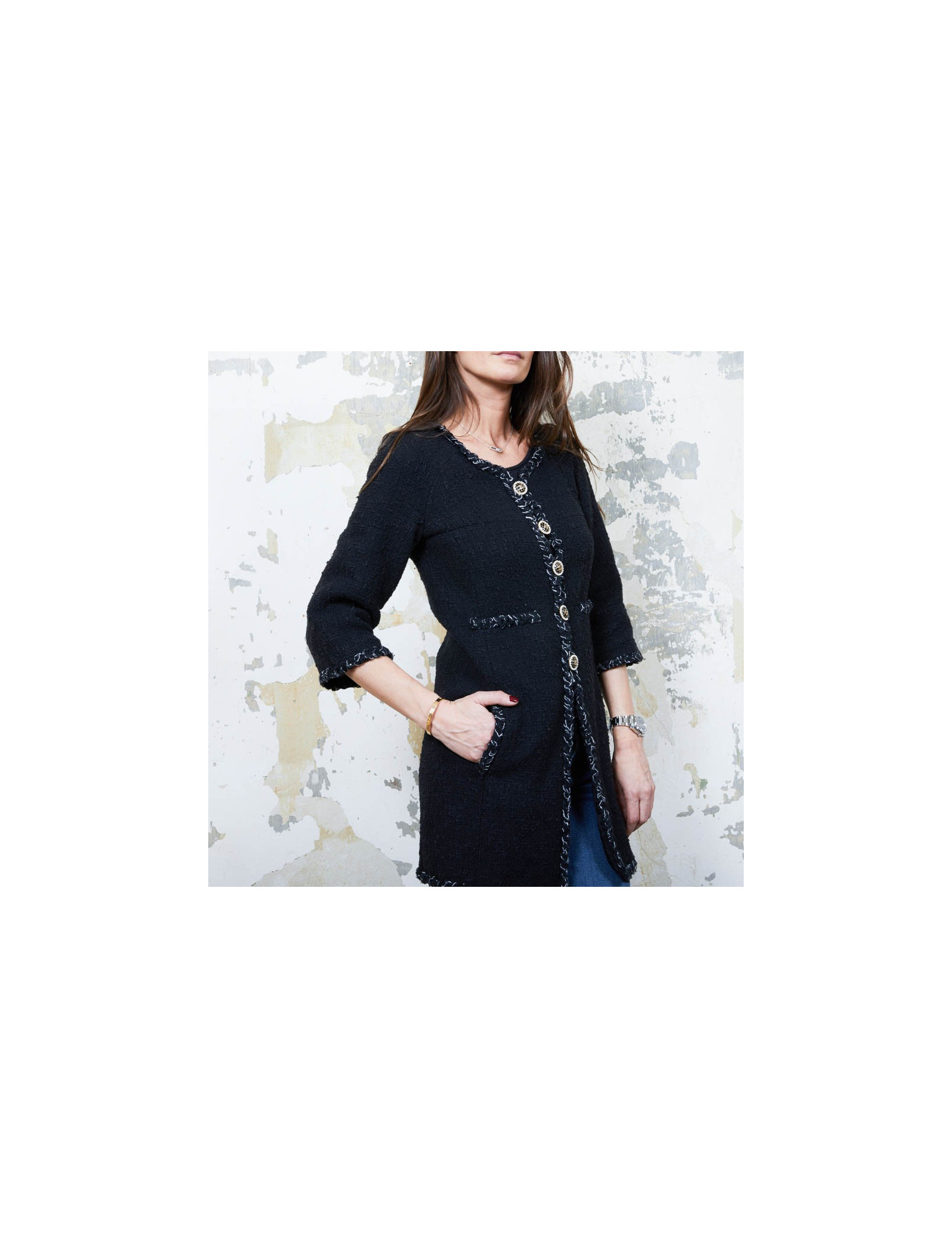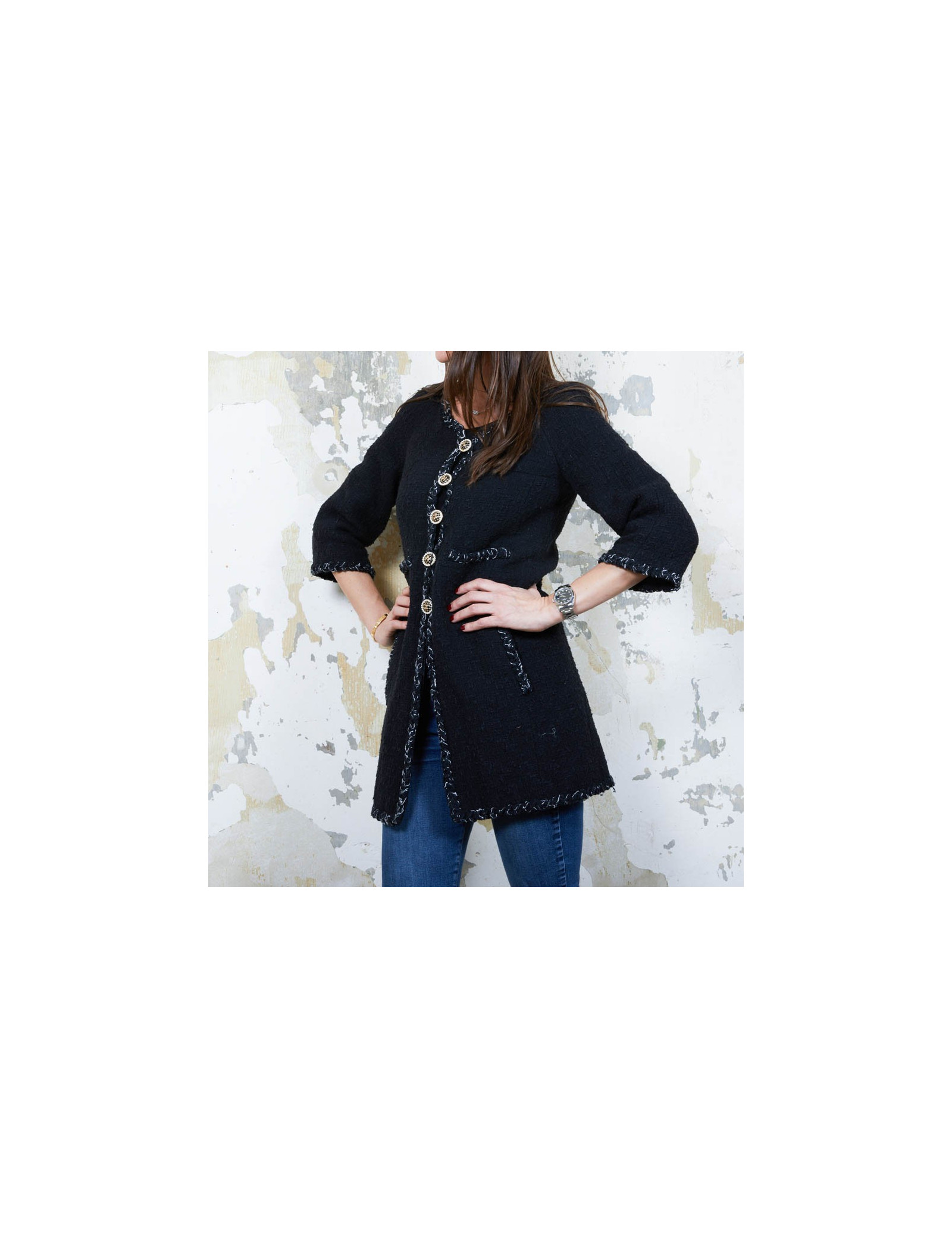 Iconic Chanel long jacket in black tweed. Spring 2007 collection. Made in France. Size 34