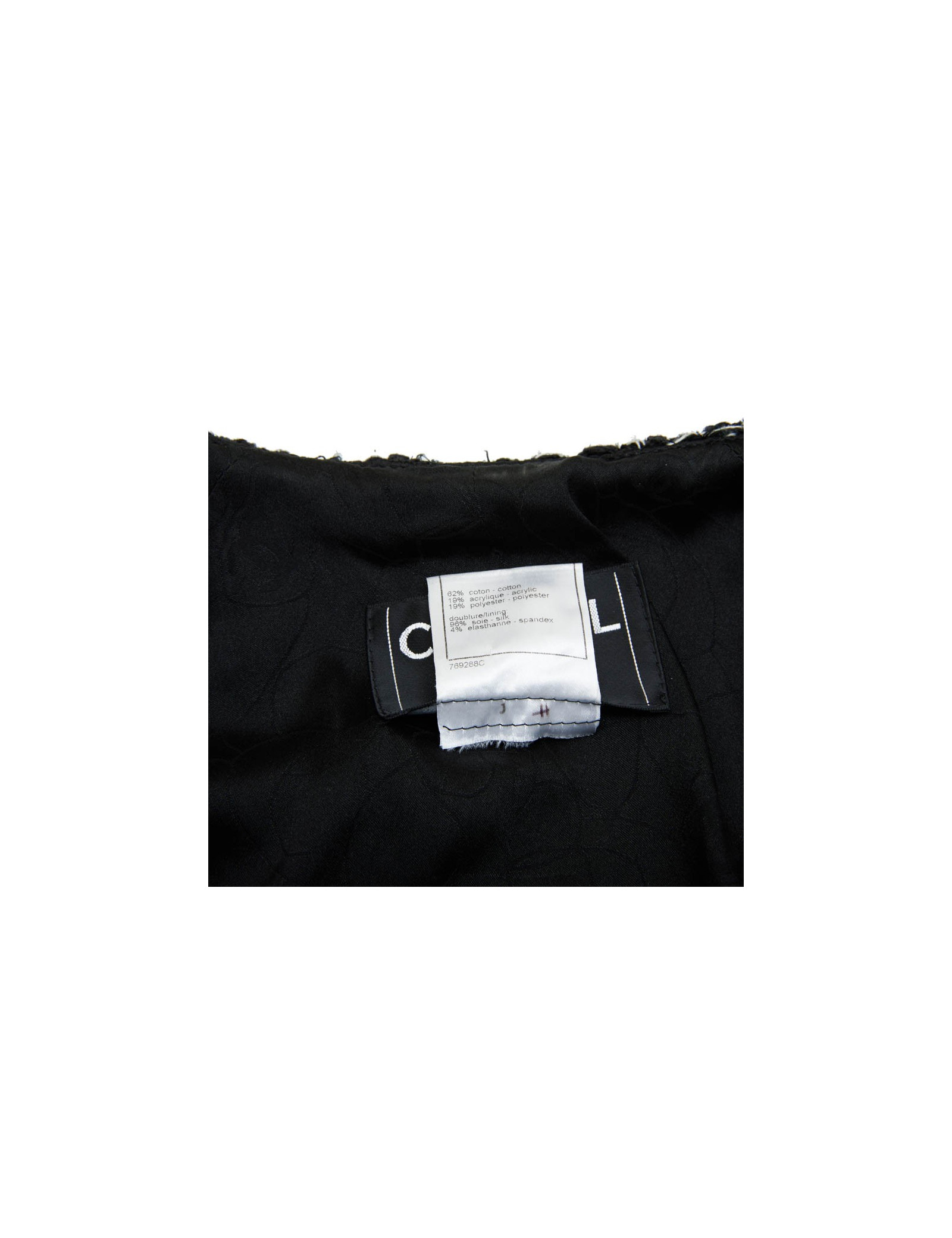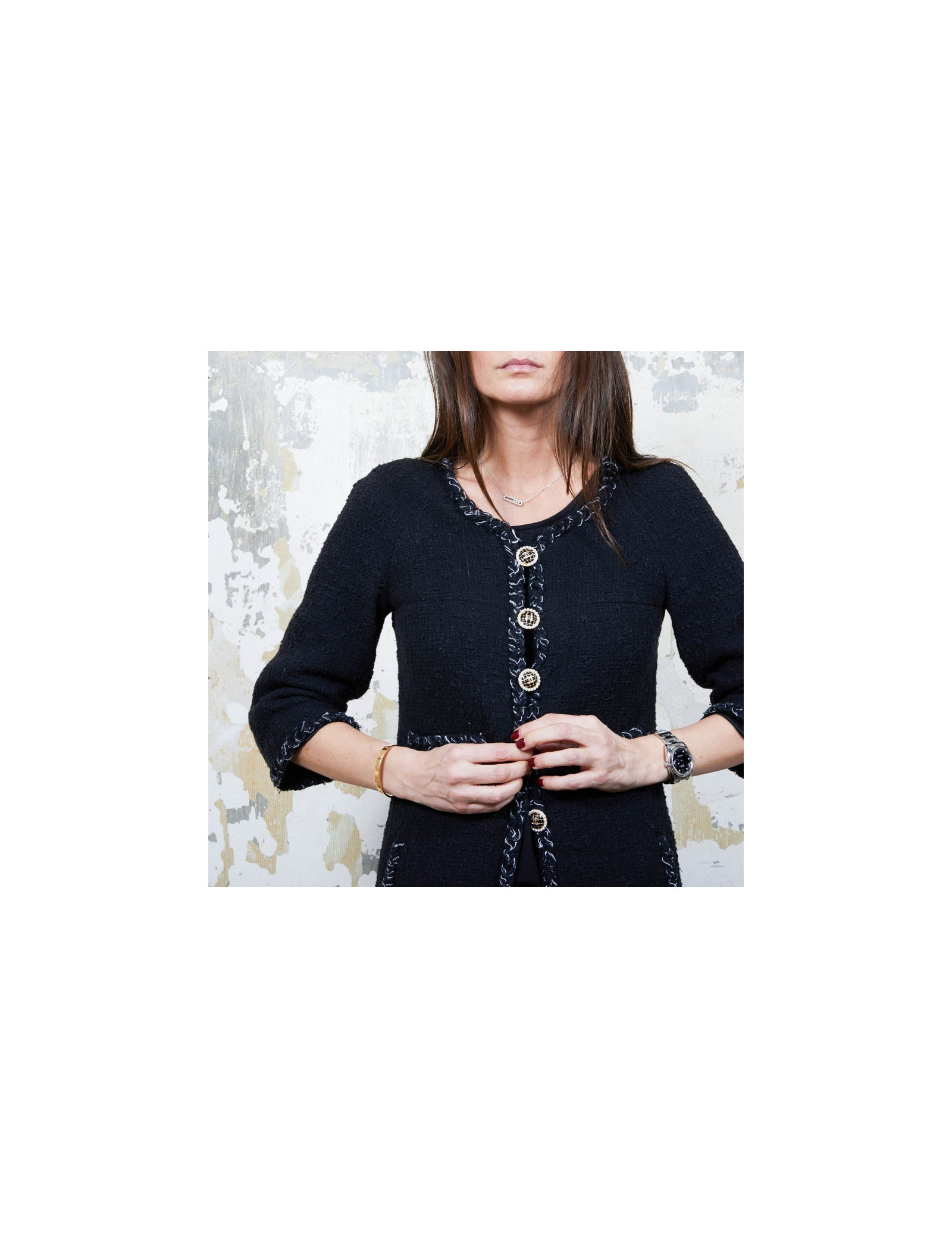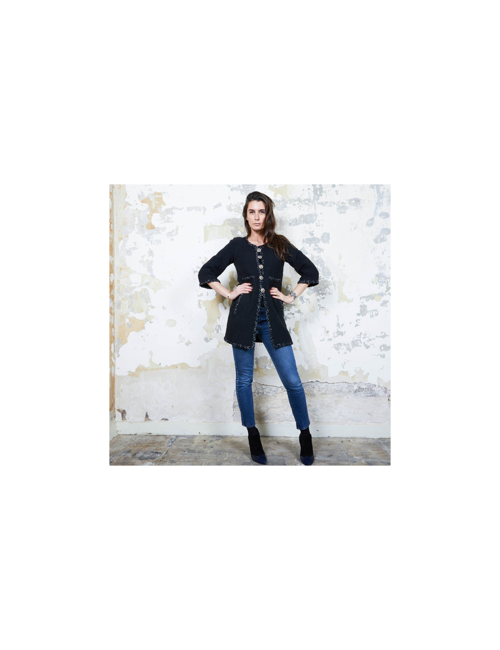Iconic Chanel long jacket in black tweed. Spring 2007 collection. Made in France. Size 34