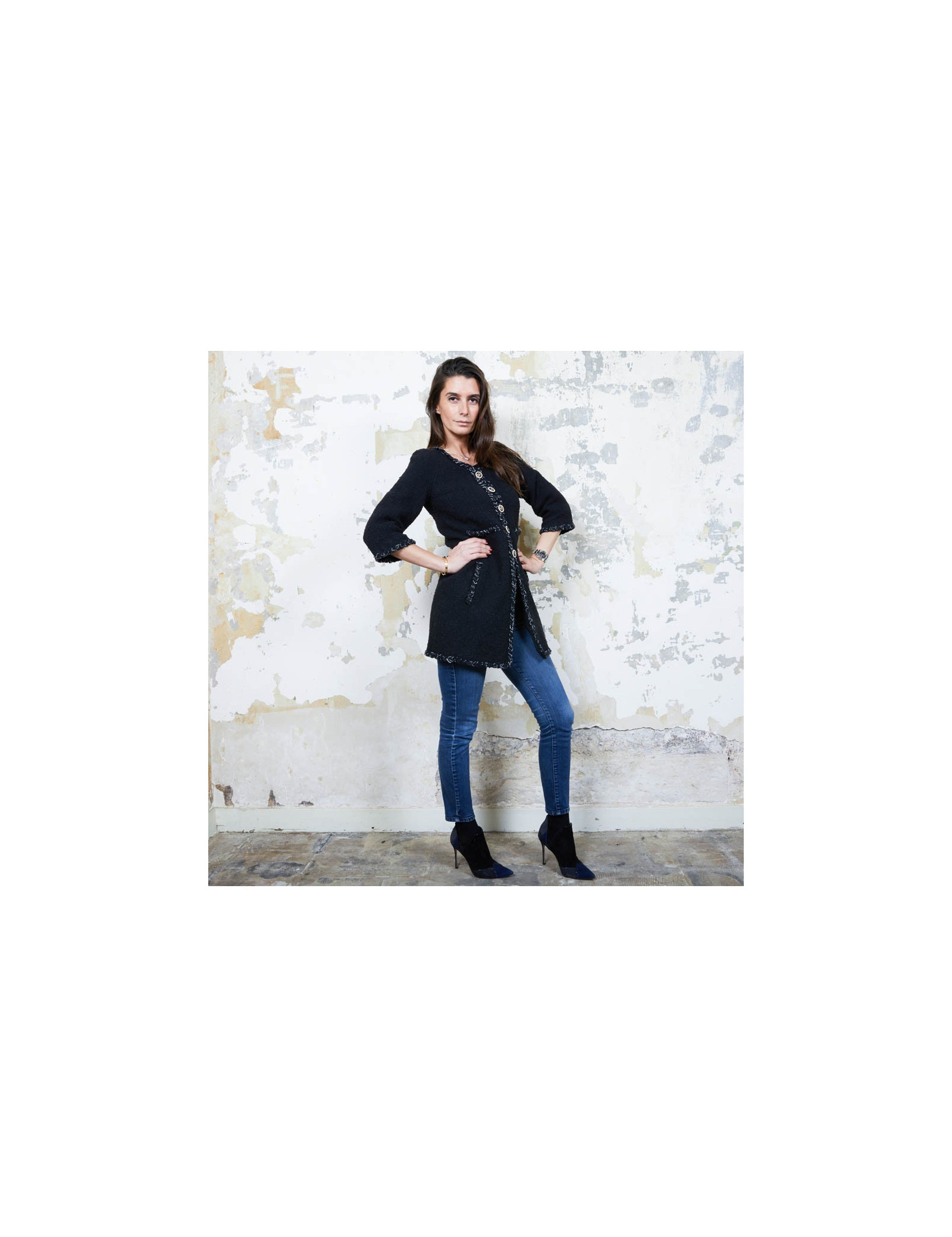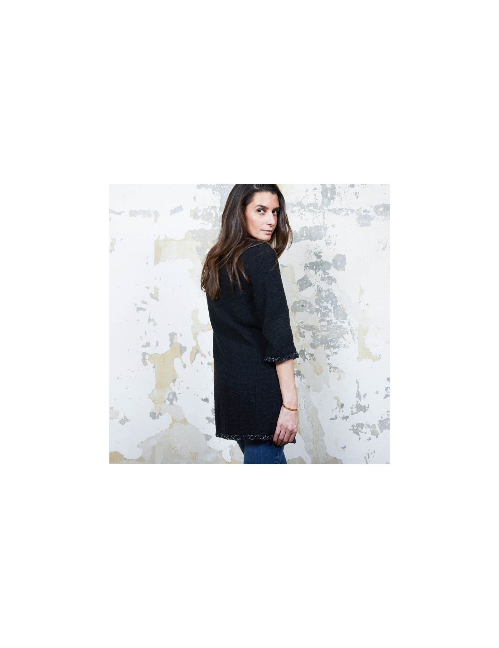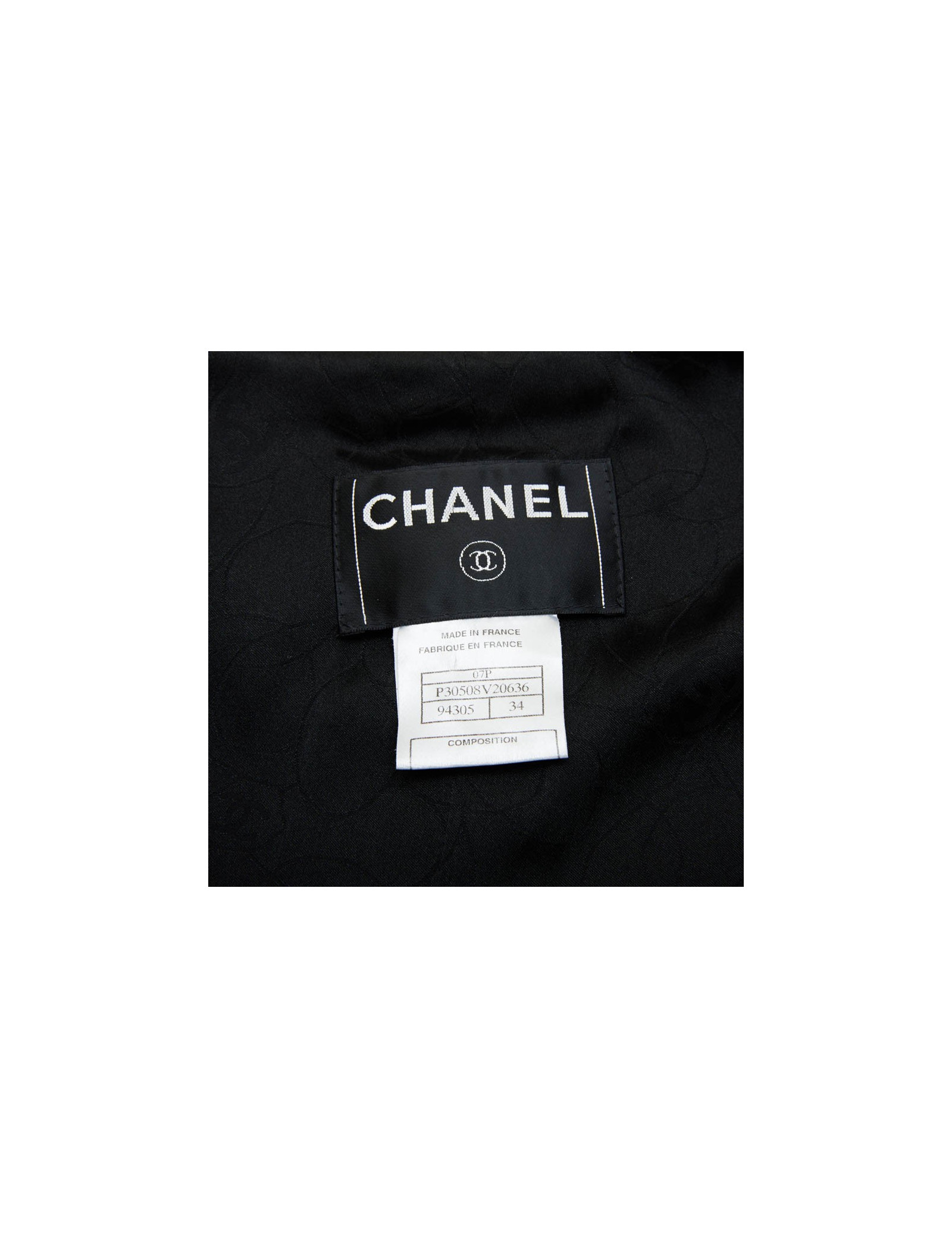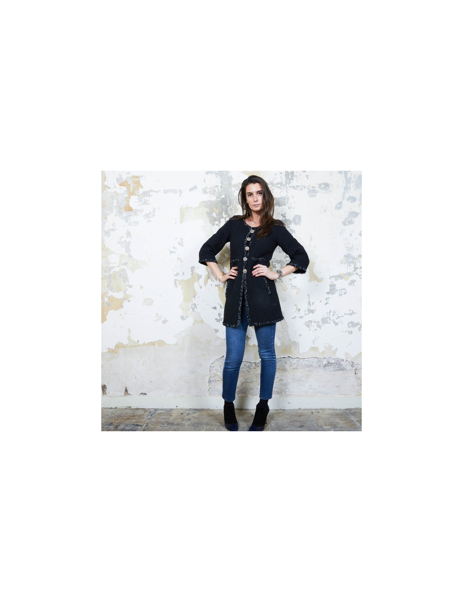 Iconic Chanel long jacket in black tweed. Spring 2007 collection. Made in France. Size 34