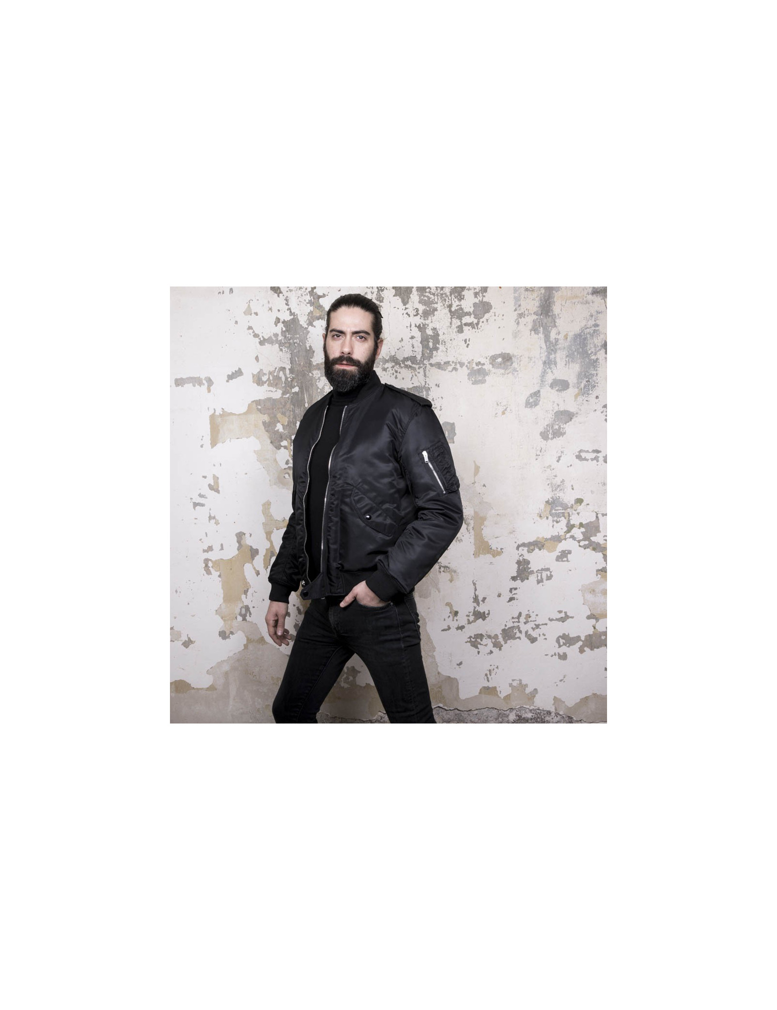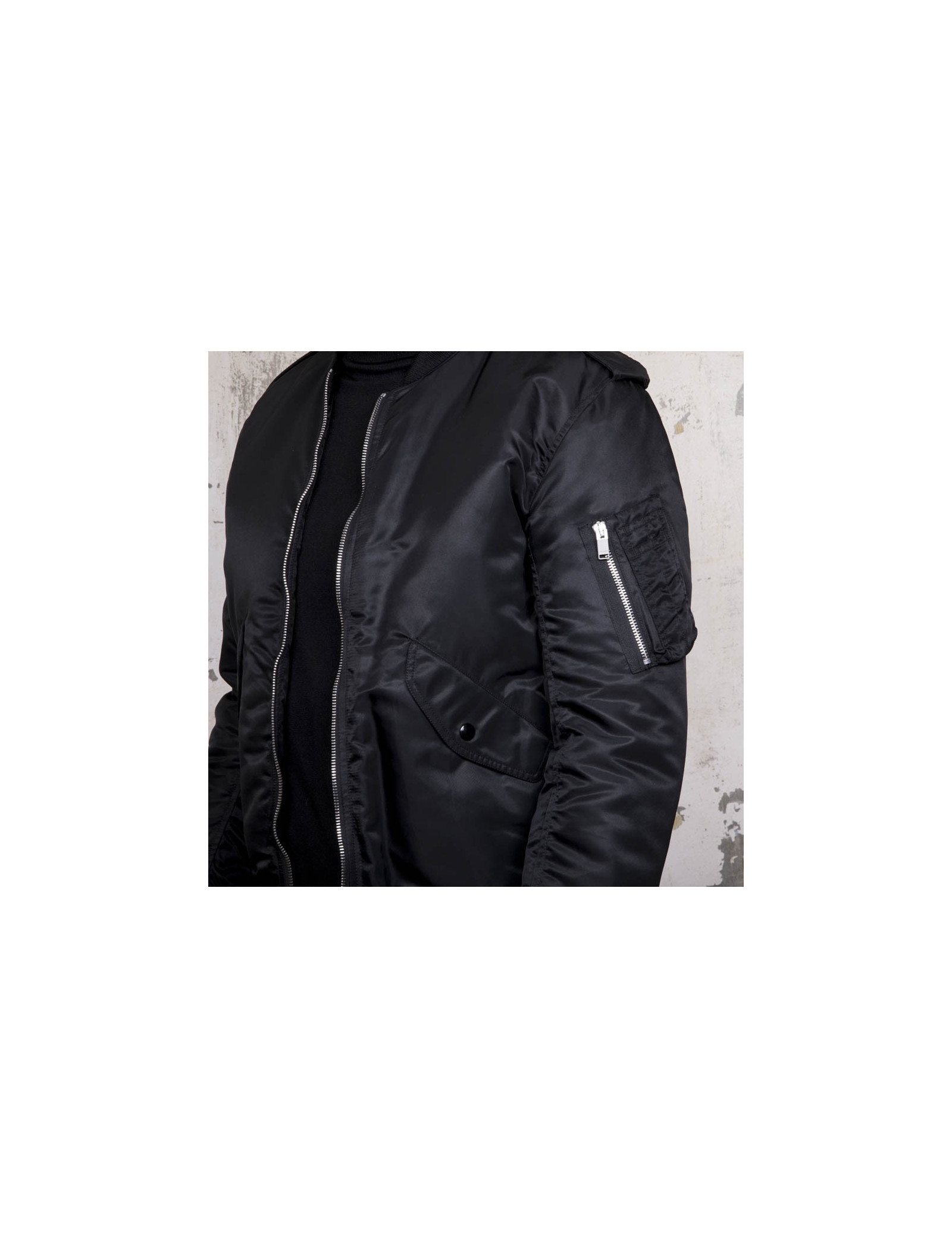 Saint Laurent Paris Bomber black jacket with epaulets, front flap pockets and a zipped cargo pocket on the sleeve. Rib collar, cuffs and hem.