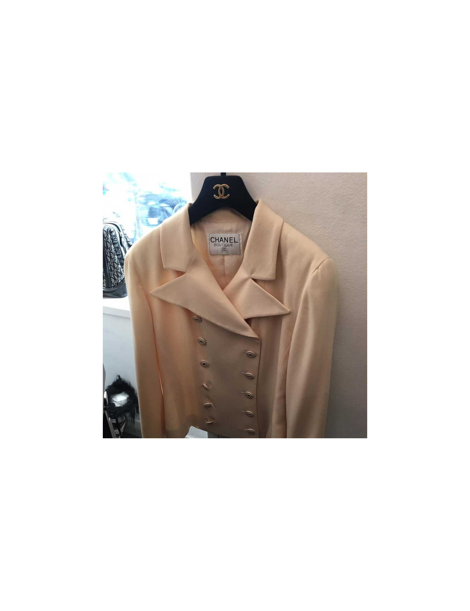 Last items in stock JACKETS Tailleur CHANEL T 42 tweed écru fils d'or sequins CHANEL 38468 9,800.00 € Chanel Suit 1995 Vintage Size 42 Condition : very good conditionCountry of manufacture : FranceSize : 42 FRMaterial : tweed, sequinsLining : CC silkColor : peach (orange, yellow)Flat measurementsJacket : shoulder width 40 cm, underarm width 46 cm, sleeve length 52 cm, total height 61 cm, wrist circumference 22 cmSkirt : waist 38 cm, hips 44 cm, total... Add to cart