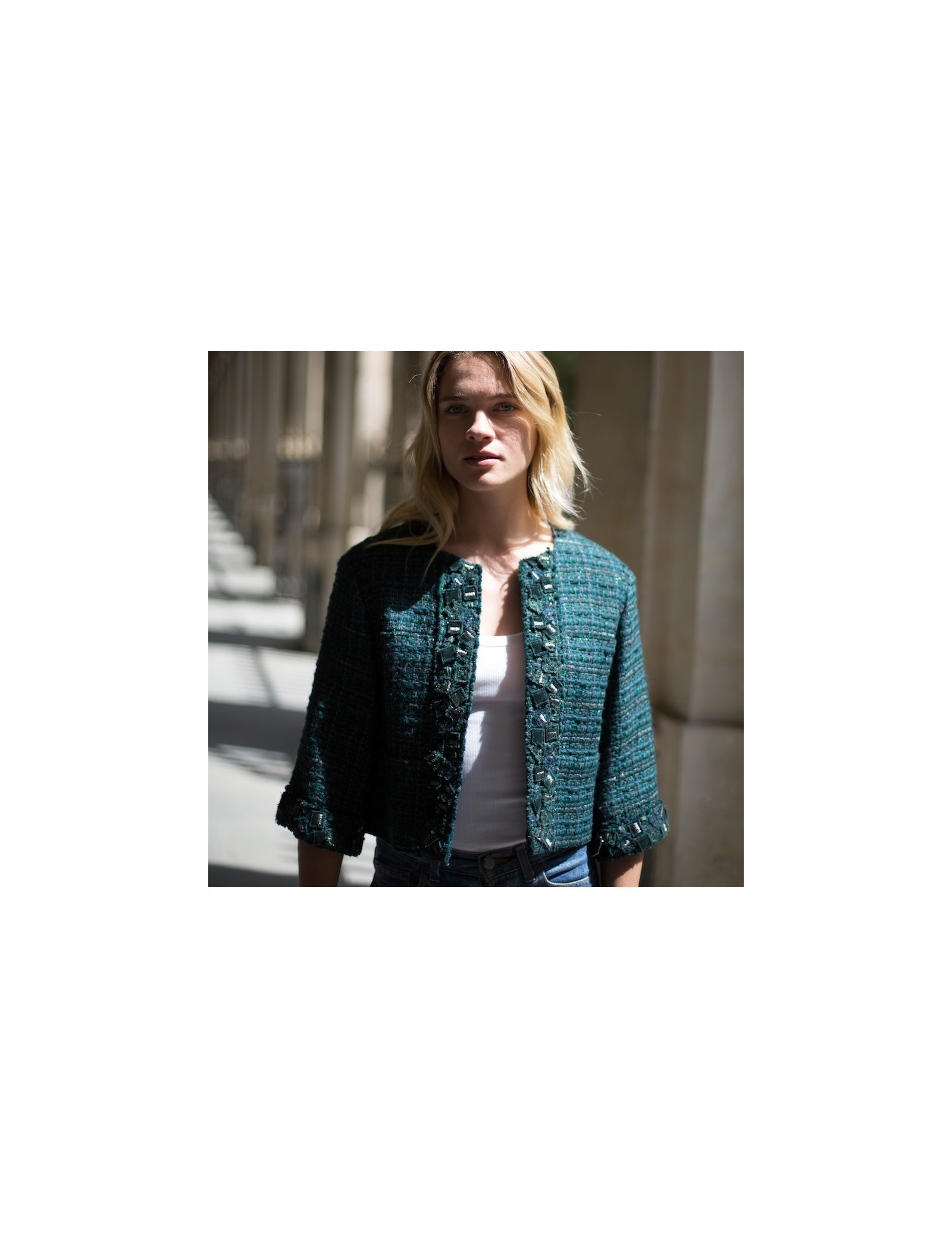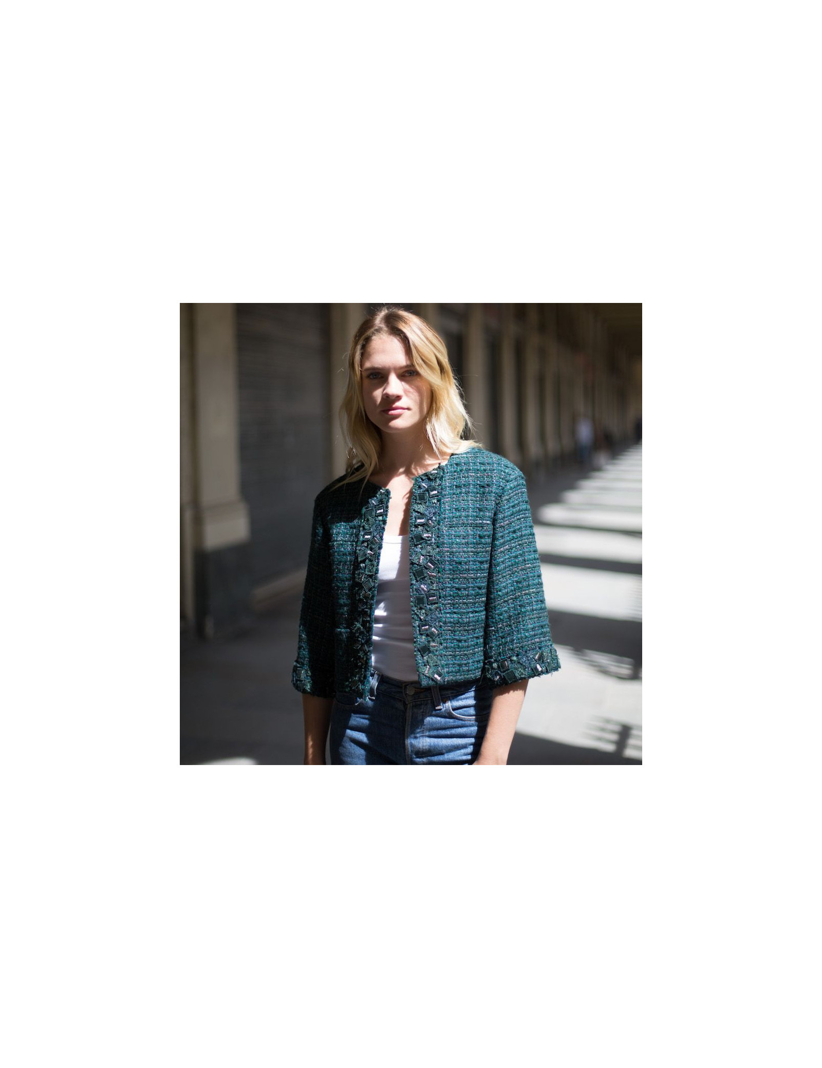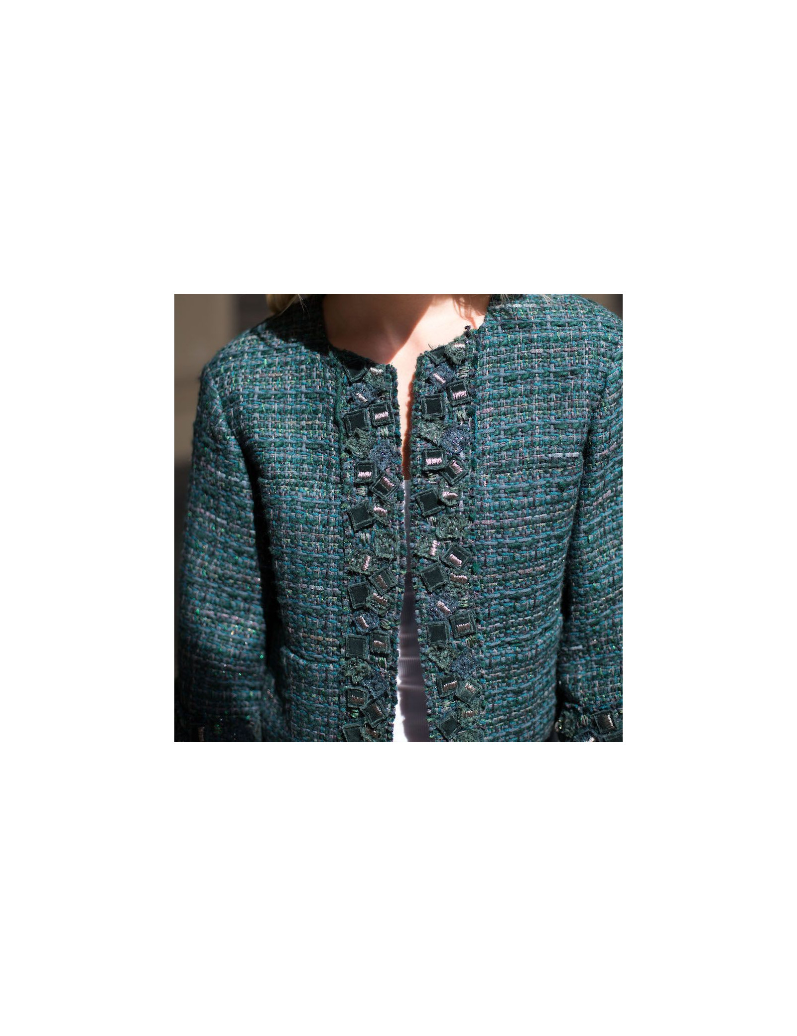 CHANEL T36 blue and green tweed short jacket. It closes with four small invisible hooks. It is braided with two bands of small squares in velvet, bronze threads and green threads. Four patch pockets on the front of the jacket. With its three quarter wide sleeves, it gives a bolero effect. Monogram silk lining. On the bottom of the jacket, we find the essential little chain. The jacket is in very good condition.
