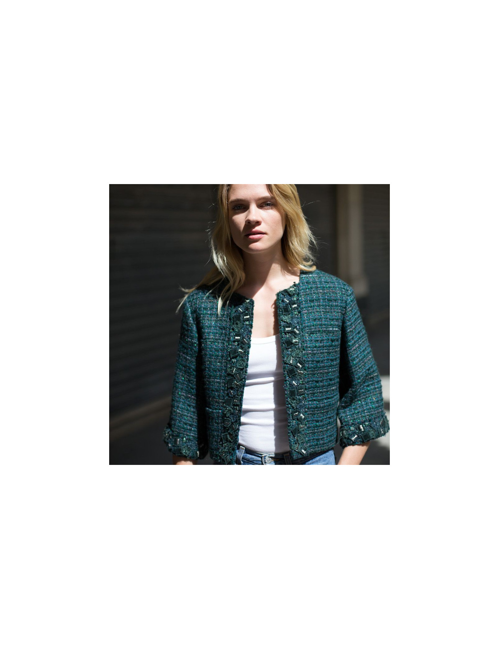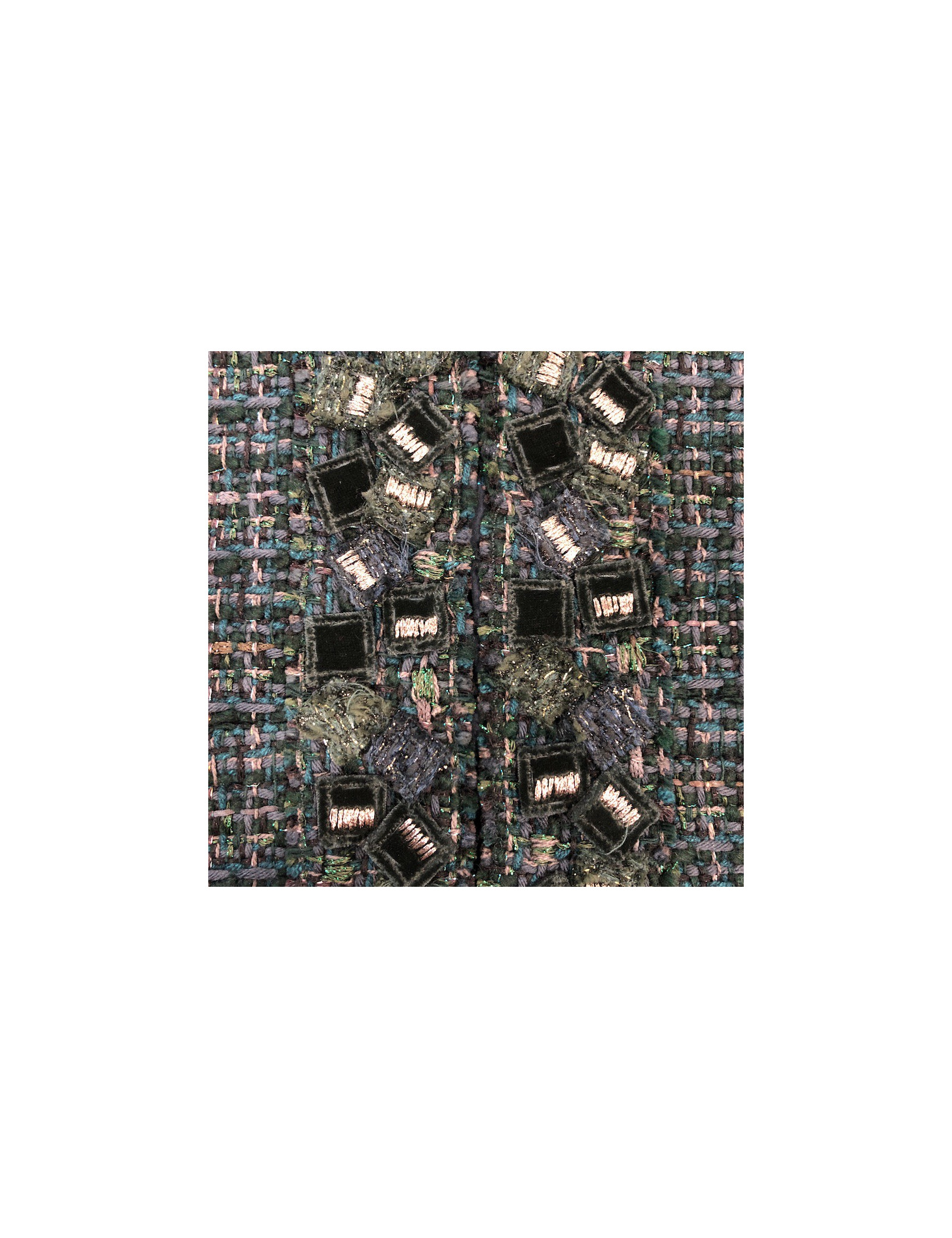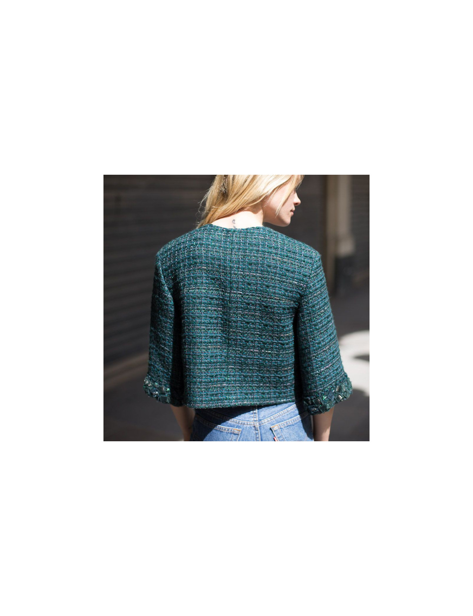 CHANEL T36 blue and green tweed short jacket. It closes with four small invisible hooks. It is braided with two bands of small squares in velvet, bronze threads and green threads. Four patch pockets on the front of the jacket. With its three quarter wide sleeves, it gives a bolero effect. Monogram silk lining. On the bottom of the jacket, we find the essential little chain. The jacket is in very good condition.
